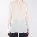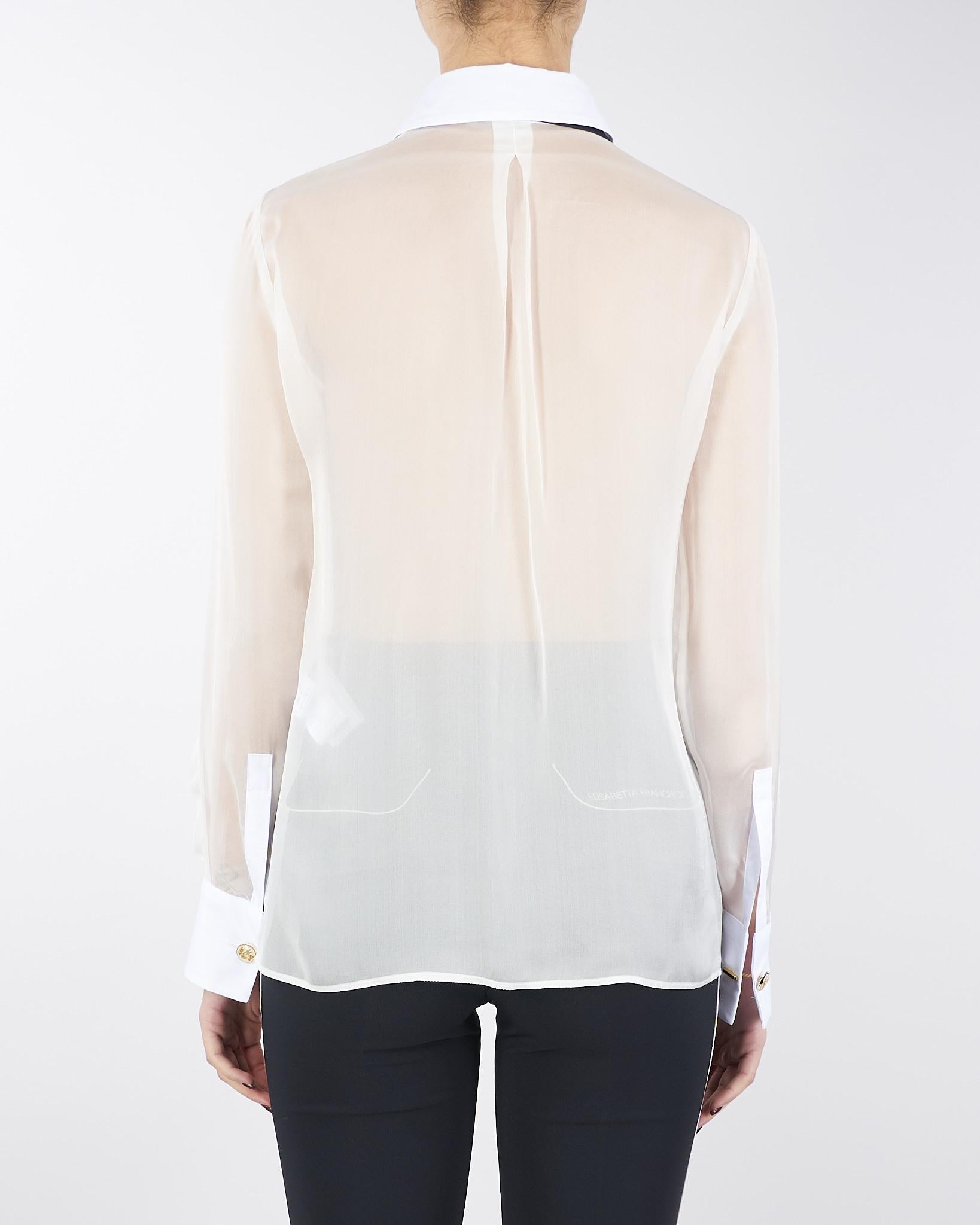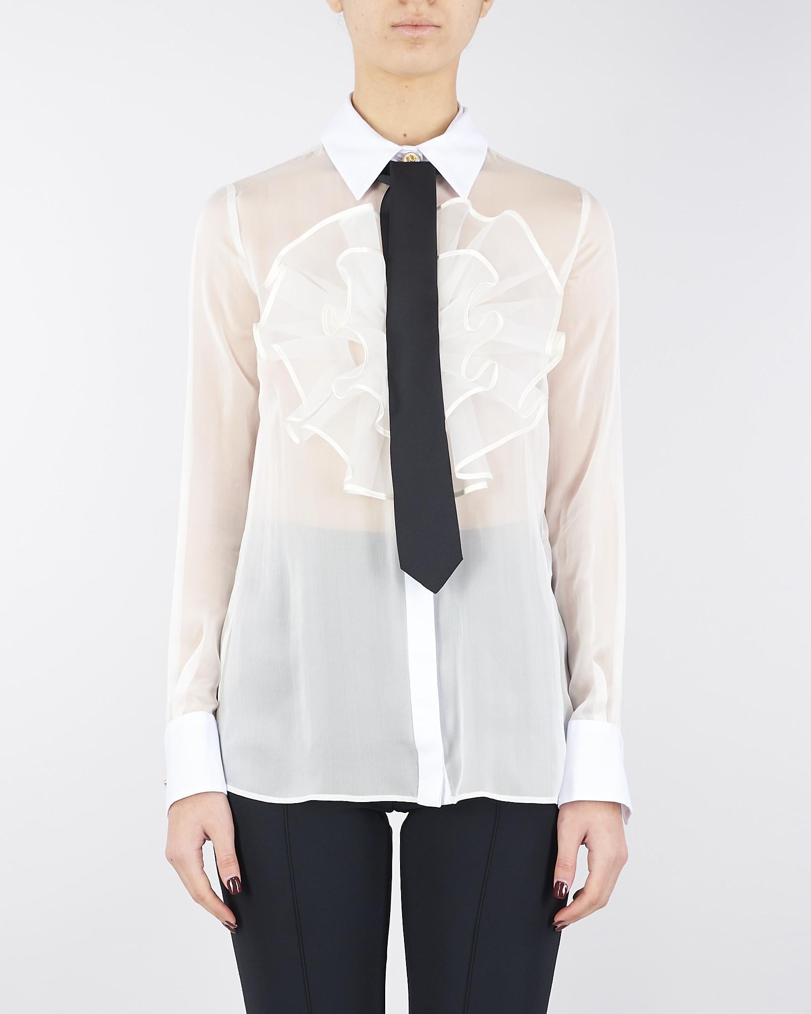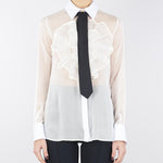 Camicia in voile di seta con maniche lunghe e colletto regolare. Il focus sono le ruches in organza che decorano il davanti insieme alla cravatta a contrasto. Un ultimo dettaglio di stile col primo bottone gioiello e i gemelli a decorare i polsi. Vestibilità slim.