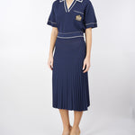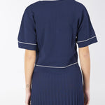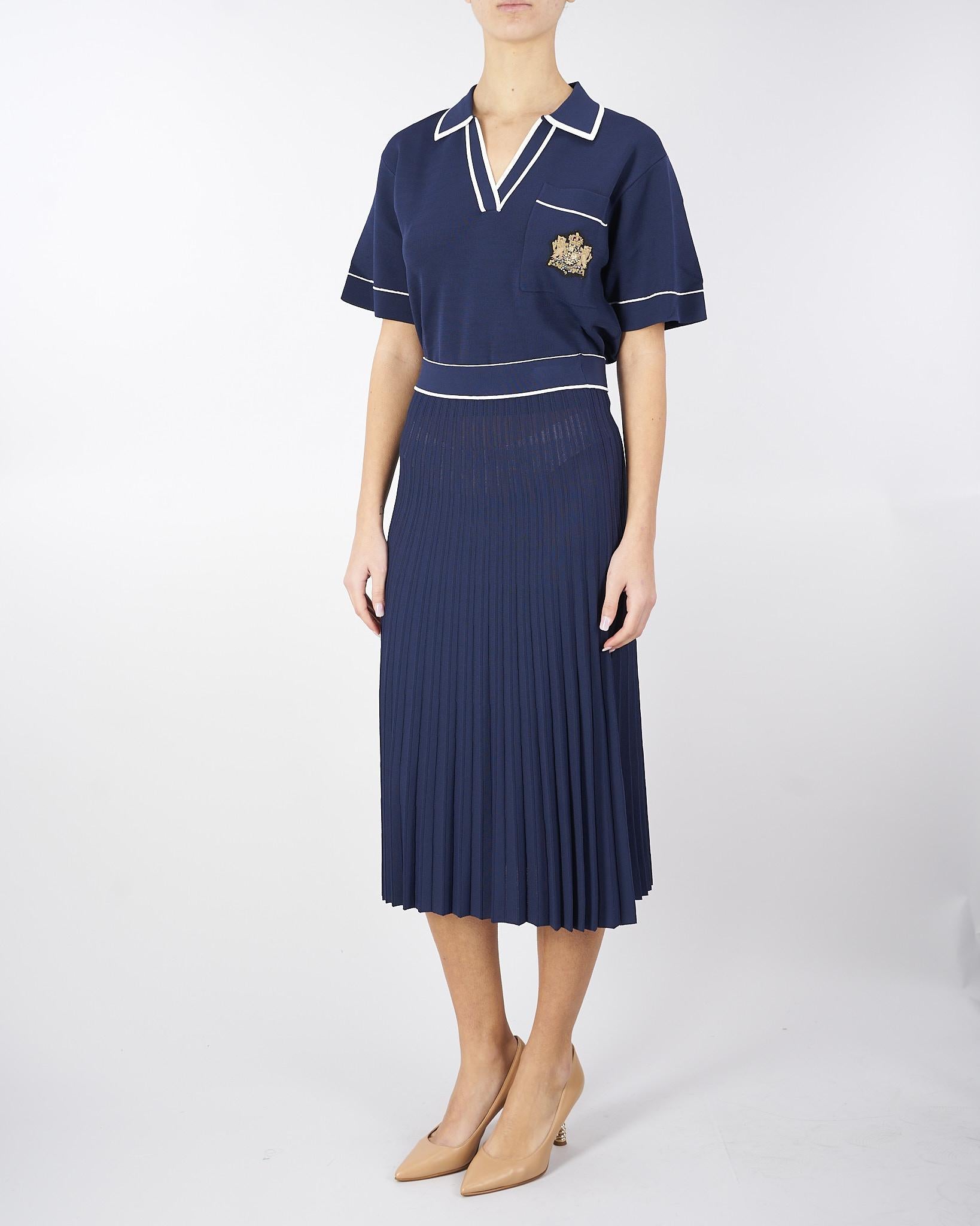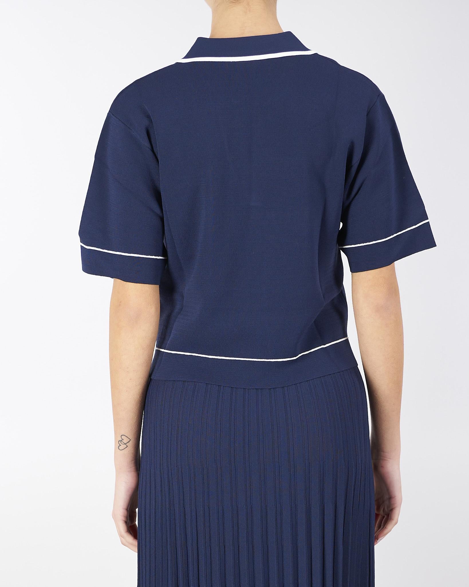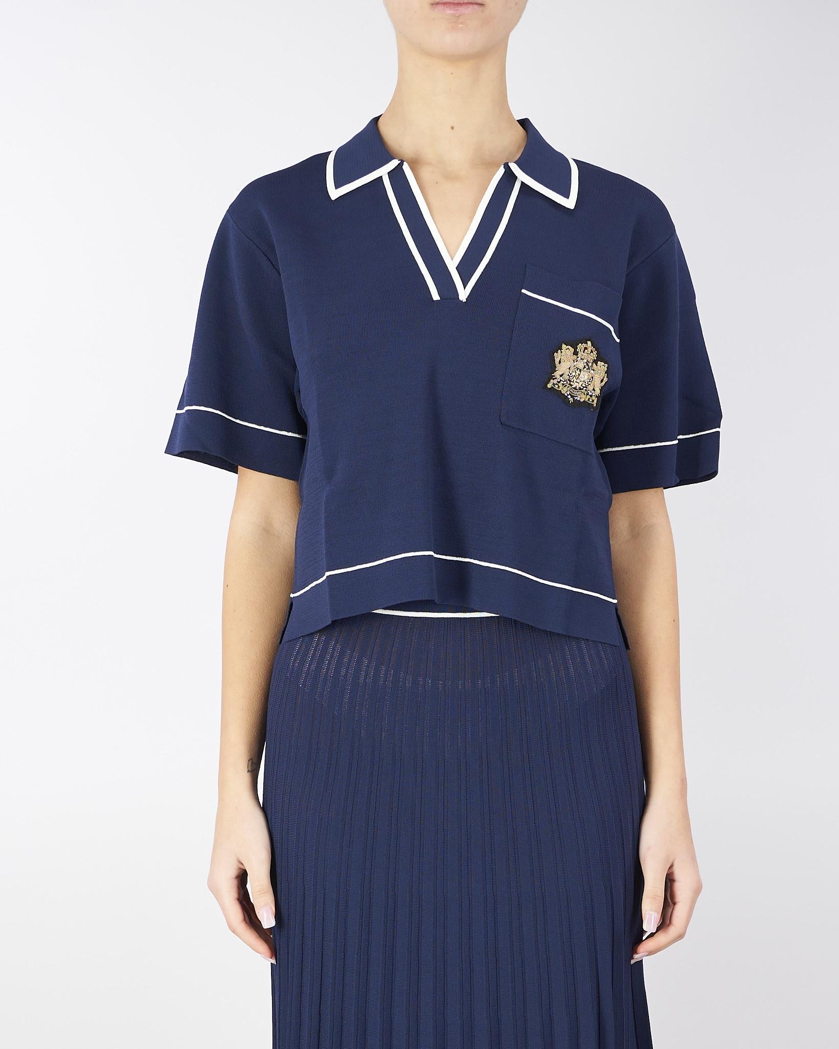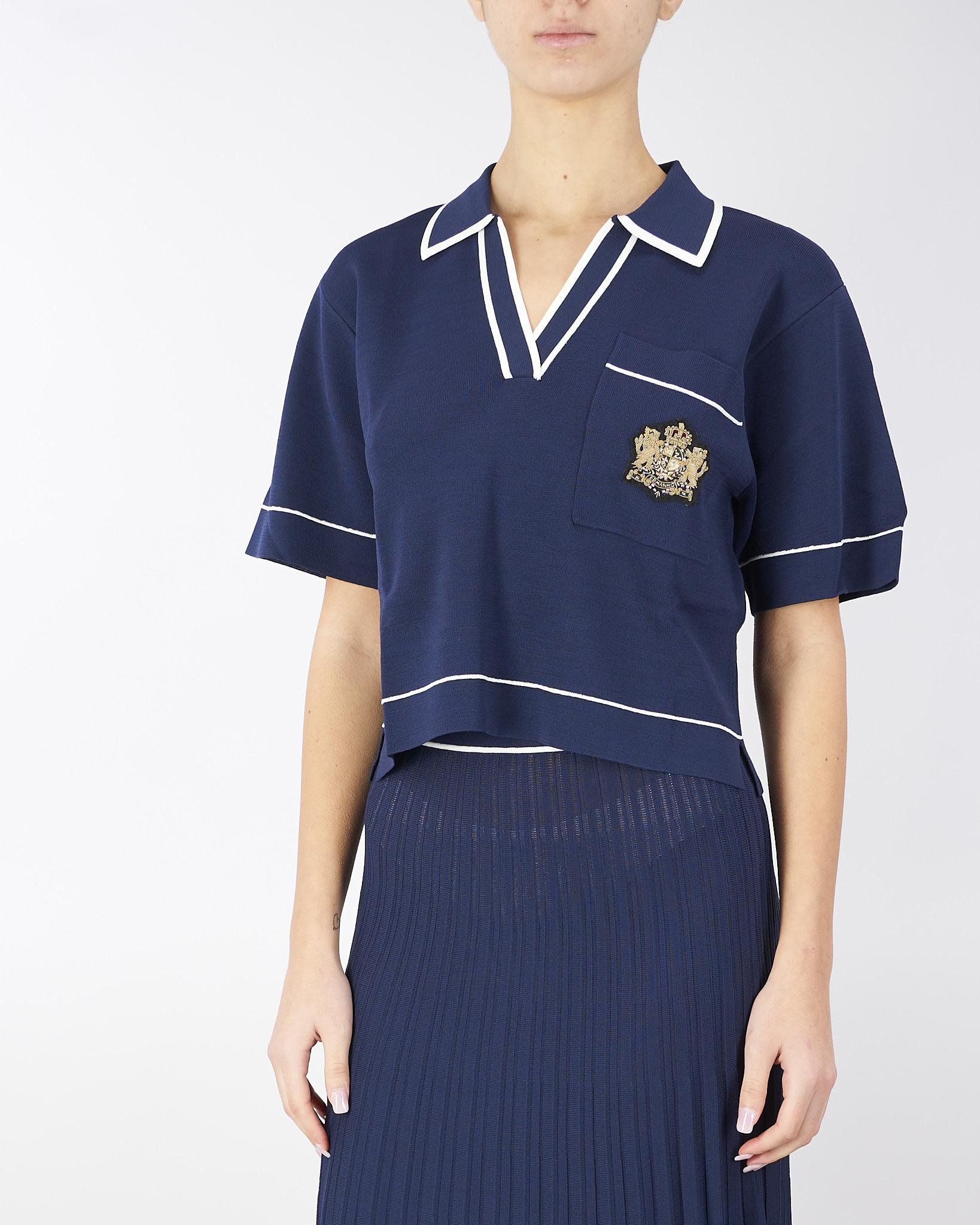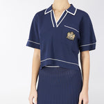 Polo di maglia di viscosa con profili e piping off white in contrasto. Taschino con stemma araldico oro con logo. Linea boxy, morbida con spacchetti al fondo.