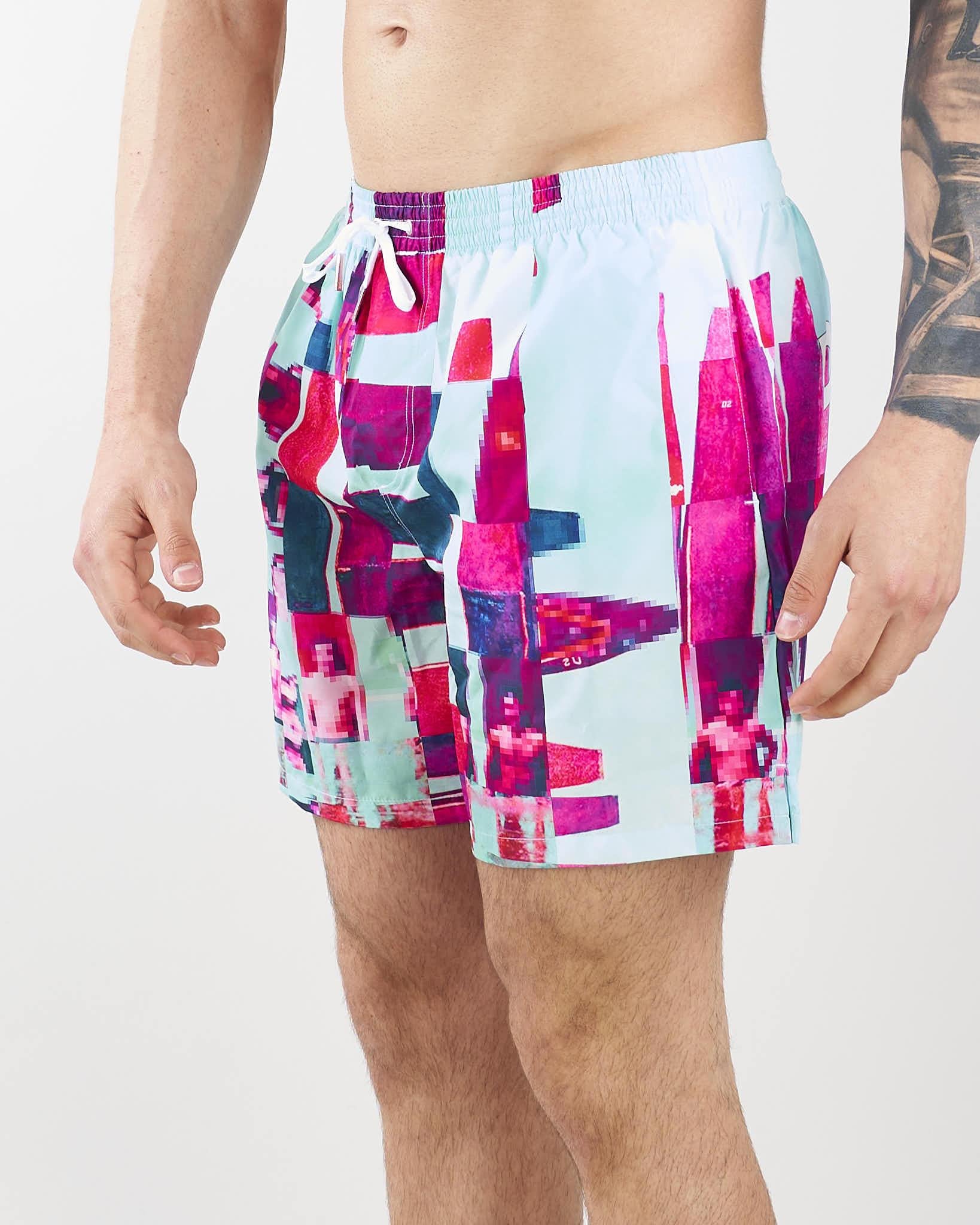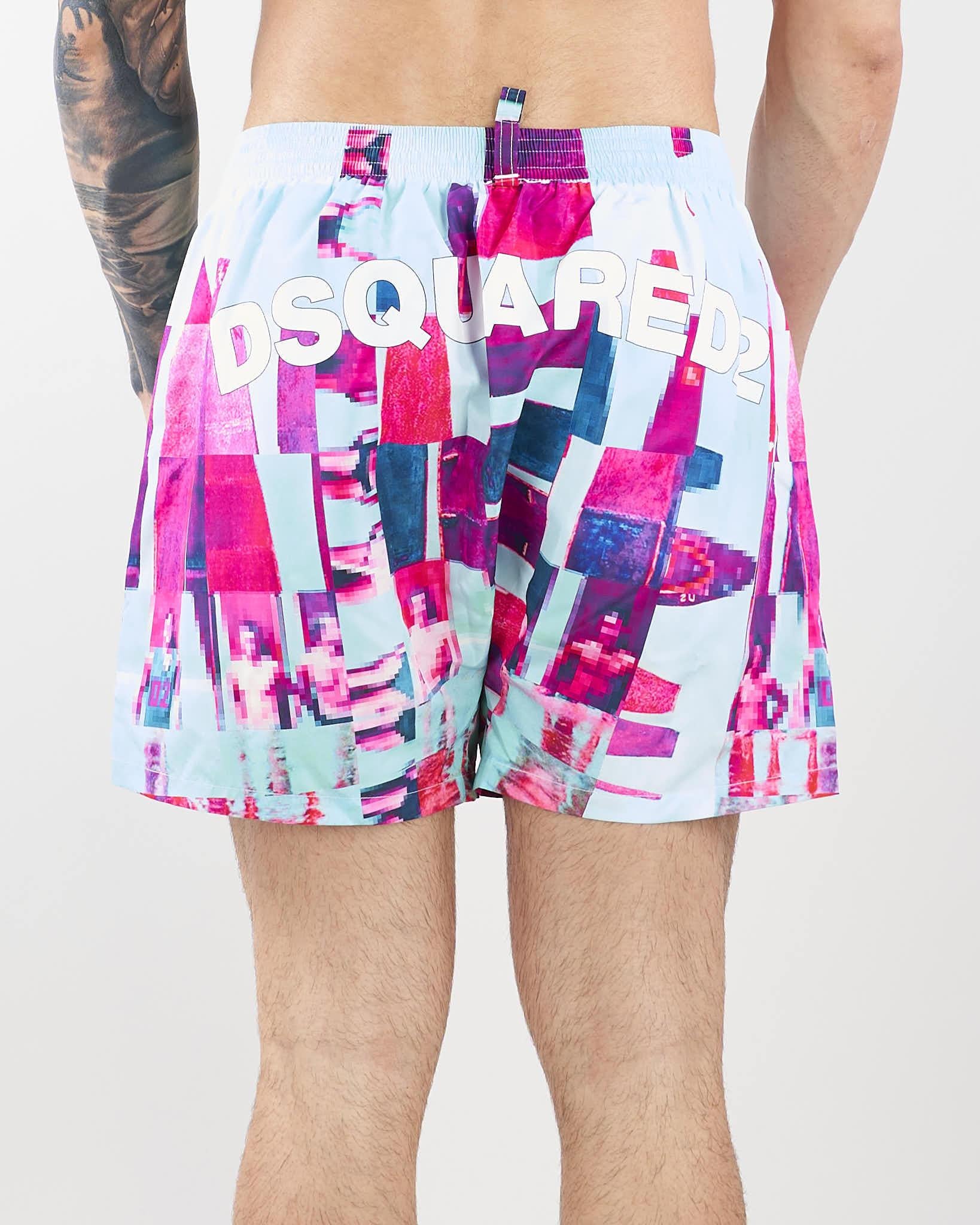 Distinguiti sulla spiaggia in questi accattivanti boxer midi D2 Surf. Lavorato in tessuto tinta unita con una stampa astratta colorata. Presenta una lunghezza a metà coscia, una chiusura con cordino a contrasto e un logo Dsquared2 nella parte inferiore di una gamba. Indossare con un cappuccio D2 per vibrazioni estive fresche.