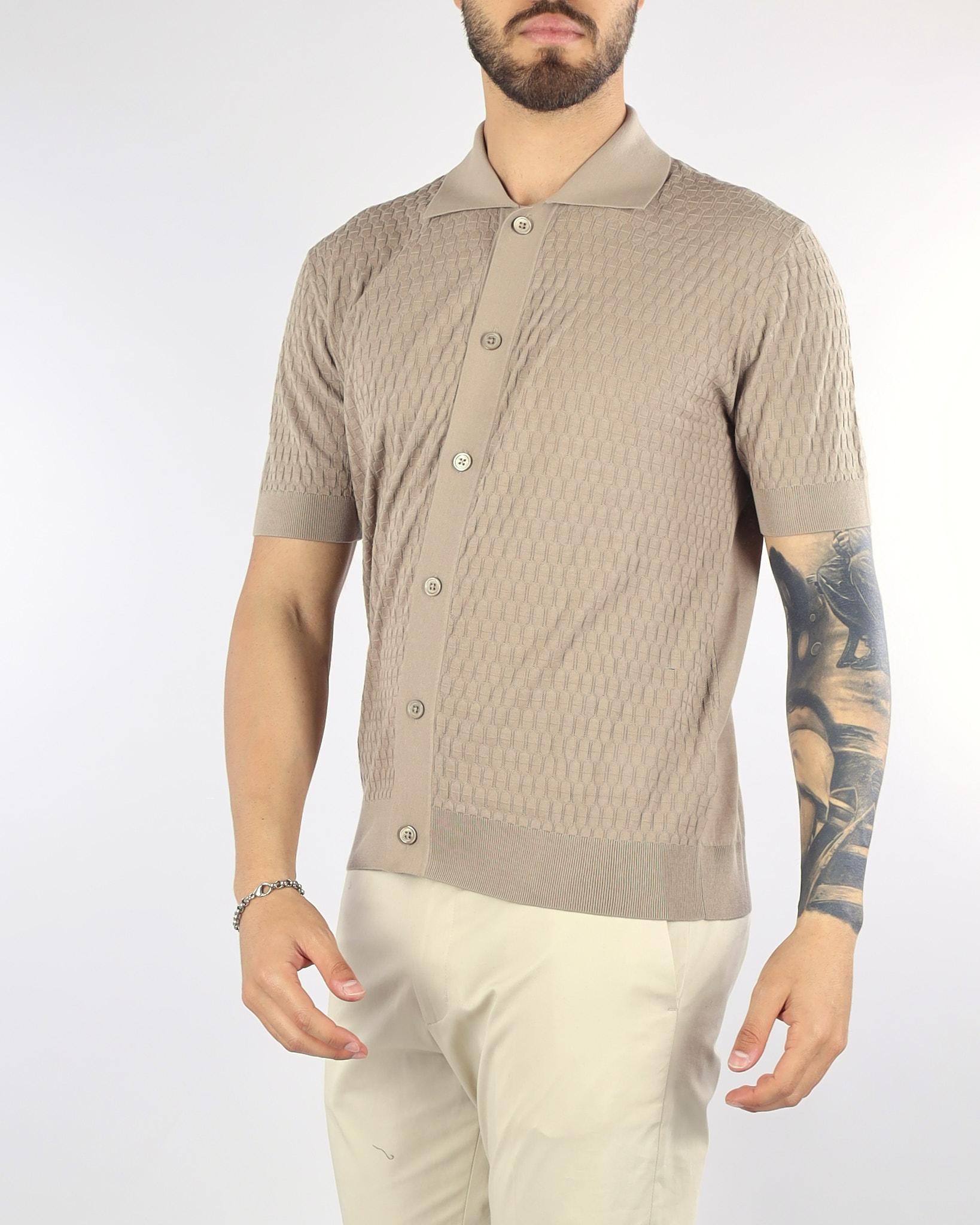 Semplicità e raffinatezza si fondono nella camicia in maglia a maniche corte, realizzata in puro cotone extrafine. Il delicato motivo testurizzato conferisce profondità al design, mentre il taglio essenziale e il colletto classico ne esaltano la versatilità. La tonalità gesso, luminosa e raffinata, aggiunge un tocco di eleganza senza tempo. Perfetta per outfit che richiedono un equilibrio tra comfort e stile.