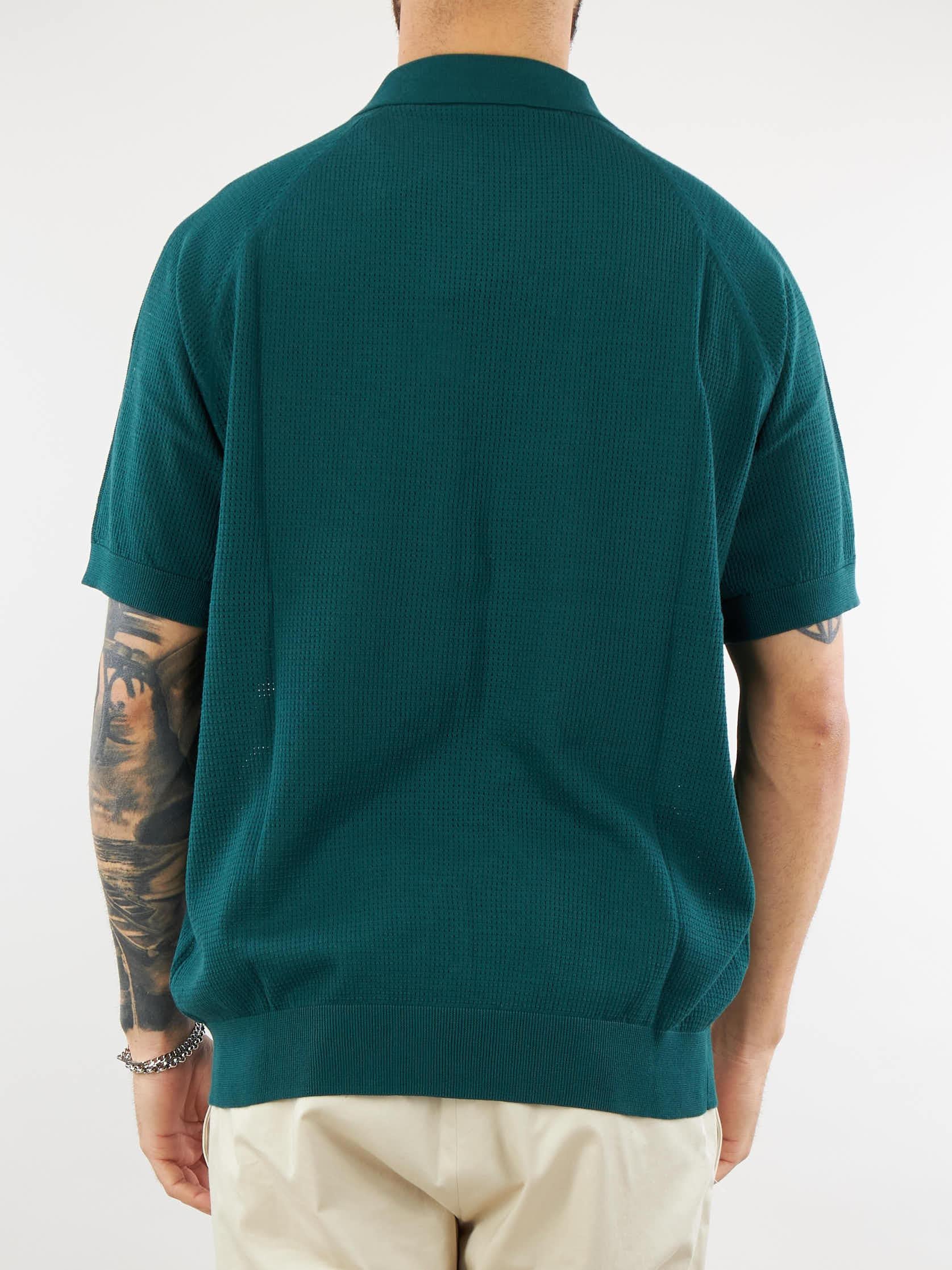 Perfetta per creare look raffinati e versatili in ogni occasione, la polo in maglia a manica corta in cotone crepe extrafine è declinata nel colore moda SS24 verde malachite. Caratterizzata da una lavorazione a traforo che le dona un tocco sobrio, è un prezioso cenno di colore in armadio. Modello con colletto a 3 bottoni e maniche corte. Fondo e maniche a costine con elastico.
