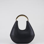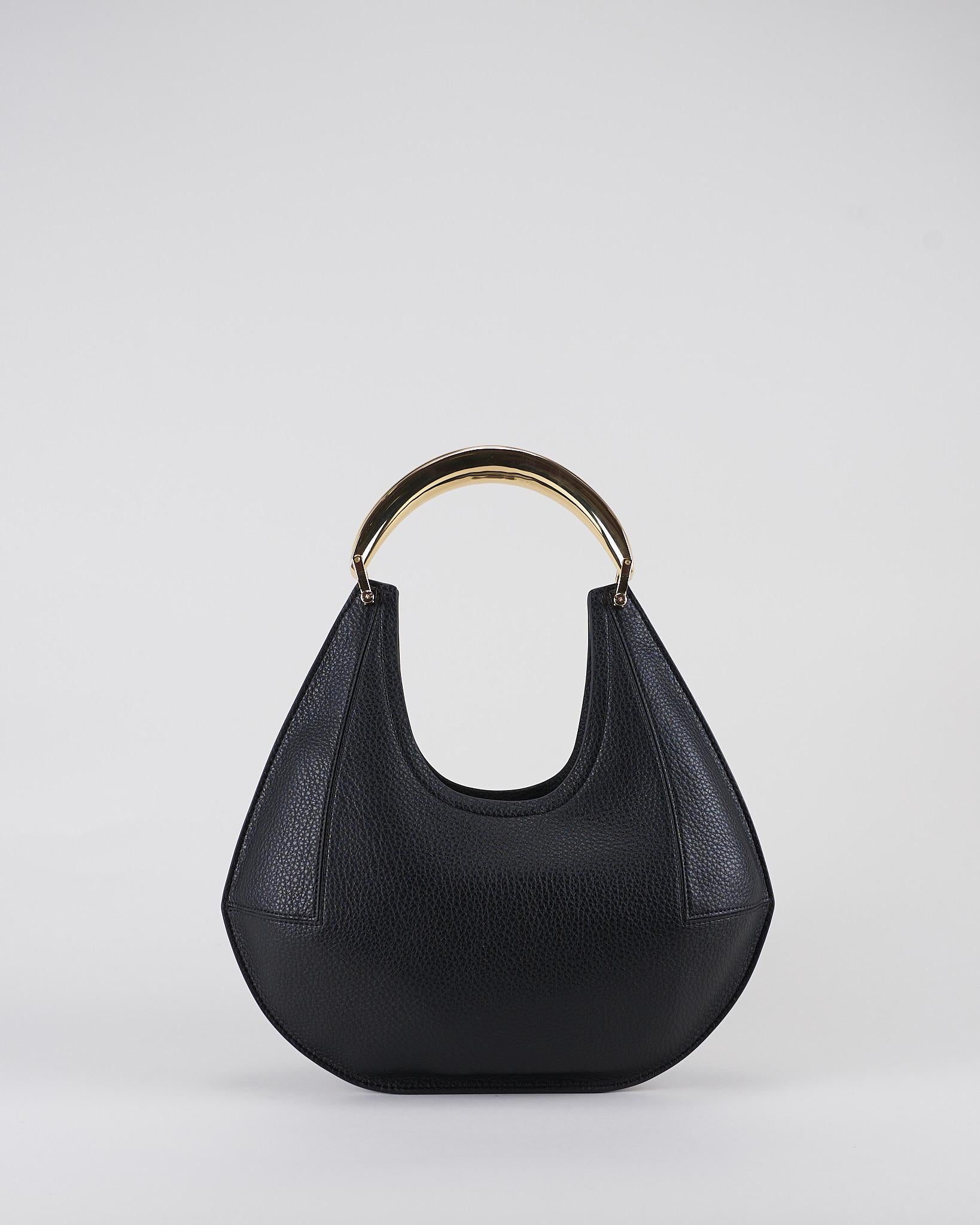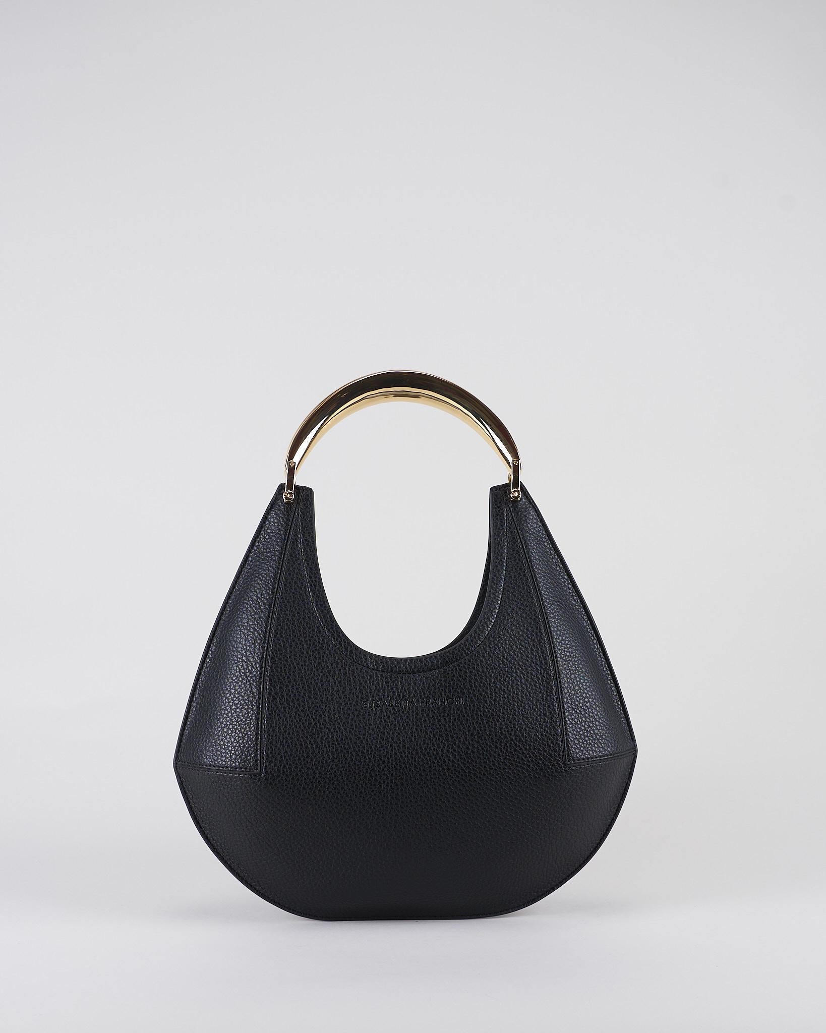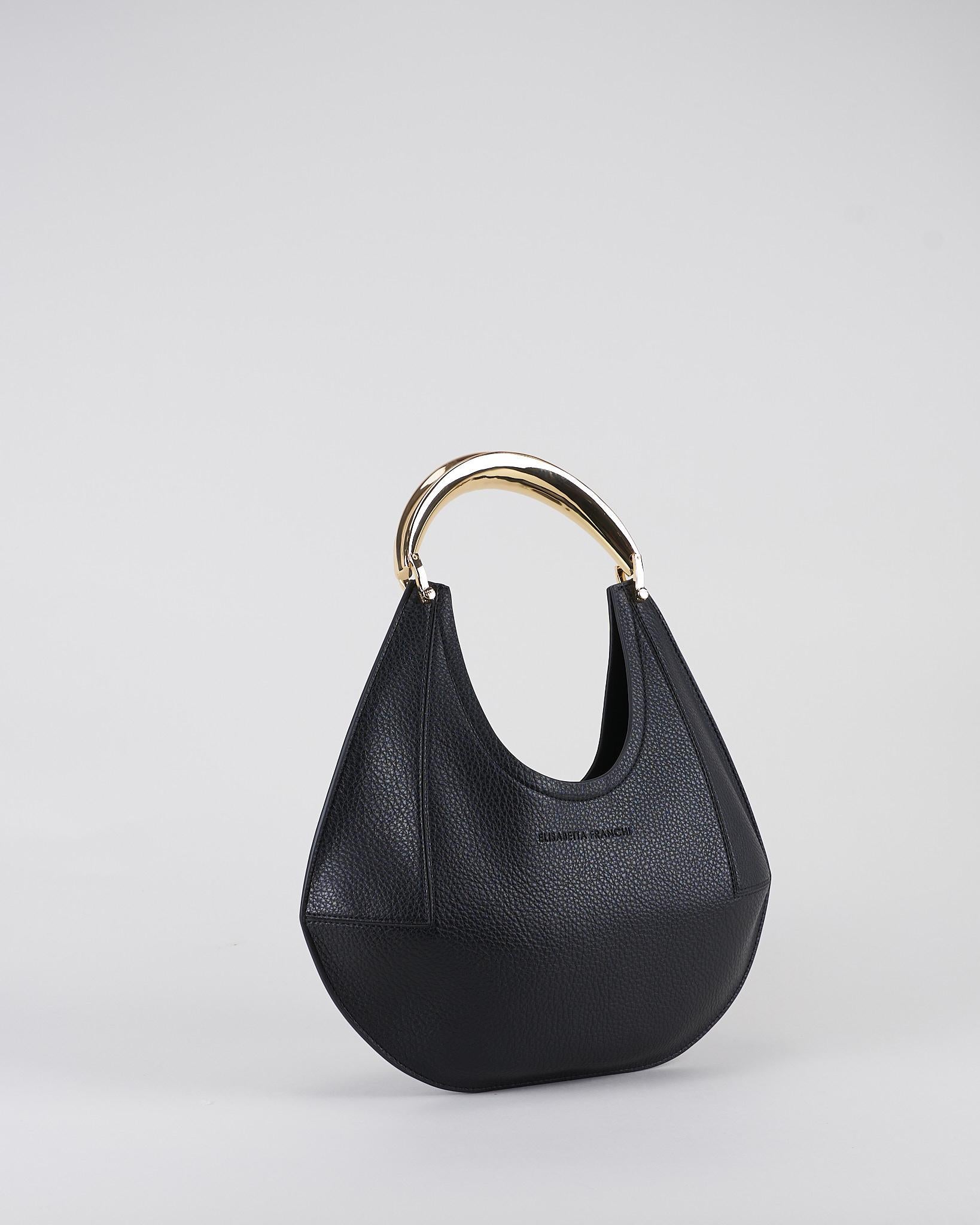 Borsa hobo piccola realizzata in materiale sintetico con effetto pelle. Si distingue per il manico gioiello in metallo dorato con un effetto texture che richiama una foglia e aggiunge una nota di luce.