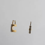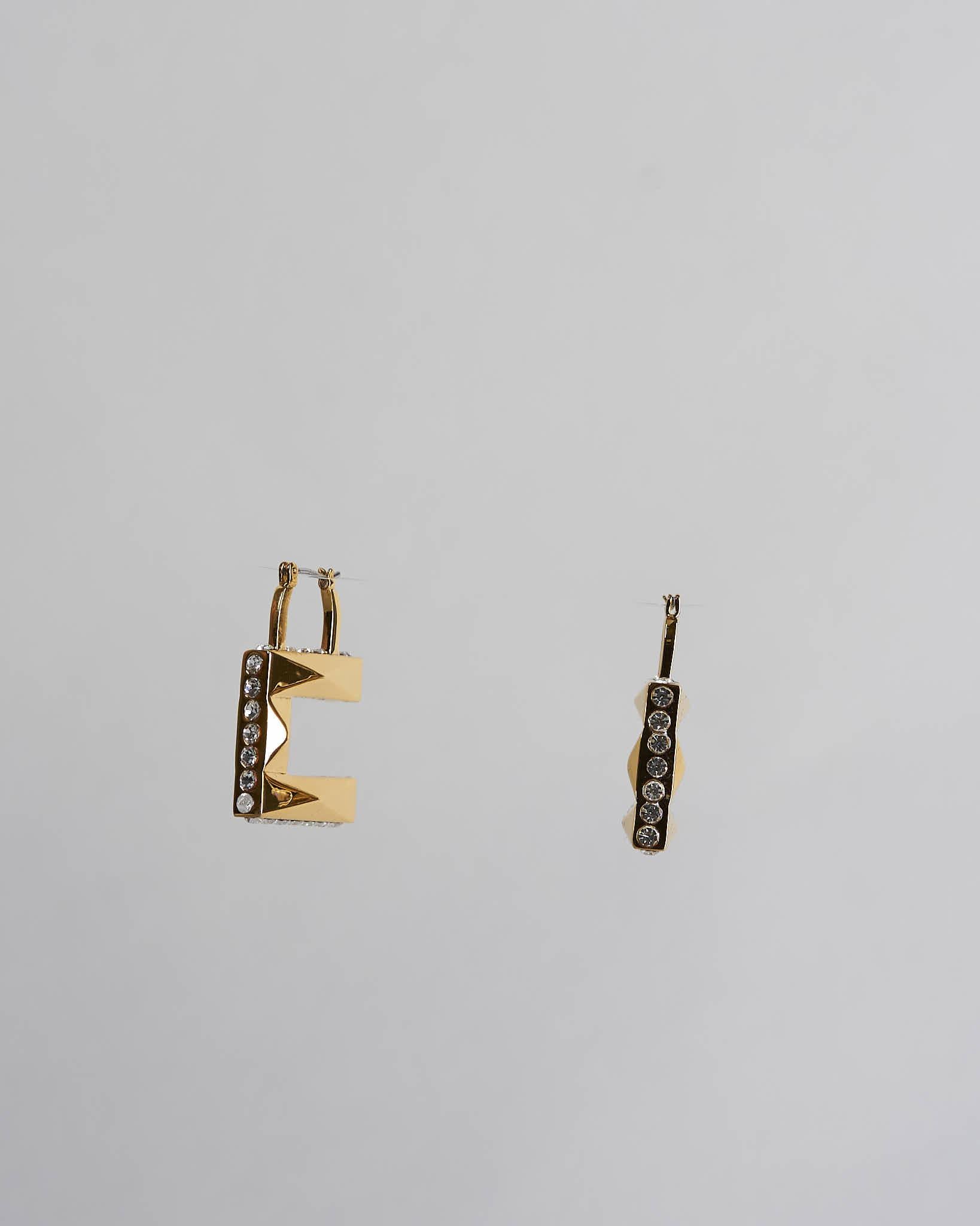 Orecchini logo con ago in metallo dorato e strass su profilo esterno con design geometrico sfaccettato.
