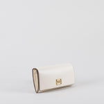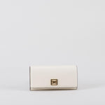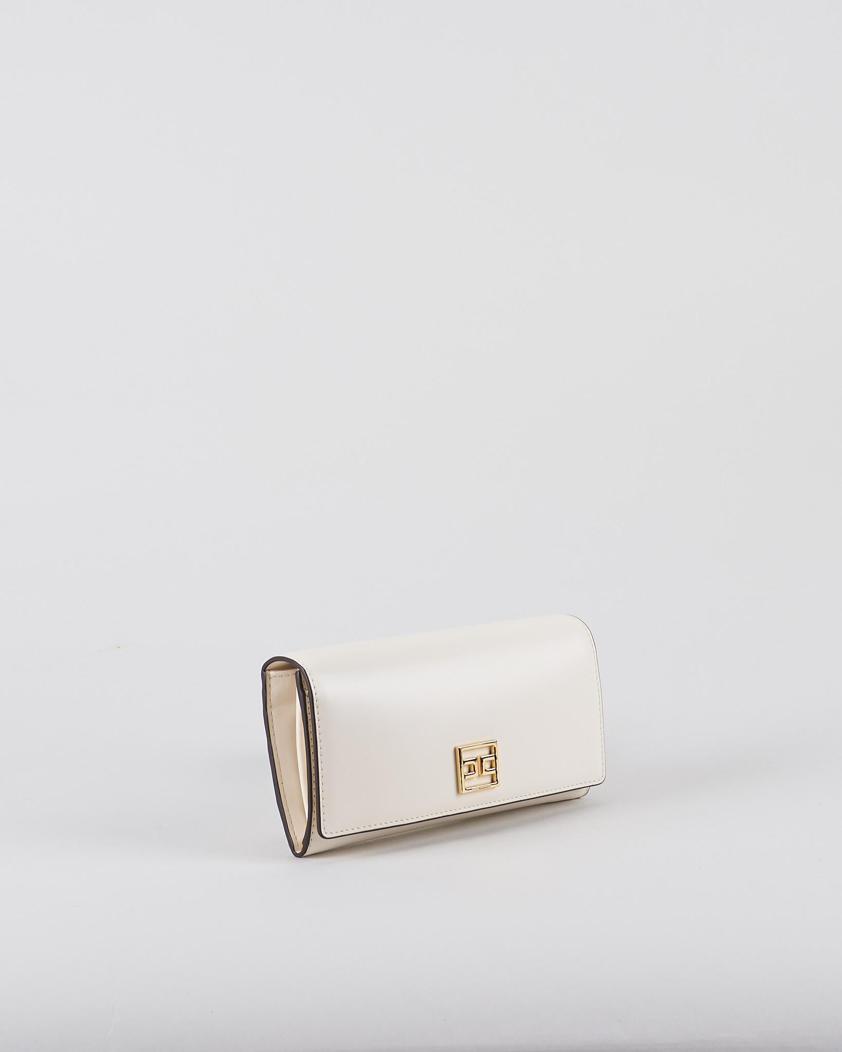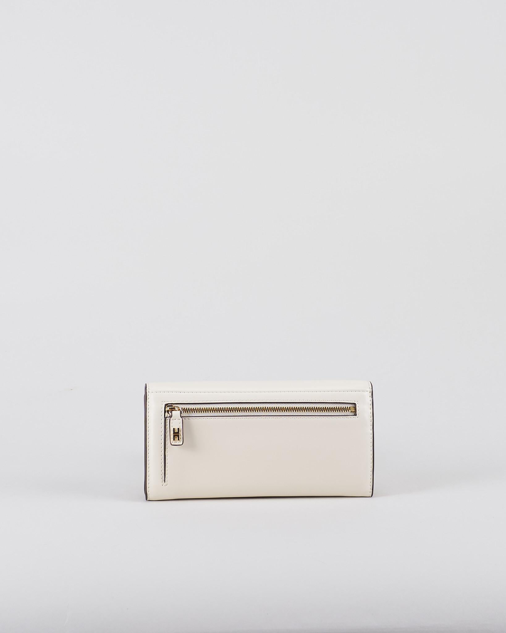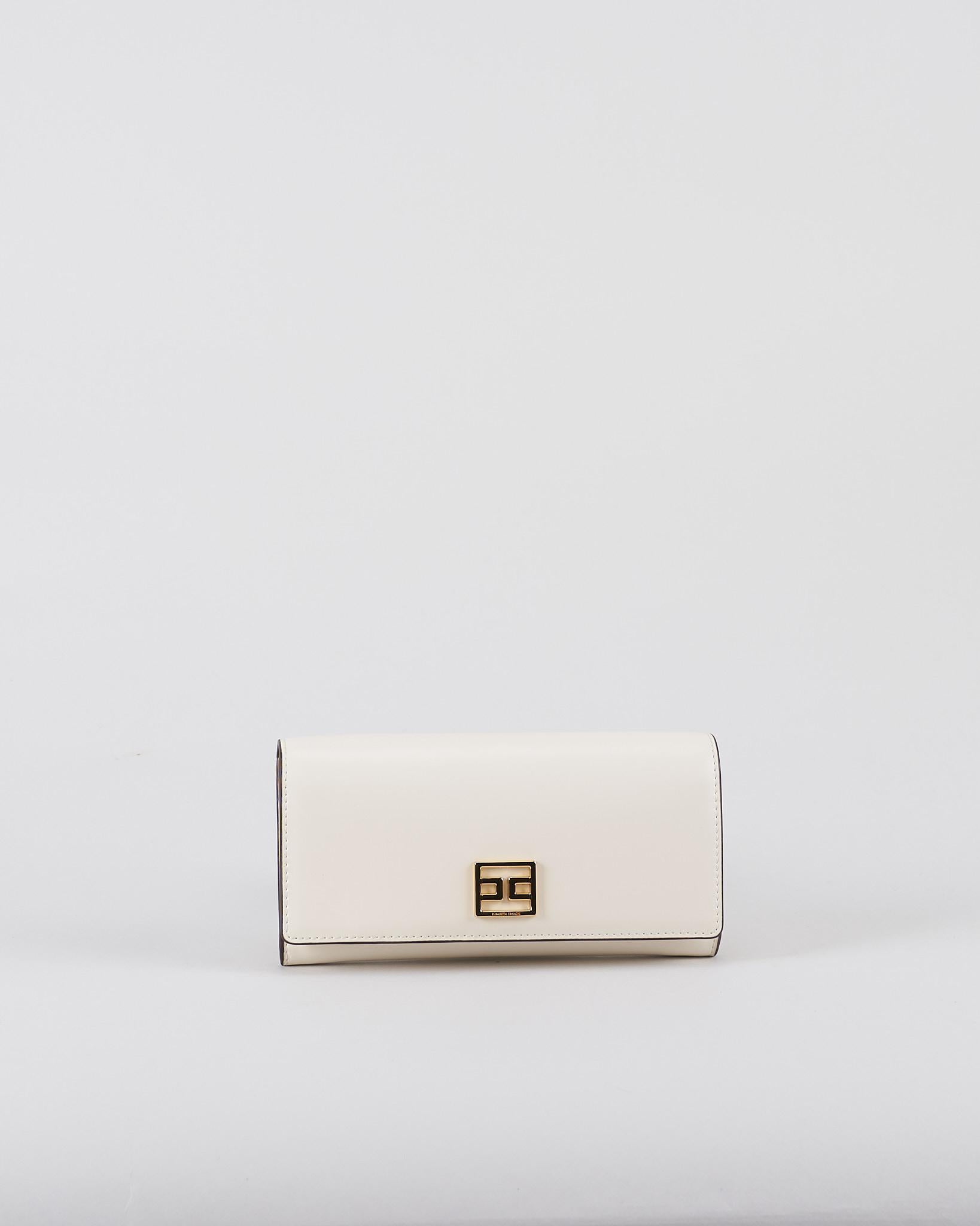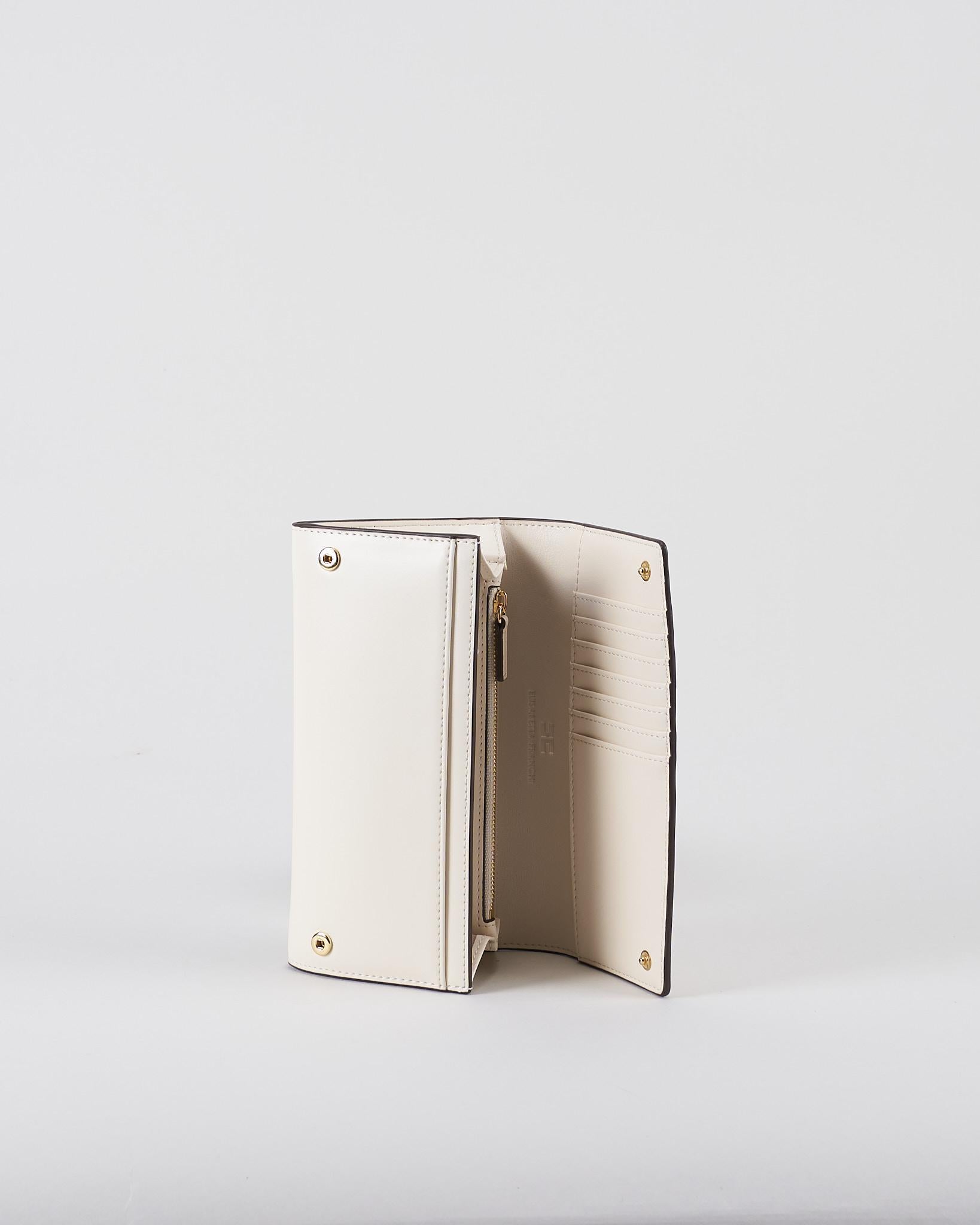 Portafoglio grande realizzato in materiale sintetico effetto pelle dalle texture lucide. Ha patta impreziosita dalla placca con logo in metallo dorato.