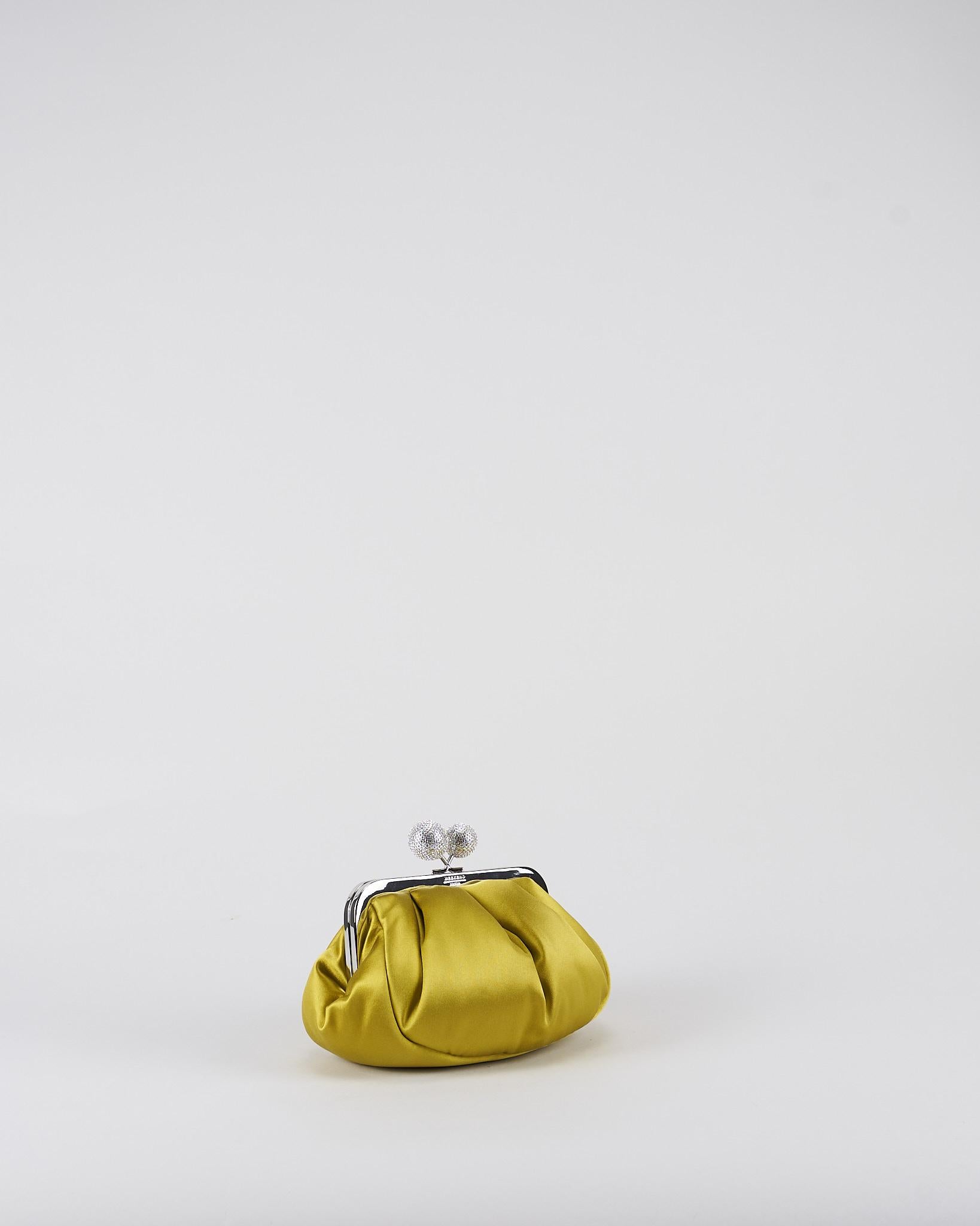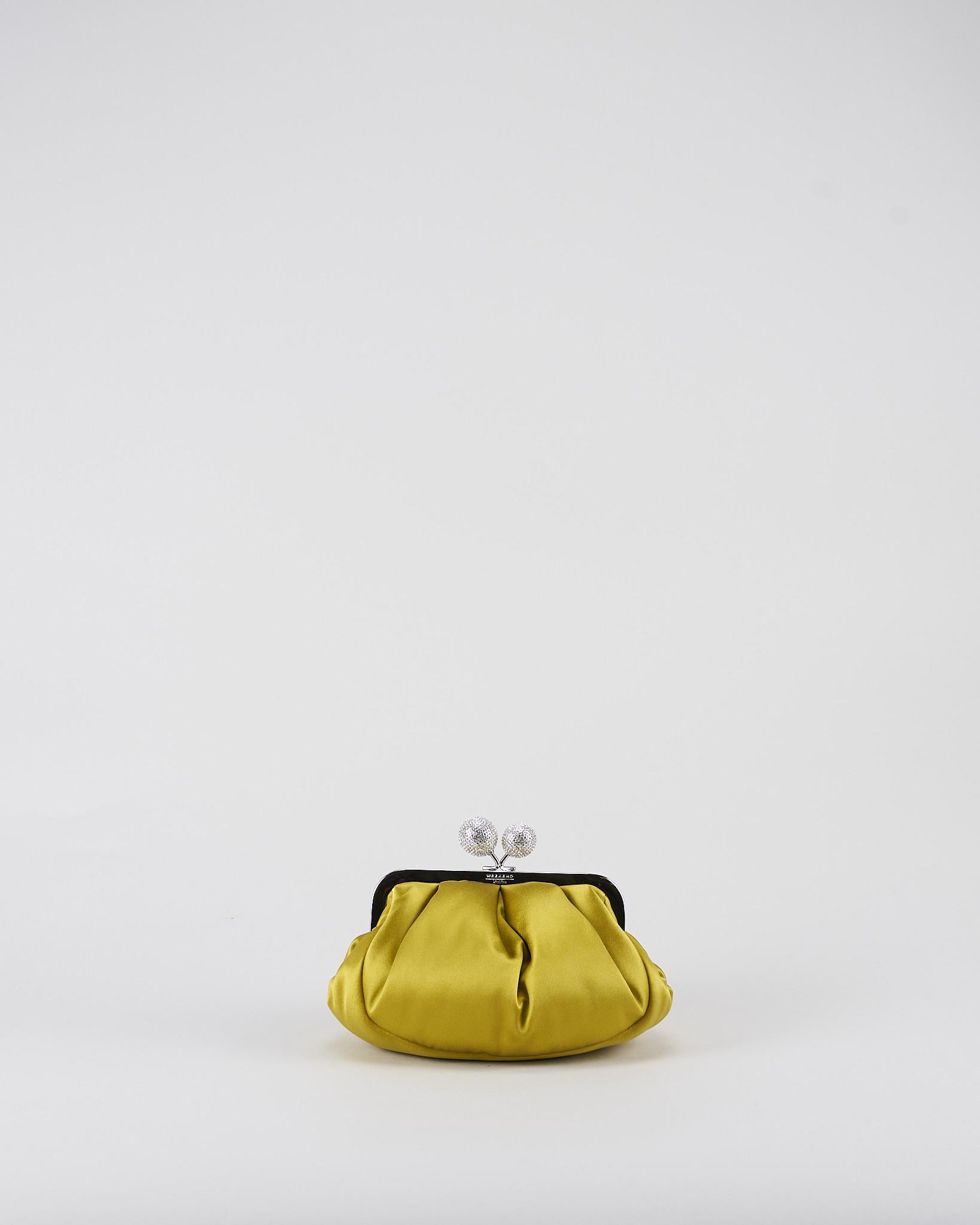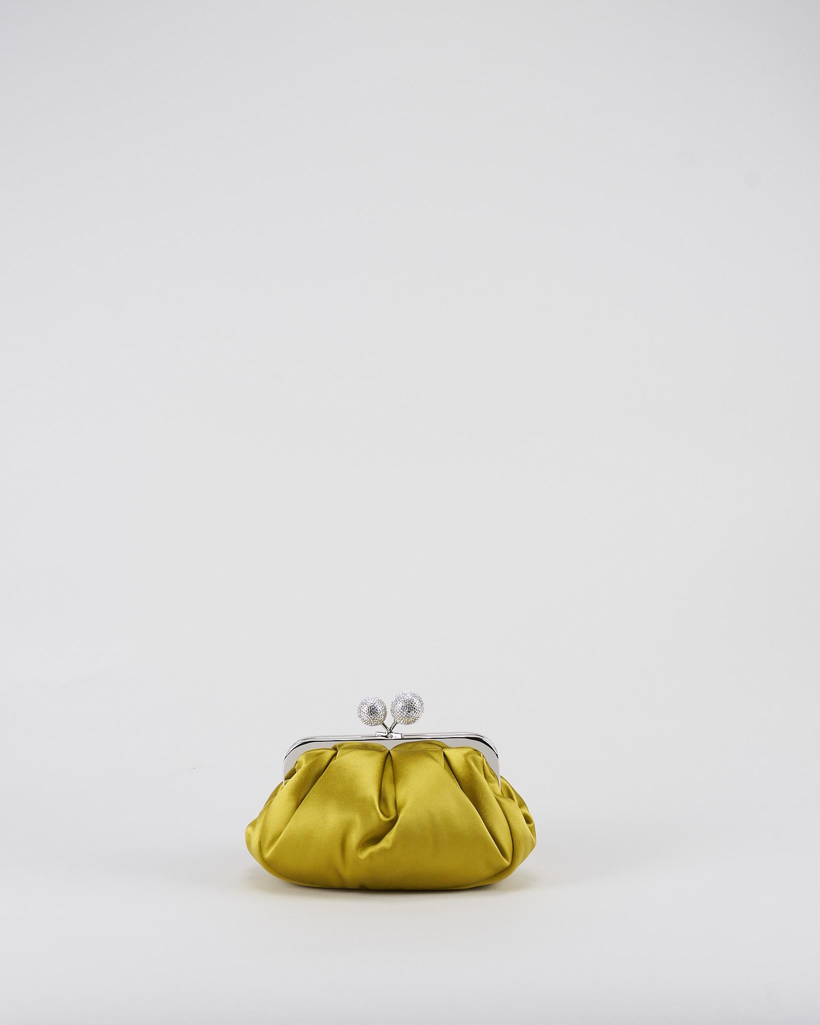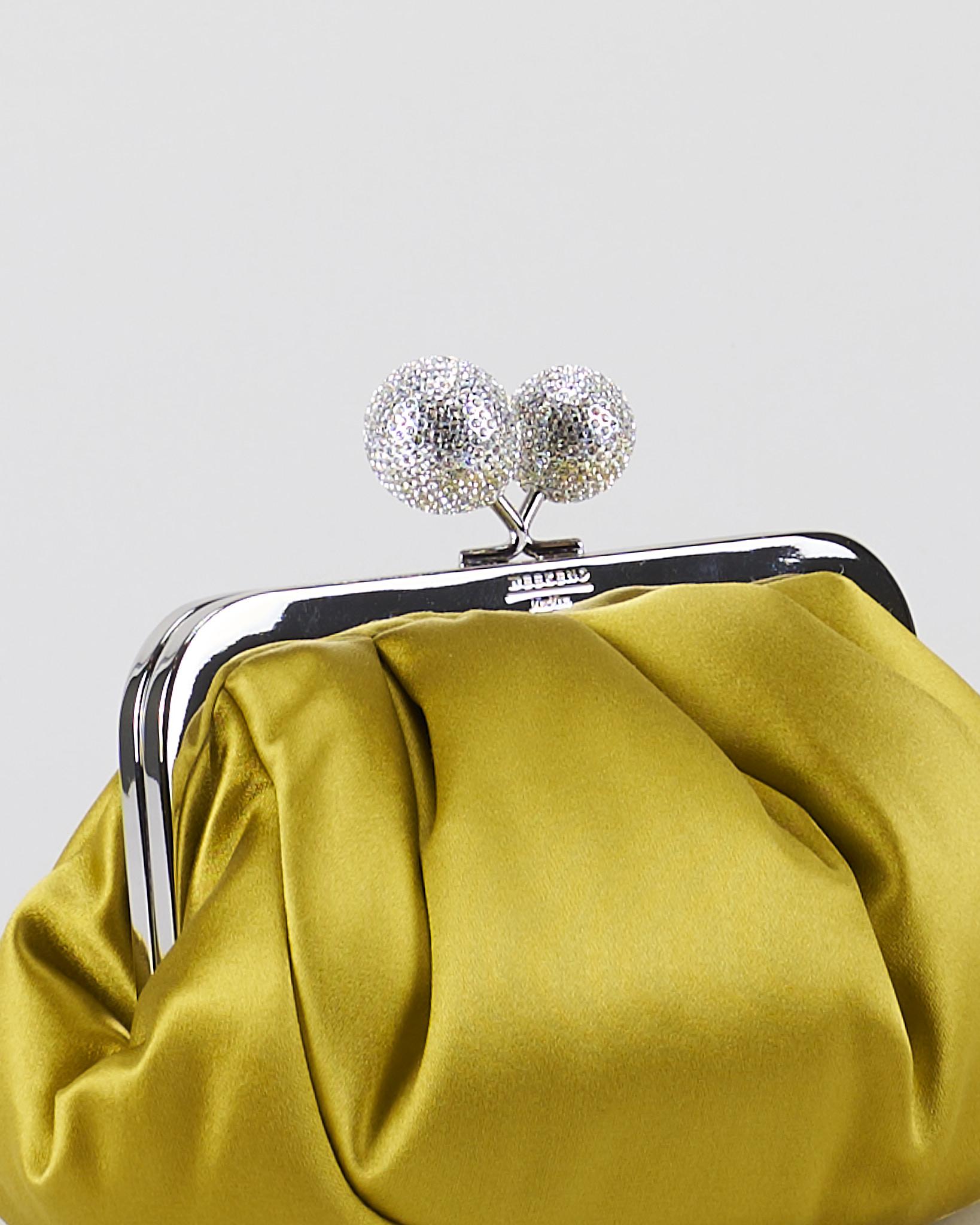 Pasticcino Bag Small, la super clutch per dare un tocco personale e affascinante al tuo stile quotidiano. Interamente realizzata in raso di viscosa e seta, è impreziosita da boules ricoperte con pavé di strass e interno in twill a righe con comoda tasca portaoggetti. La tracolla lunga rimovibile a catena, con spallaccio in pelle, permette di indossare la borsa cross body o a mano, per un outfit versatile e di tendenza. Iconica chiusura clutch e label personalizzata all'interno.