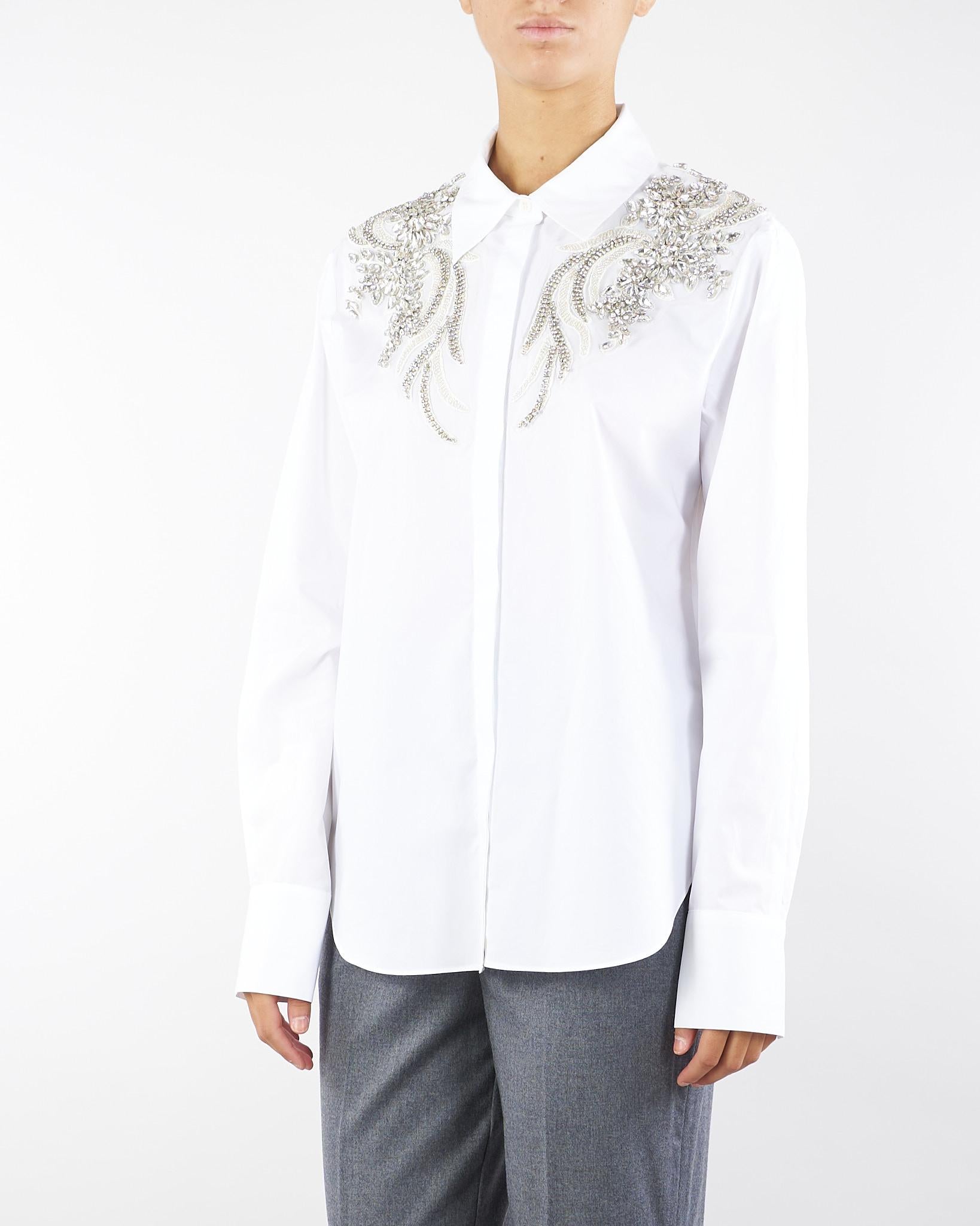 Camicia in tela paracadute di puro cotone con doppio patch di cristalli e perline a motivo floreale. Ha chiusura con bottoni nascosti, maniche lunghe con polsi e bottoni. Linea regular ideale per una special night out.