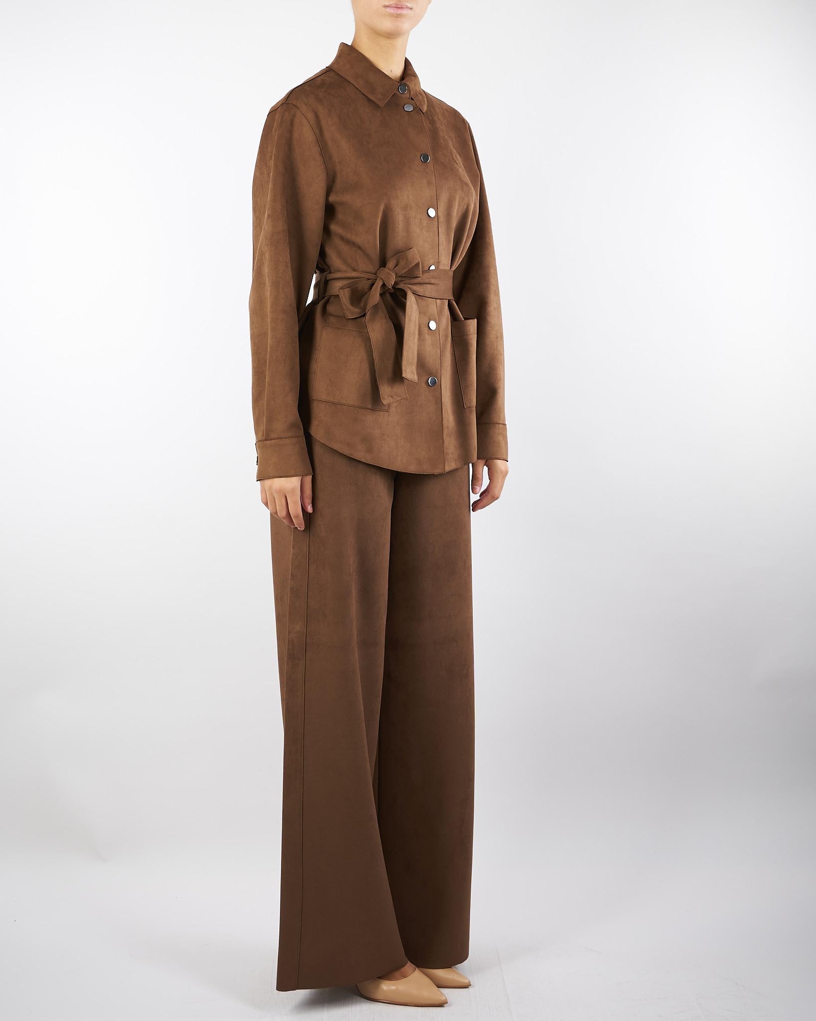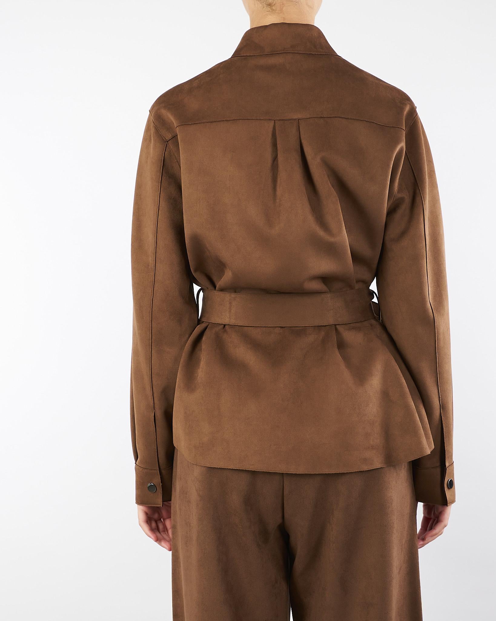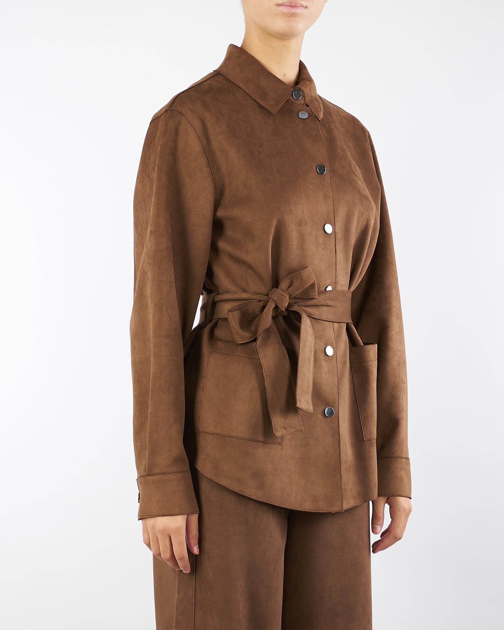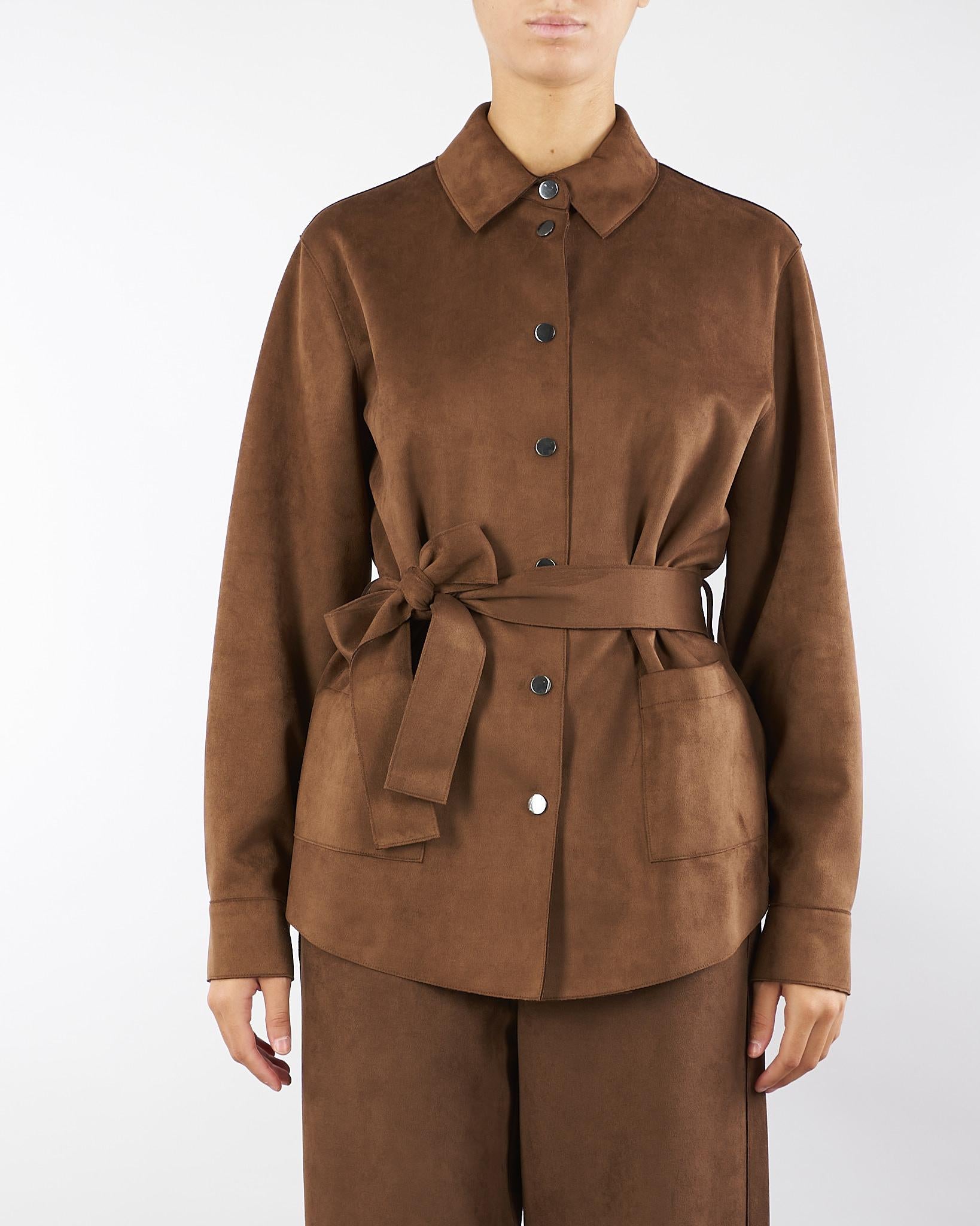 Versatile, la giacca camicia in jersey vellutato si indossa aperta sulla T-shirt o stretta in vita con la cintura, come parte di un completo non convenzionale o mixata in libertà. Jersey stretch con finish vellutato. Linee diritte e morbide. Tasche applicate sul davanti. Carré e cannoncino sul retro. Orlo arrotondato. Cintura coordinata da annodare. Chiusure con bottoni a pressione. Capo sfoderato. Gonna e pantaloni coordinati in collezione.