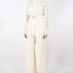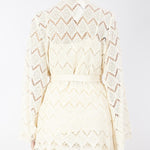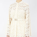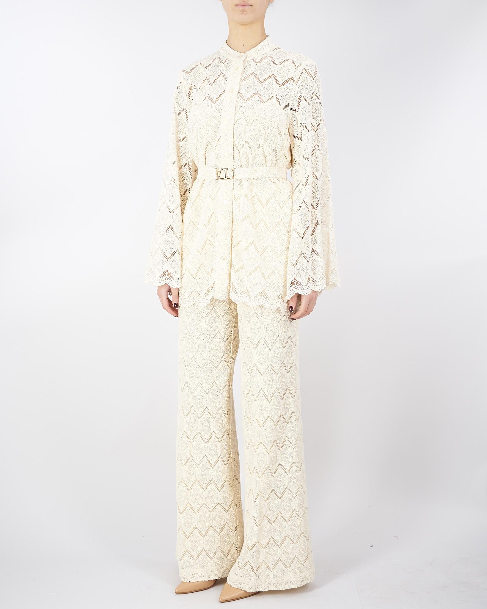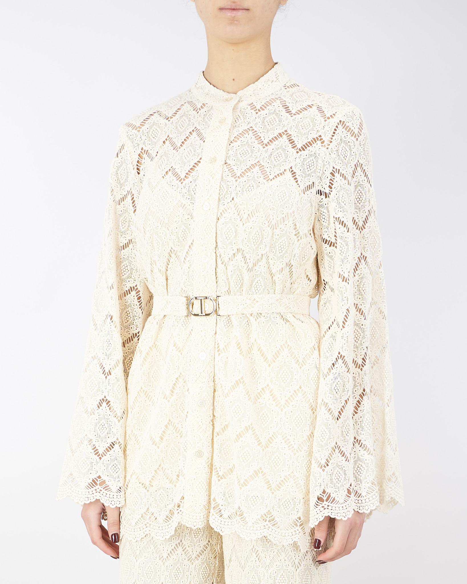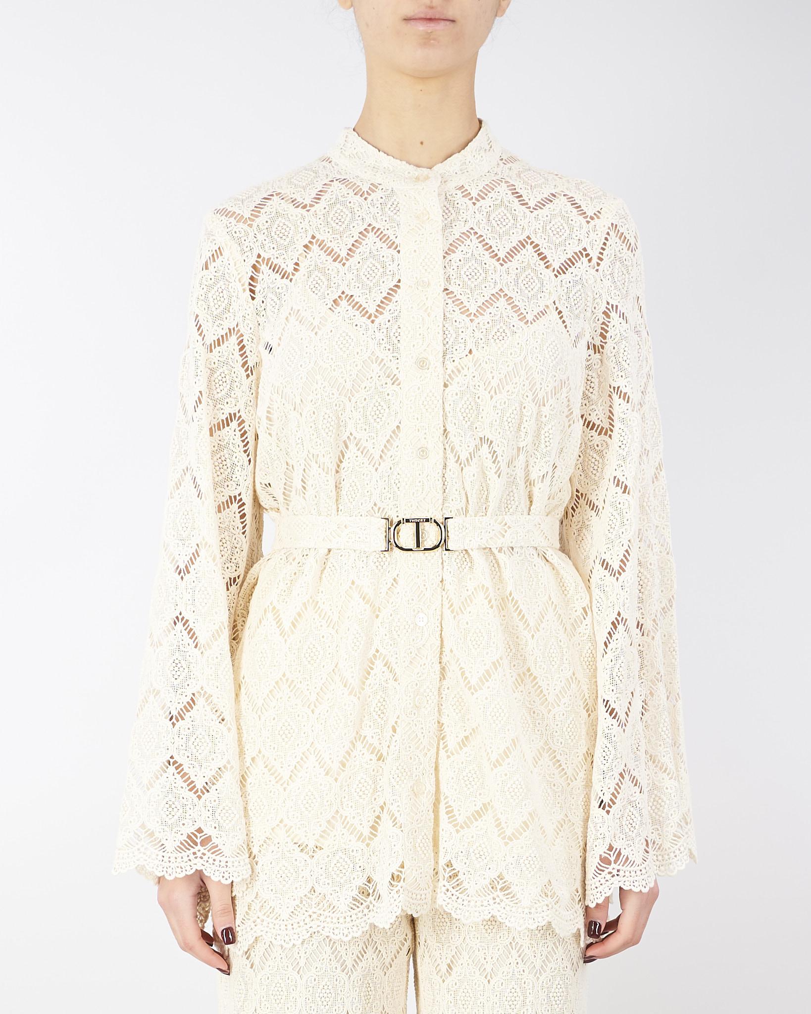 Maxi camicia in pizzo macramè con disegno geometrico e cintura rimovibile con elastico interno e fibbia Oval T dorato. Ha il collo alla coreana, la chiusura con bottoni, maniche lunghe ampie al fondo con smerlo, spacchi laterali, top rimovibile in mussola di cotone abbinato, linea dritta.