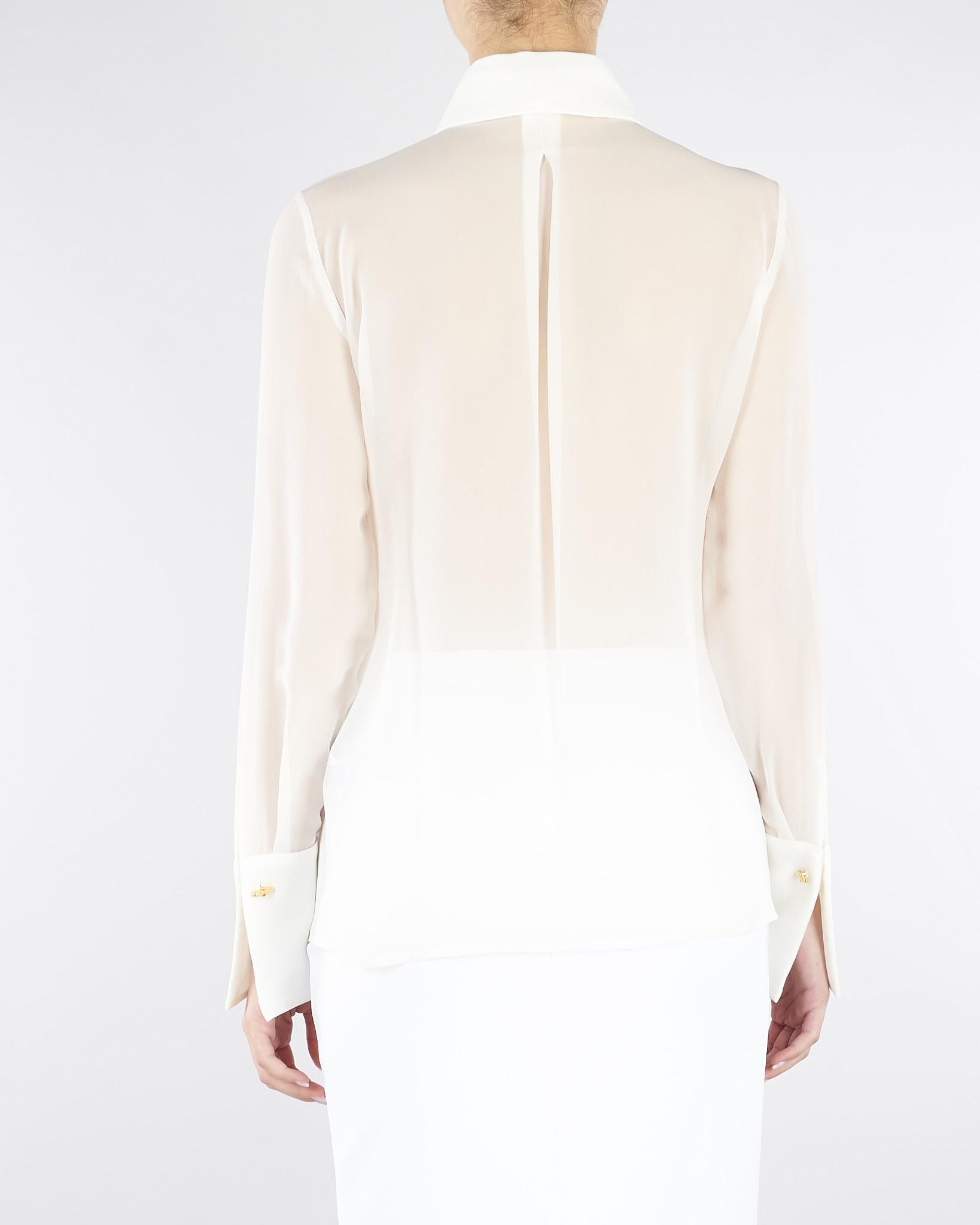 Camicia in georgette a maniche lunghe dalla vestibilità regular. Ha collo e polsi realizzati in crêpe per un raffinato contrasto di texture. La fusciacca al collo regala un elegante movimento. Dettagli di luce li danno i gemelli con logo sui polsi.
