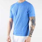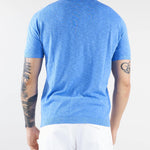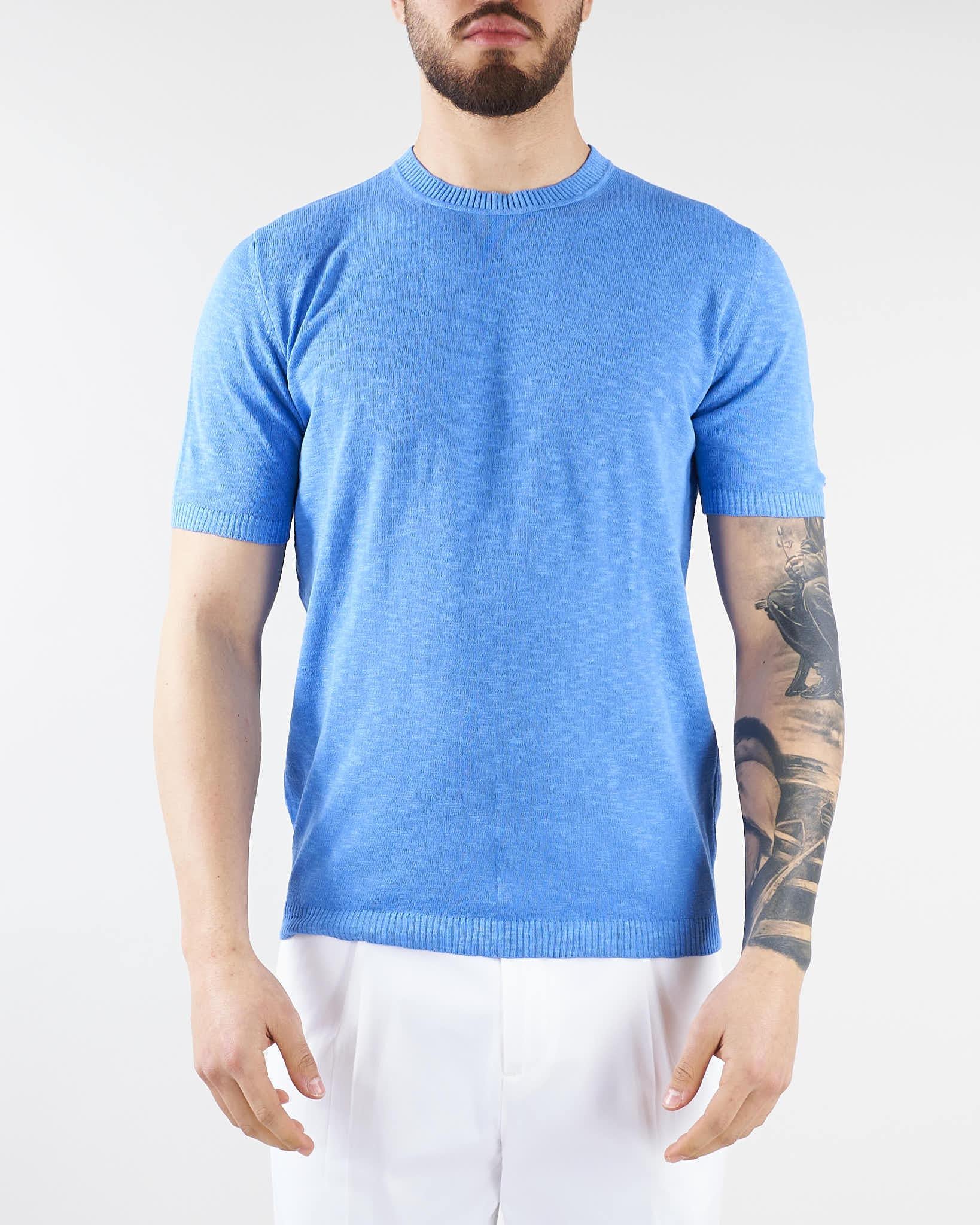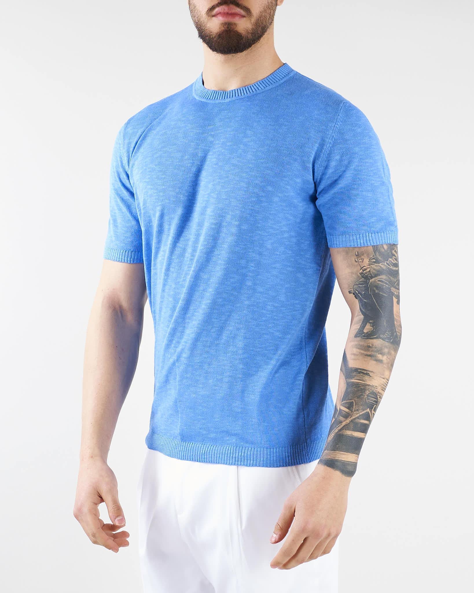 Maglia in filo. Modello girocollo con maniche corte, fondo e maniche a costine con elastico.
