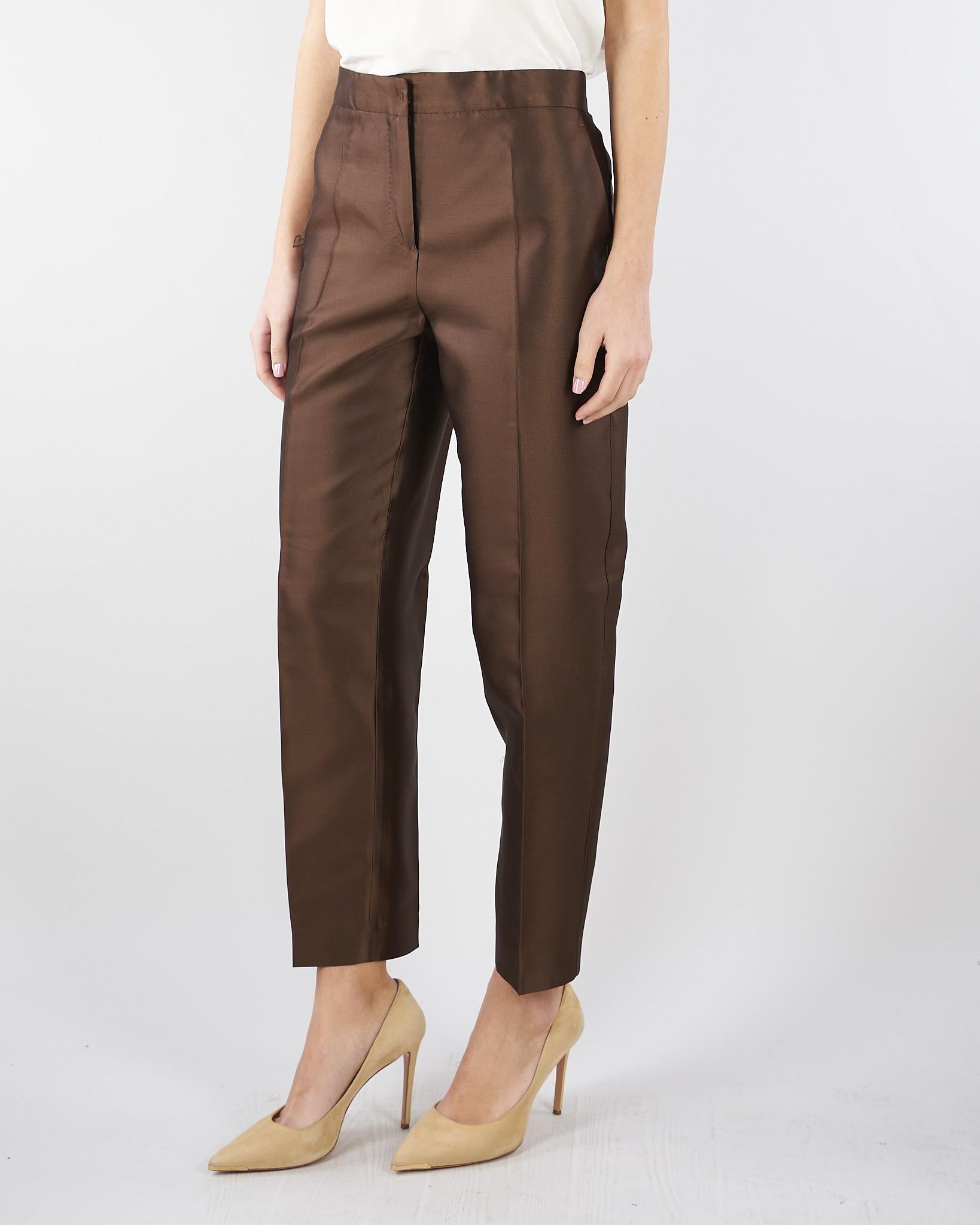 Pantalone alla caviglia, caratterizzato da una silhouette carrot fit con vita medio alta. Pantalone in shantung di cotone e seta. Linea leggermente chiusa al fondo. Chiusura con listino alto in vita, zip con patta e gancetto. Tasche alla francese sui fianchi. Pinces cucite in vita sul retro. Rifinito con puntino sartoriale e piega stirata.