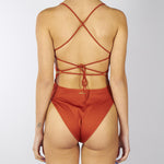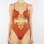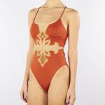 Originale e seducente il costume intero in lycra con inserto in rete ricamato con filo lamè oro. L'imbottitura è estraibile e i lacci si intrecciano sulla schiena creano incroci sexy.