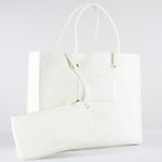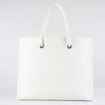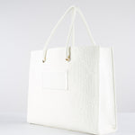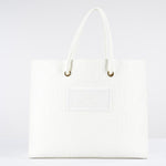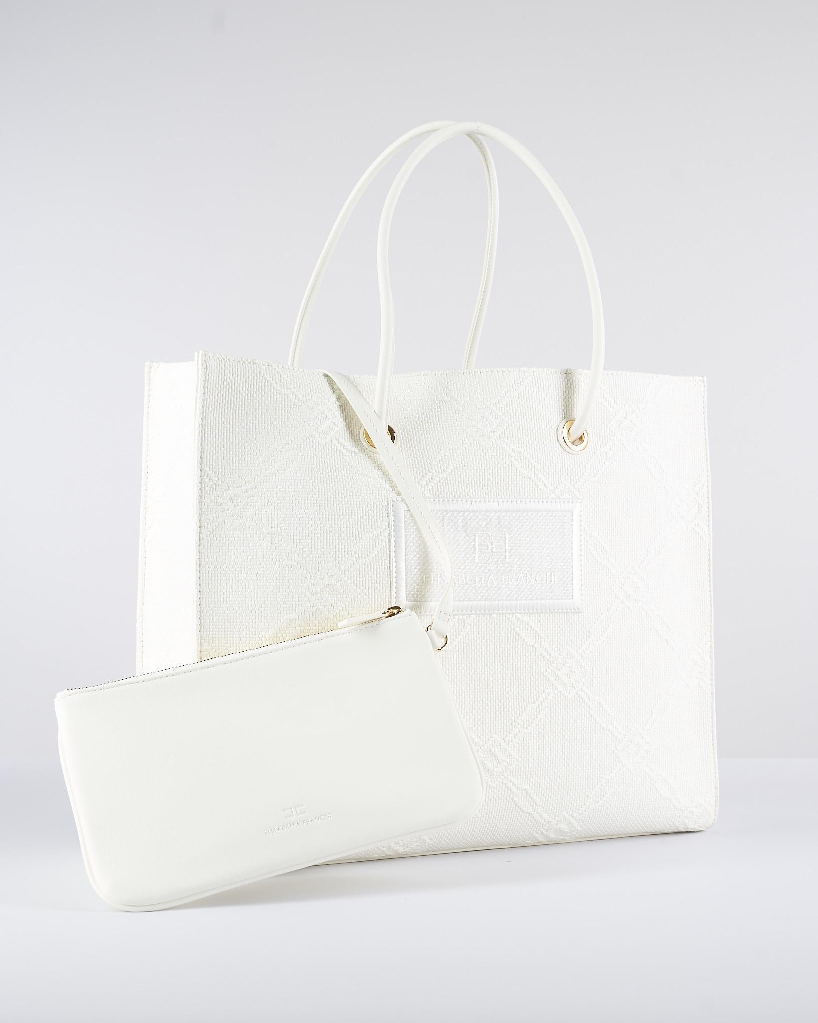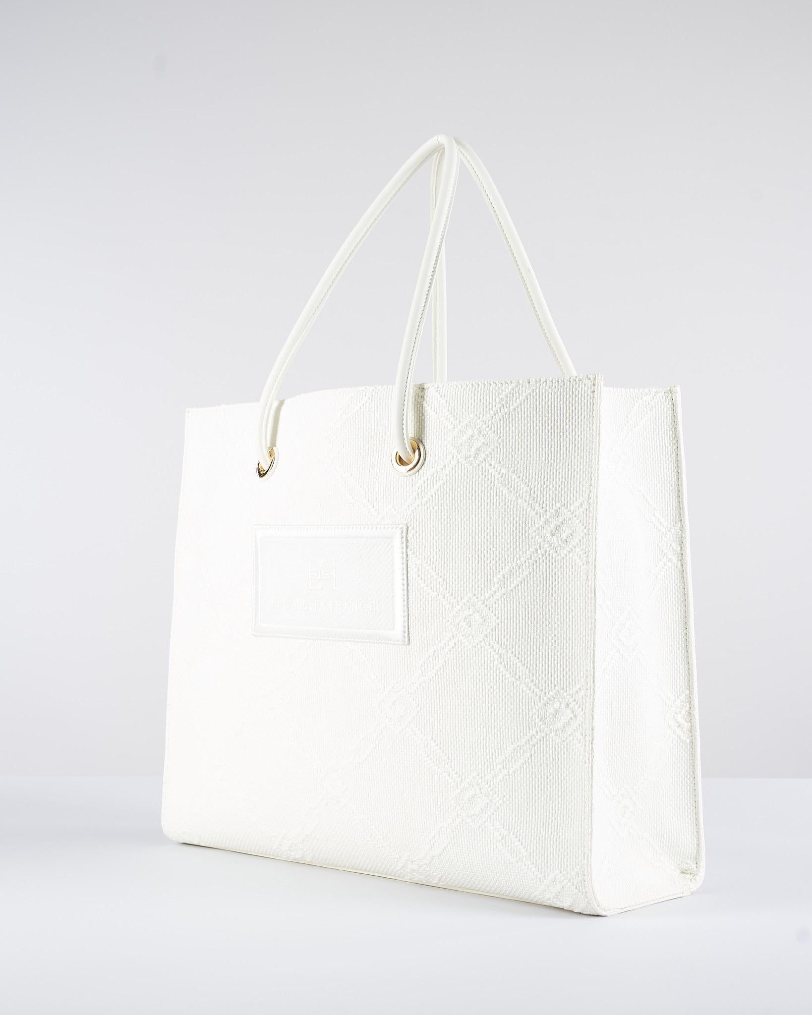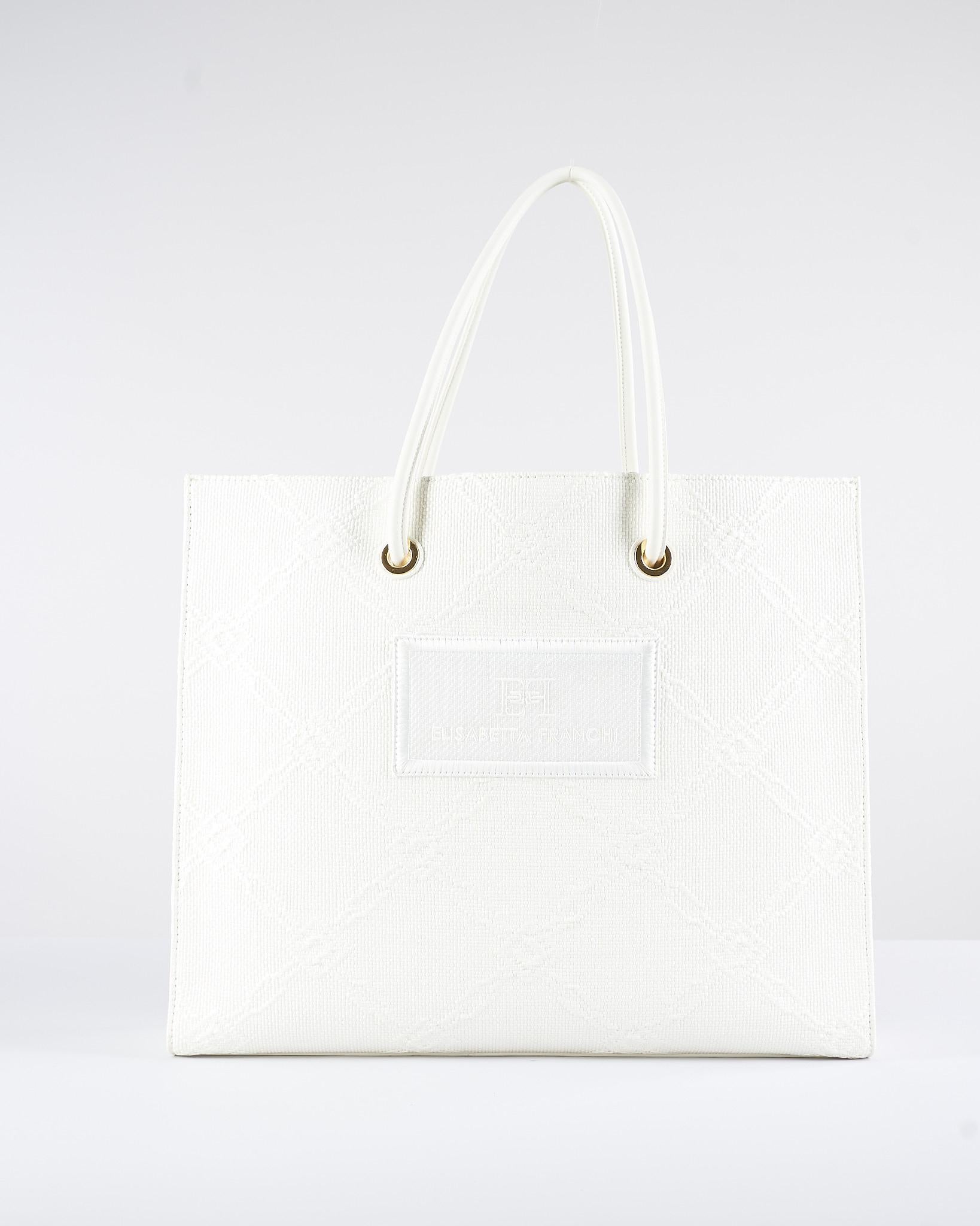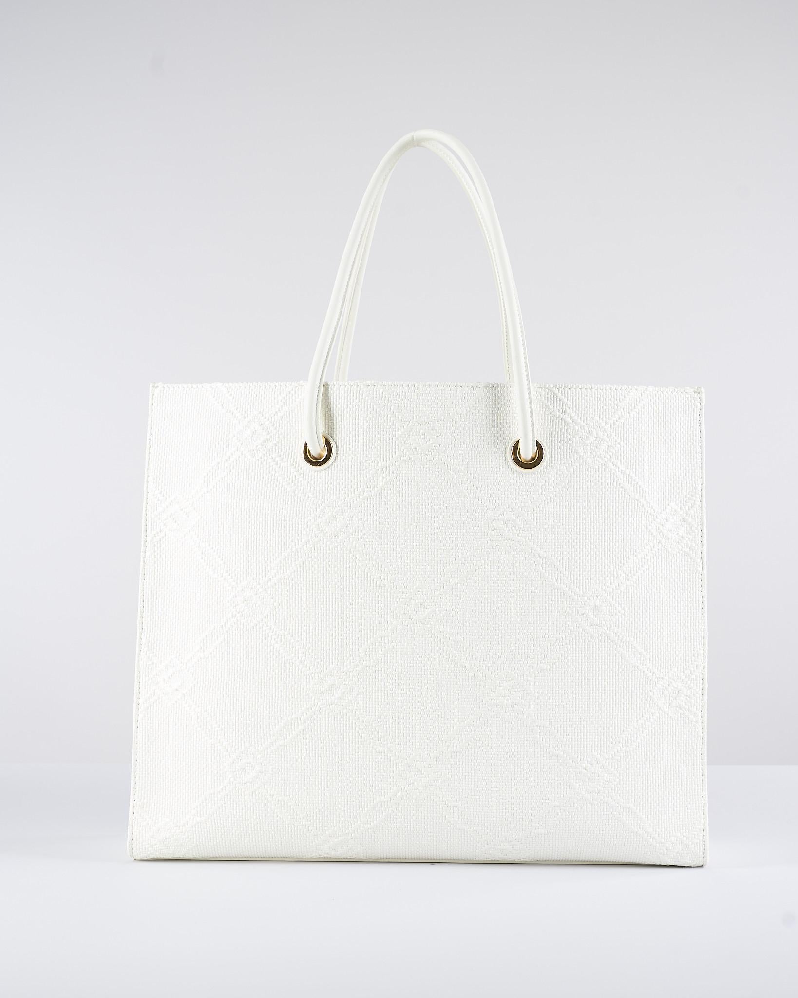 Borsa tote grande realizzata in rafia jacquard con disegno a losanghe, impreziosita da dettagli in metallo dorato per una nota di luce. Una patch con logo ricamato completa l'accessorio.