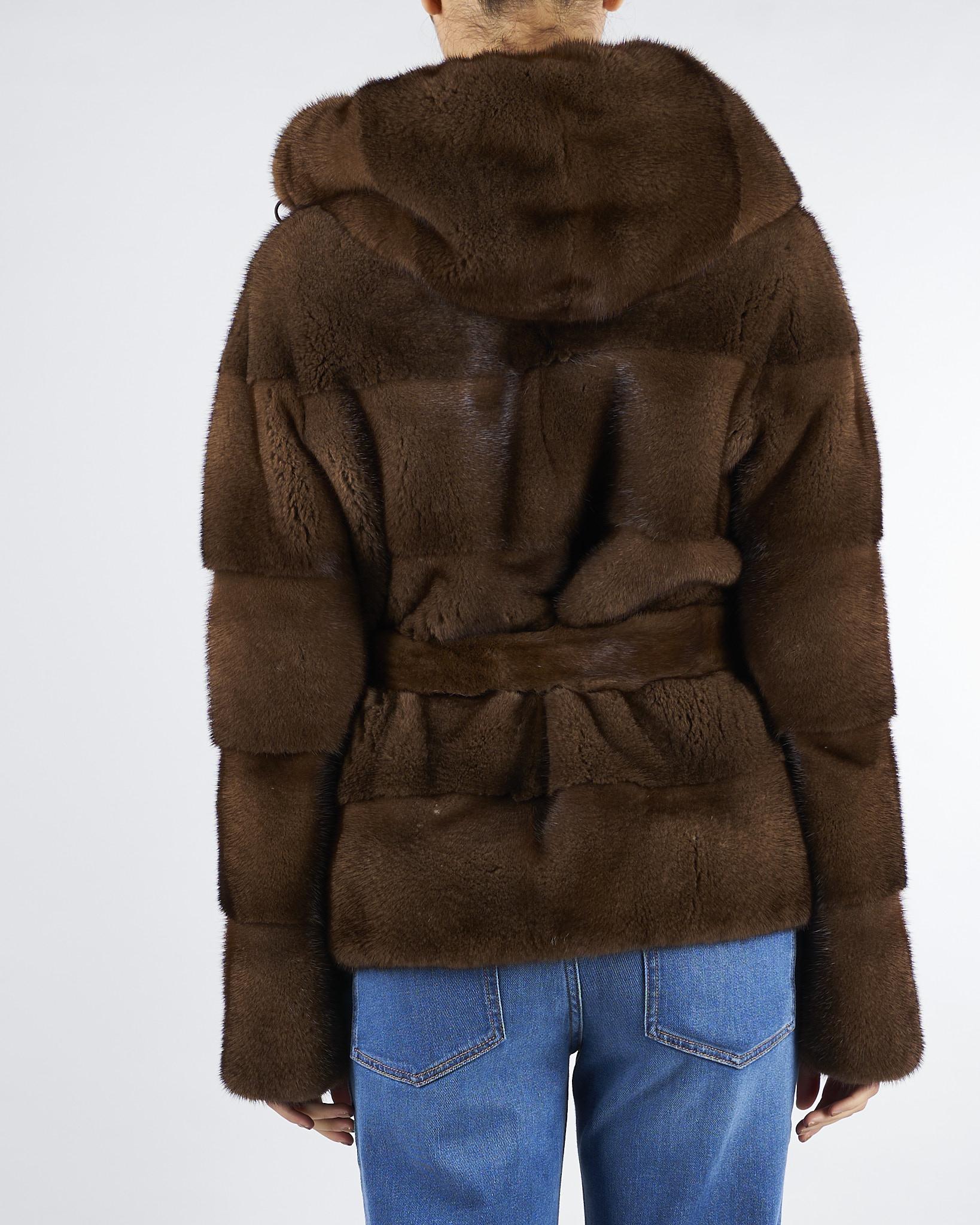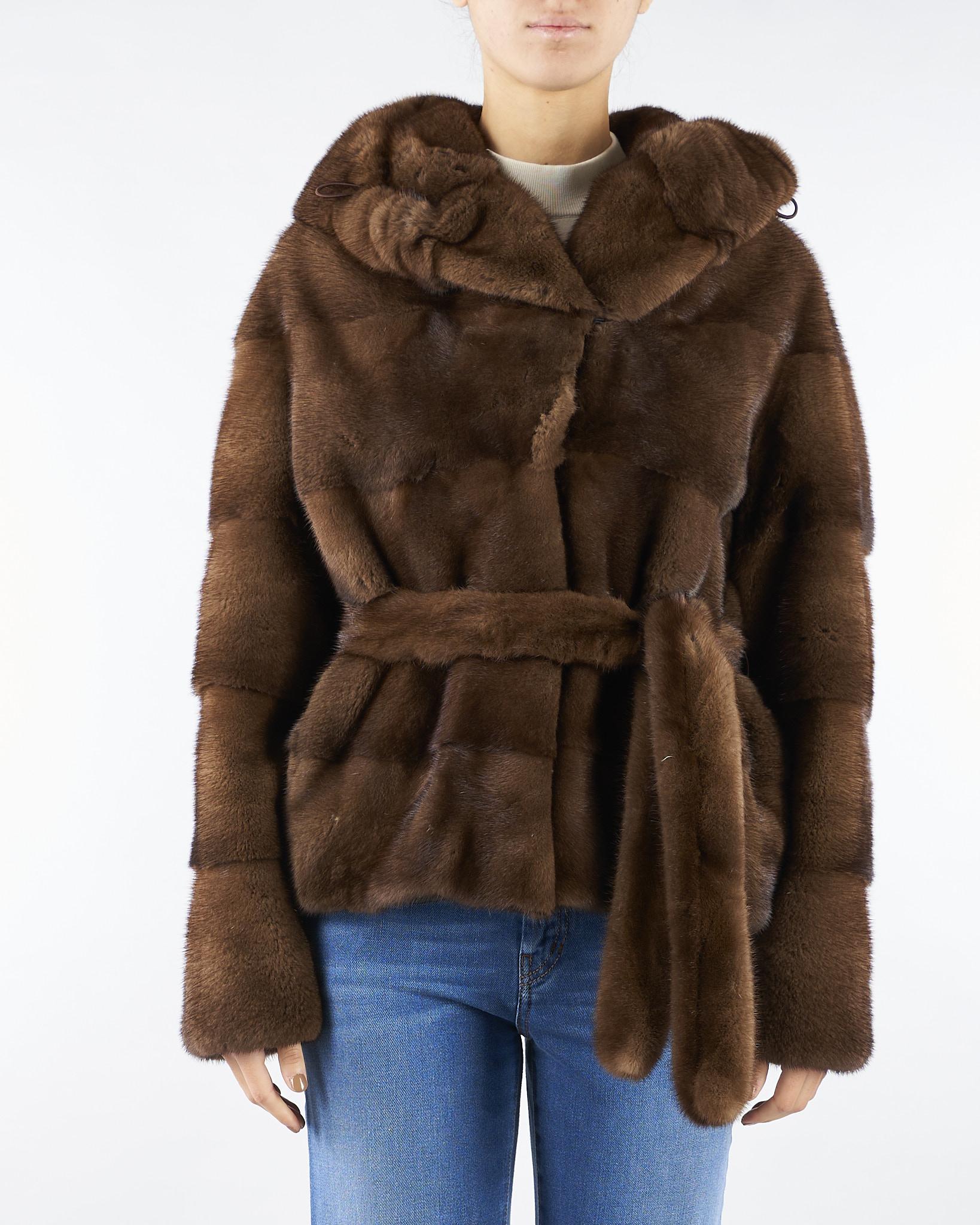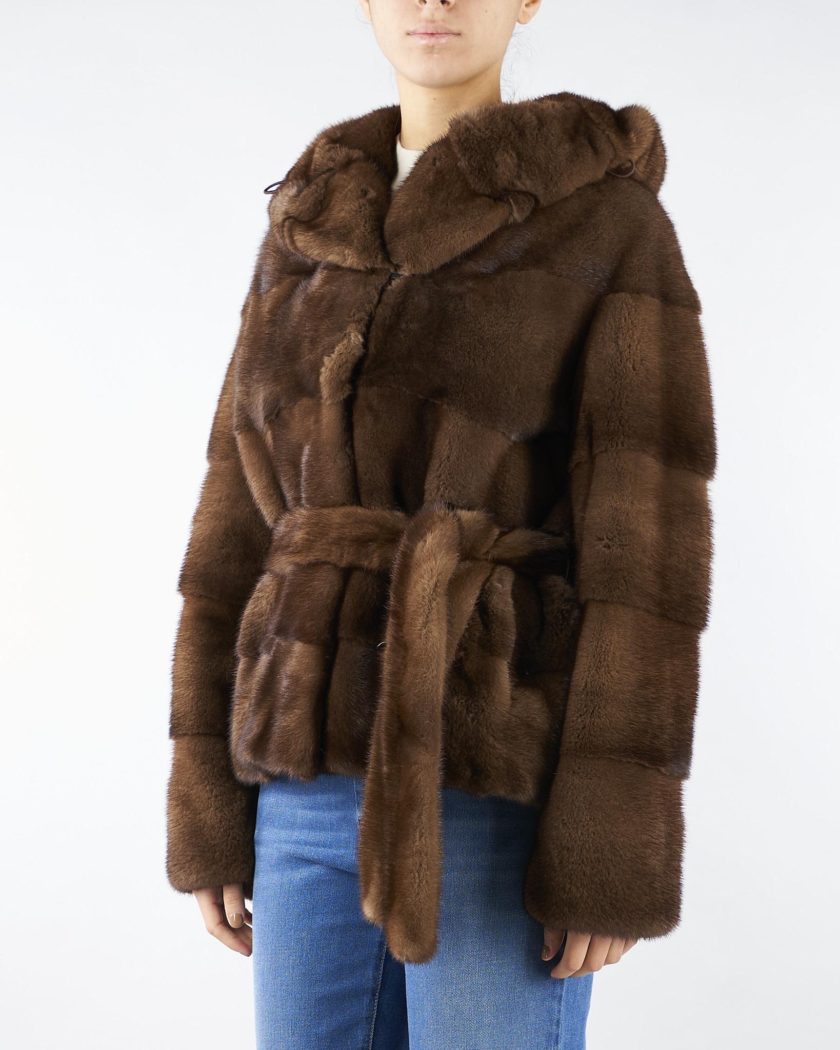 Vera pelliccia di Visone di Les Noir. Modello con cappuccio e maniche lunghe. Chiusura centrale con cintura coordinata.