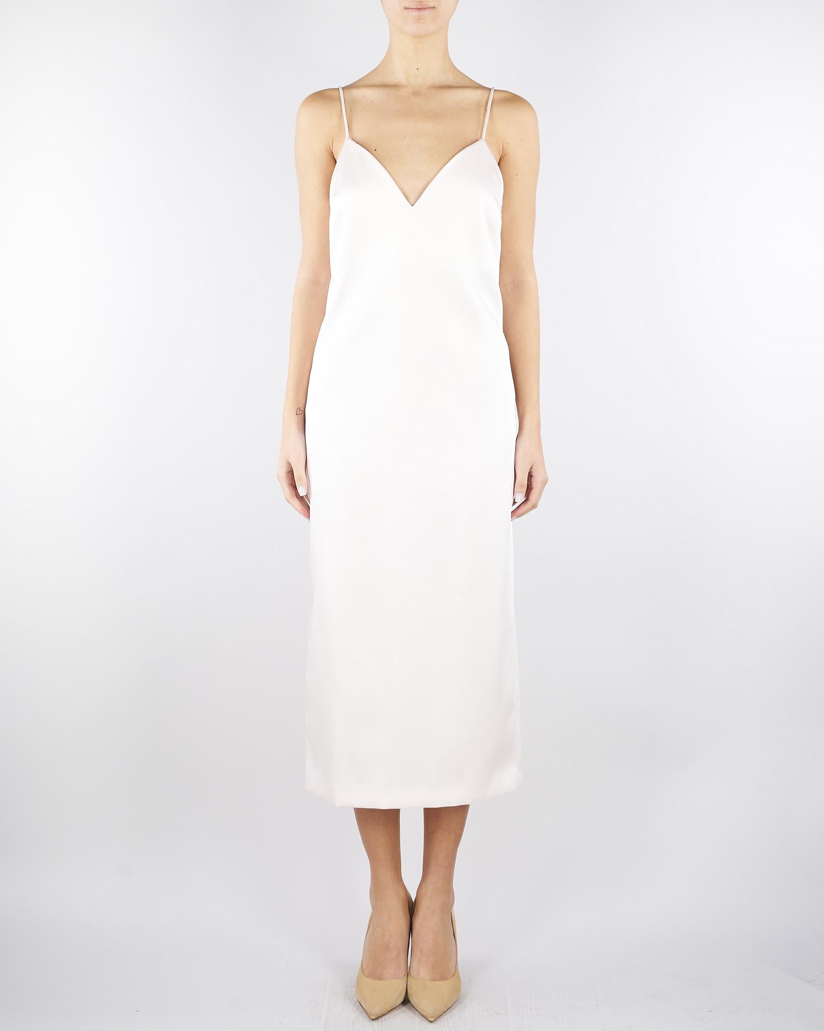 Abito lungo in duchesse con spalline, scollo a cuore davanti e a V sul retro, spalline sottili, chiusura con zip al fianco, spacco al fondo sul retro, linea dritta. Perfetto per party e cerimonie.