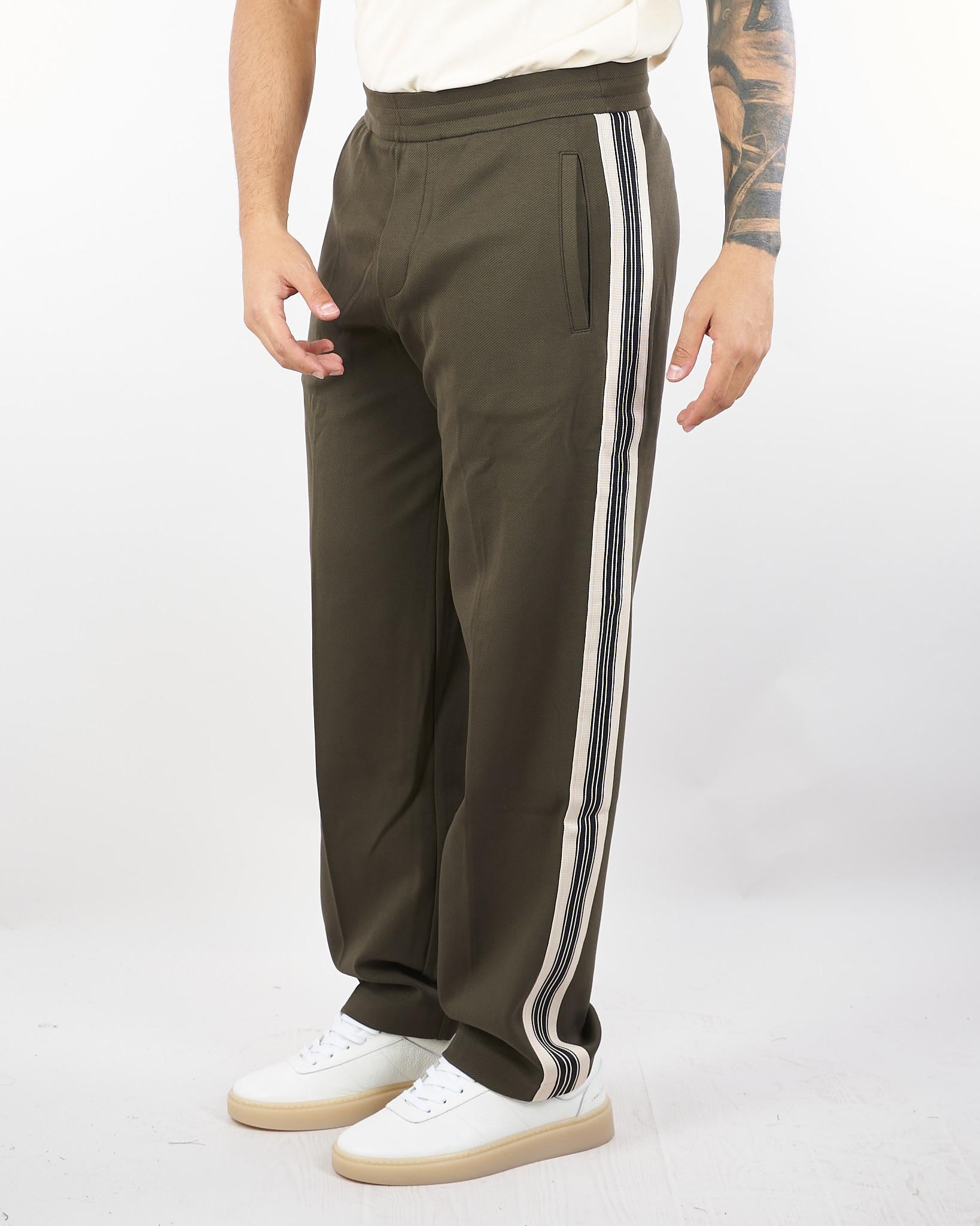 Pantaloni a vita elastica con coulisse interna, realizzati in jersey di cotone misto modal. Il capo si caratterizza per le bande a contrasto applicate su lato gamba.