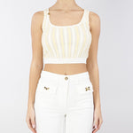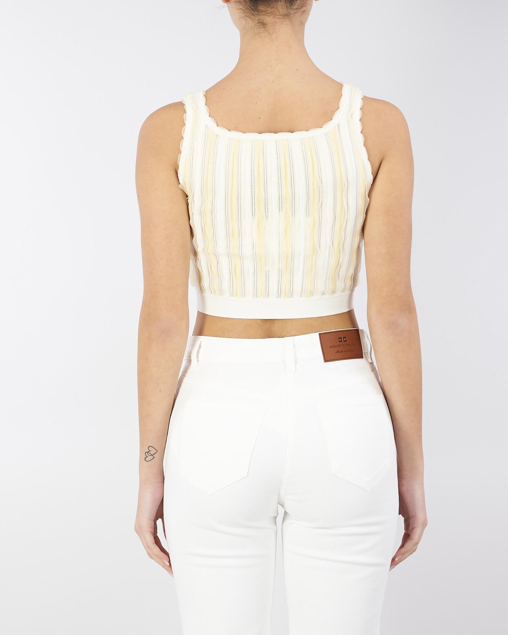 Cropped top in viscosa con scollo ampio e vestibilità aderente. Il capo si distingue per l'elaborato motivo di ruches a contrasto, regalando una silhouette d'impatto. Una nota di luce con la placca con logo in metallo dorato sulla spallina. Vestibilità aderente.