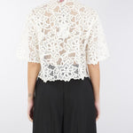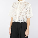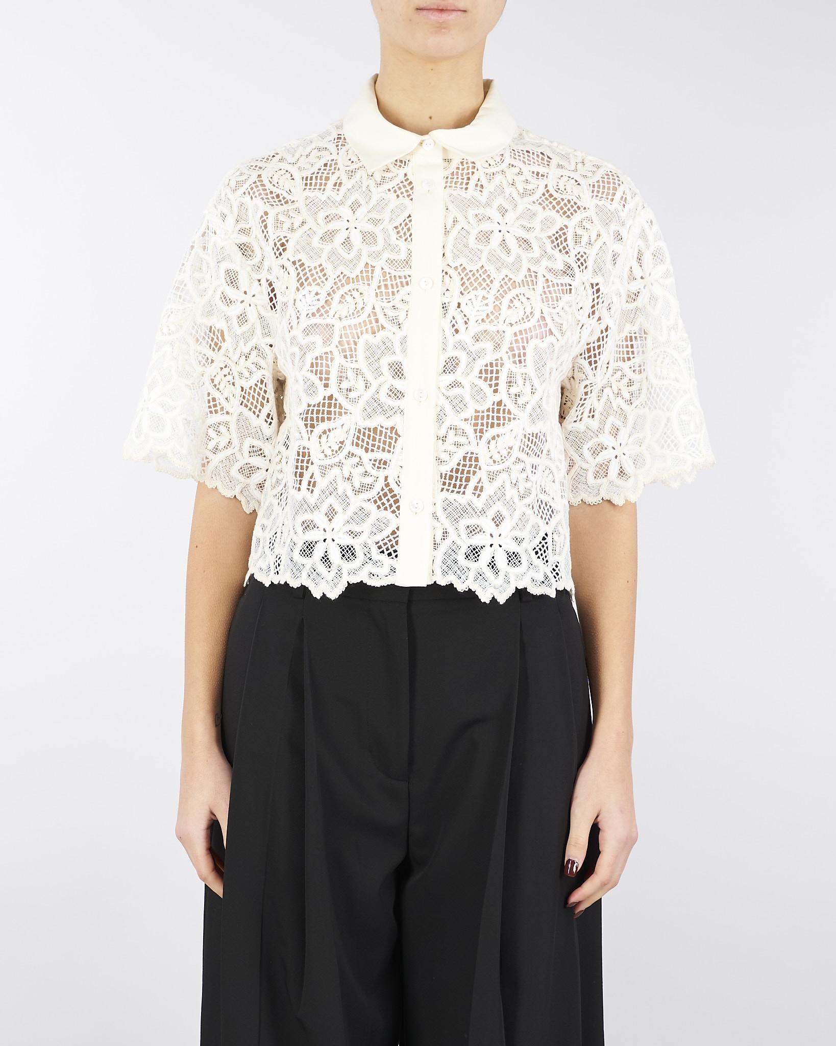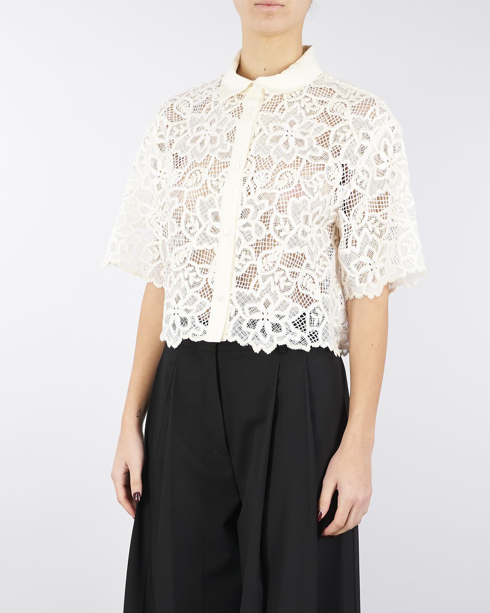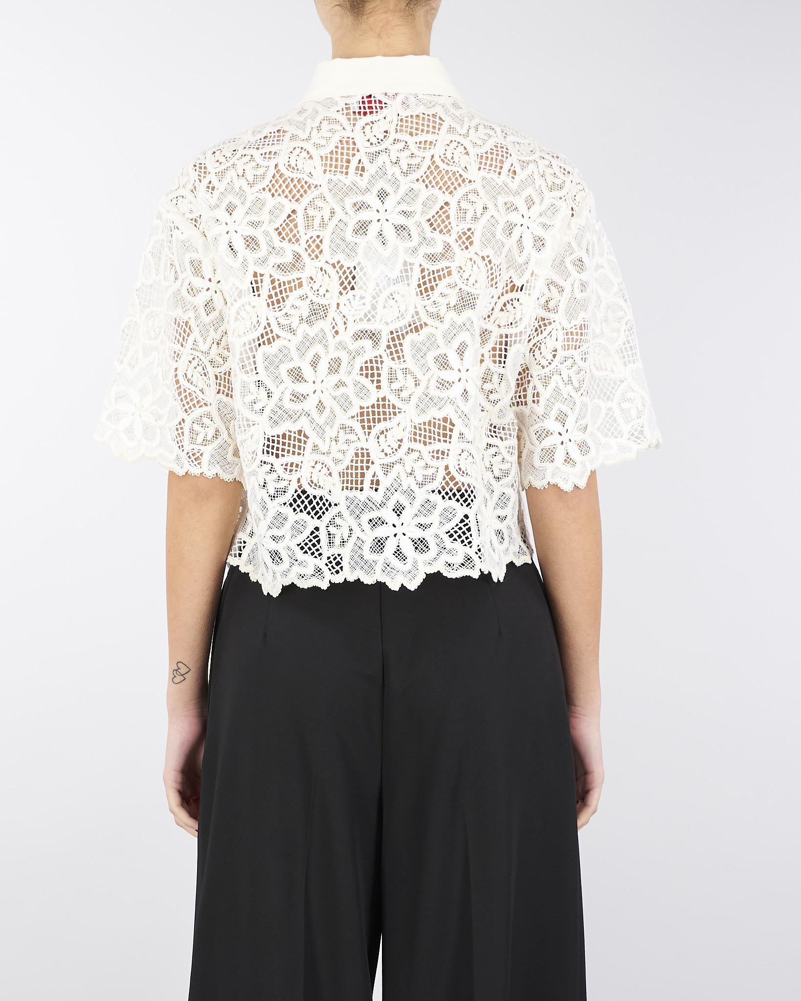 Camicia crop in pizzo macramè rebrodé ecrù con colletto e abbottonatura in popeline. Volume boxy con maniche corte. Orli smerlati che seguono la forma del ricamo.