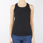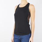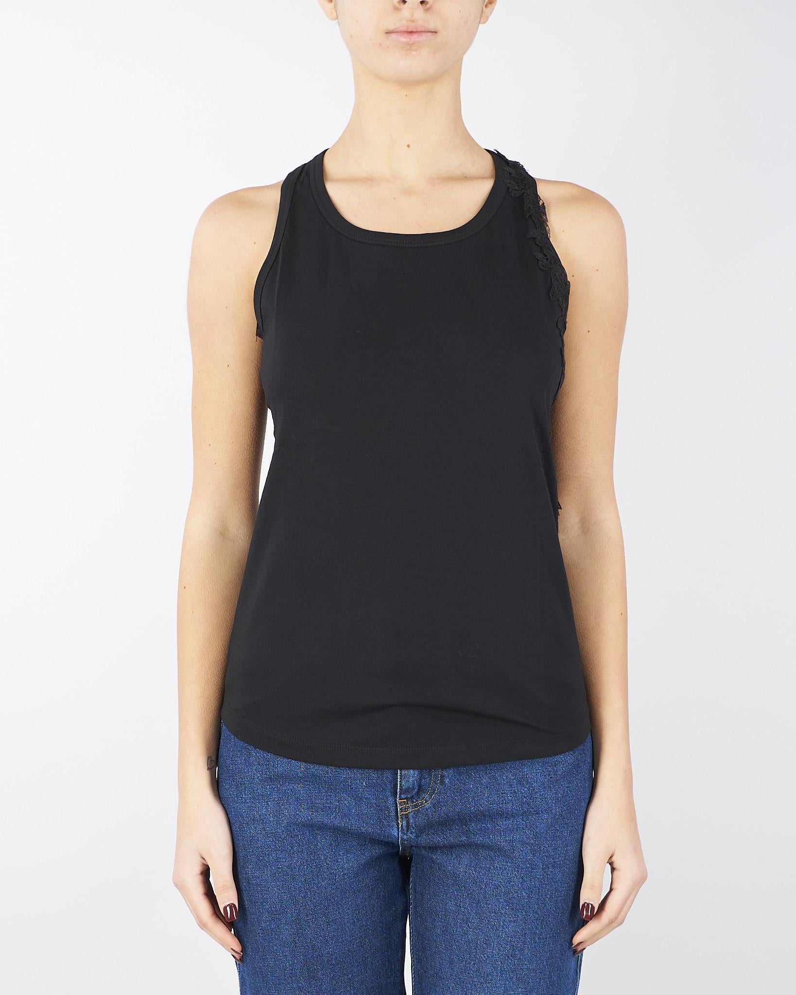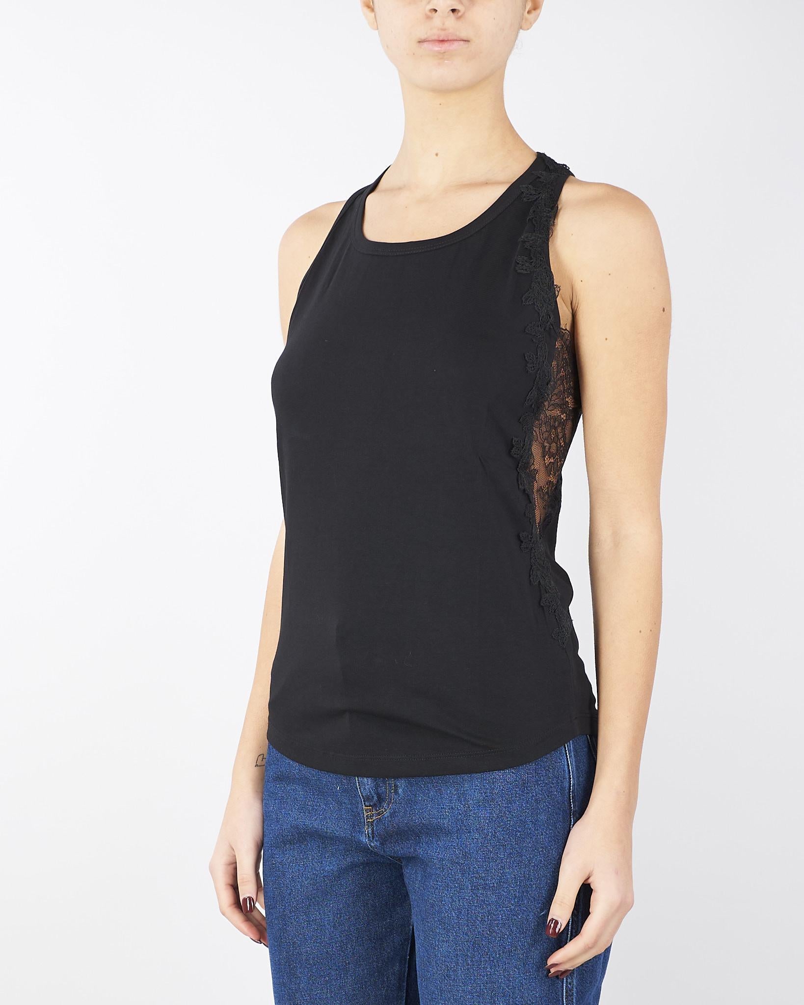 Top in jersey con scollo vogatore con spicchi di pizzo sui fianchi e inserto sulla schiena con logo Ermanno stampato e impreziosito da cristalli neri.