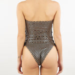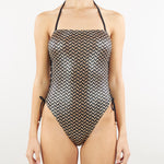 Sexy e glamour il costume intero sgambato a fascia con stampa Spighetta geometrica su tessuto lamina oro. Aperture laterali a incrocio, regolabili da lacci con finalini dorati. Laccio da annodare al collo rimovibile.