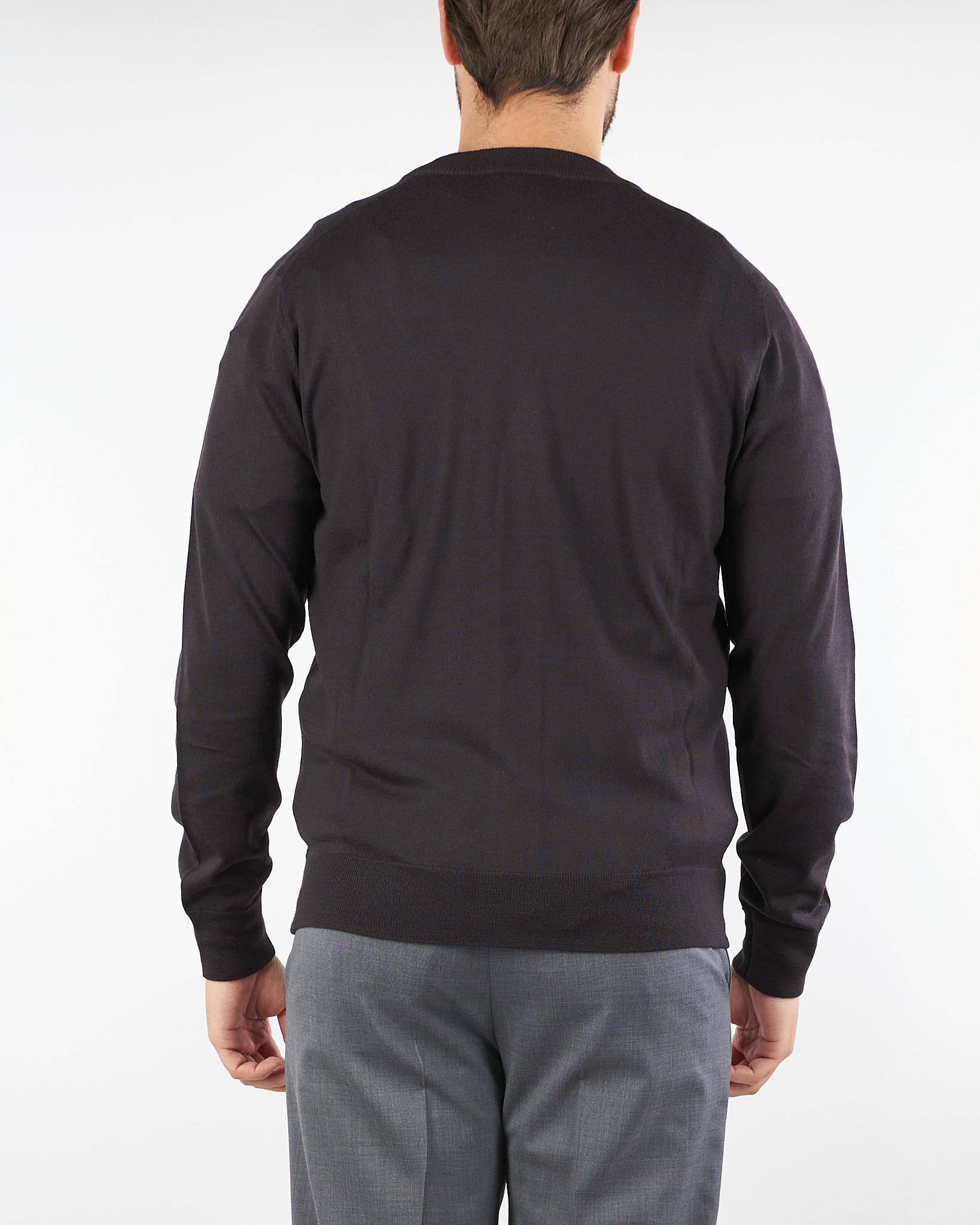 Cardigan in pura lana merinos finezza 16 di Paolo Pecora. Modello con scollo a V e maniche lunghe. Fondo e polsini a costine. Chiusura centrale con bottoni.