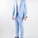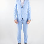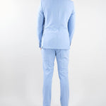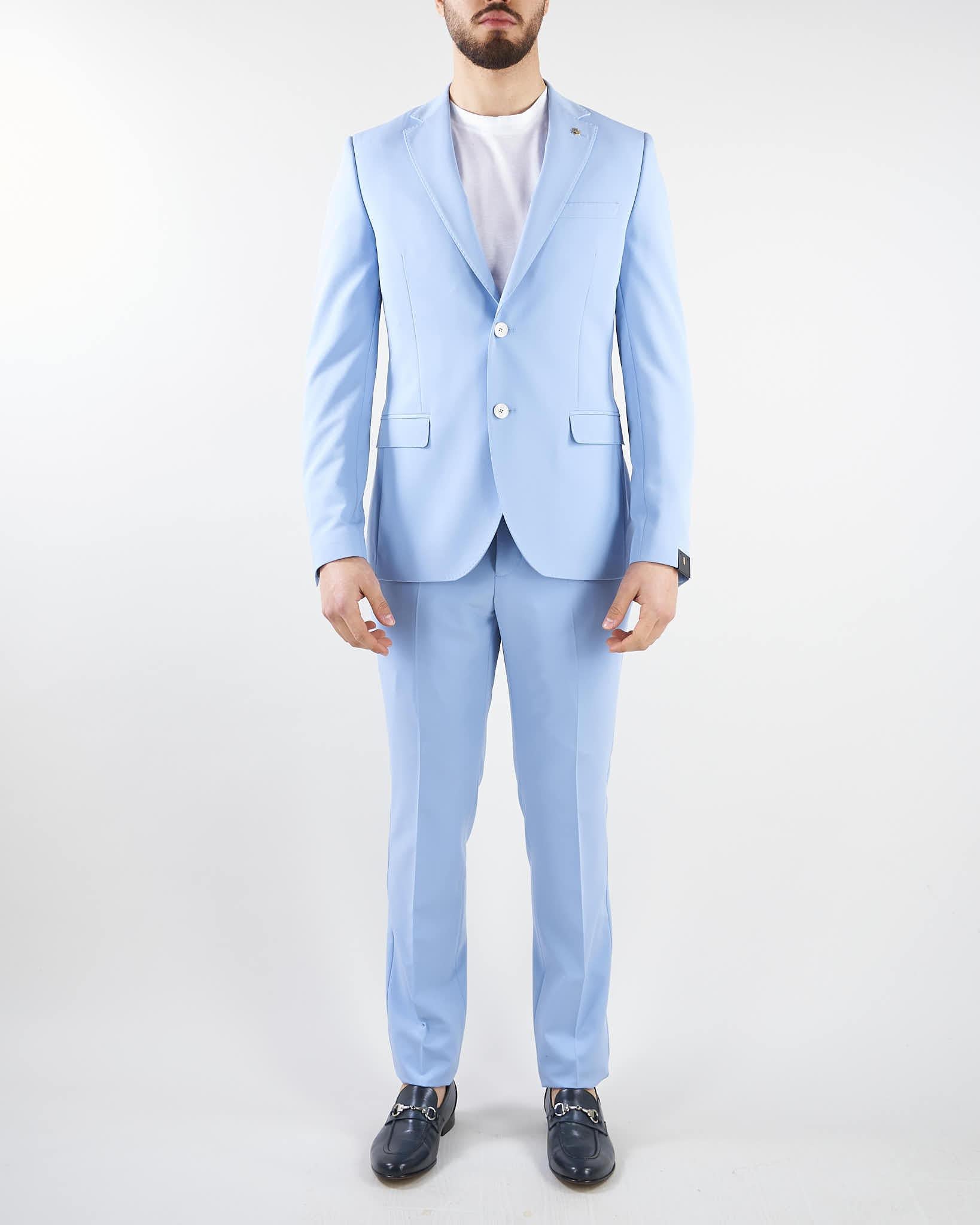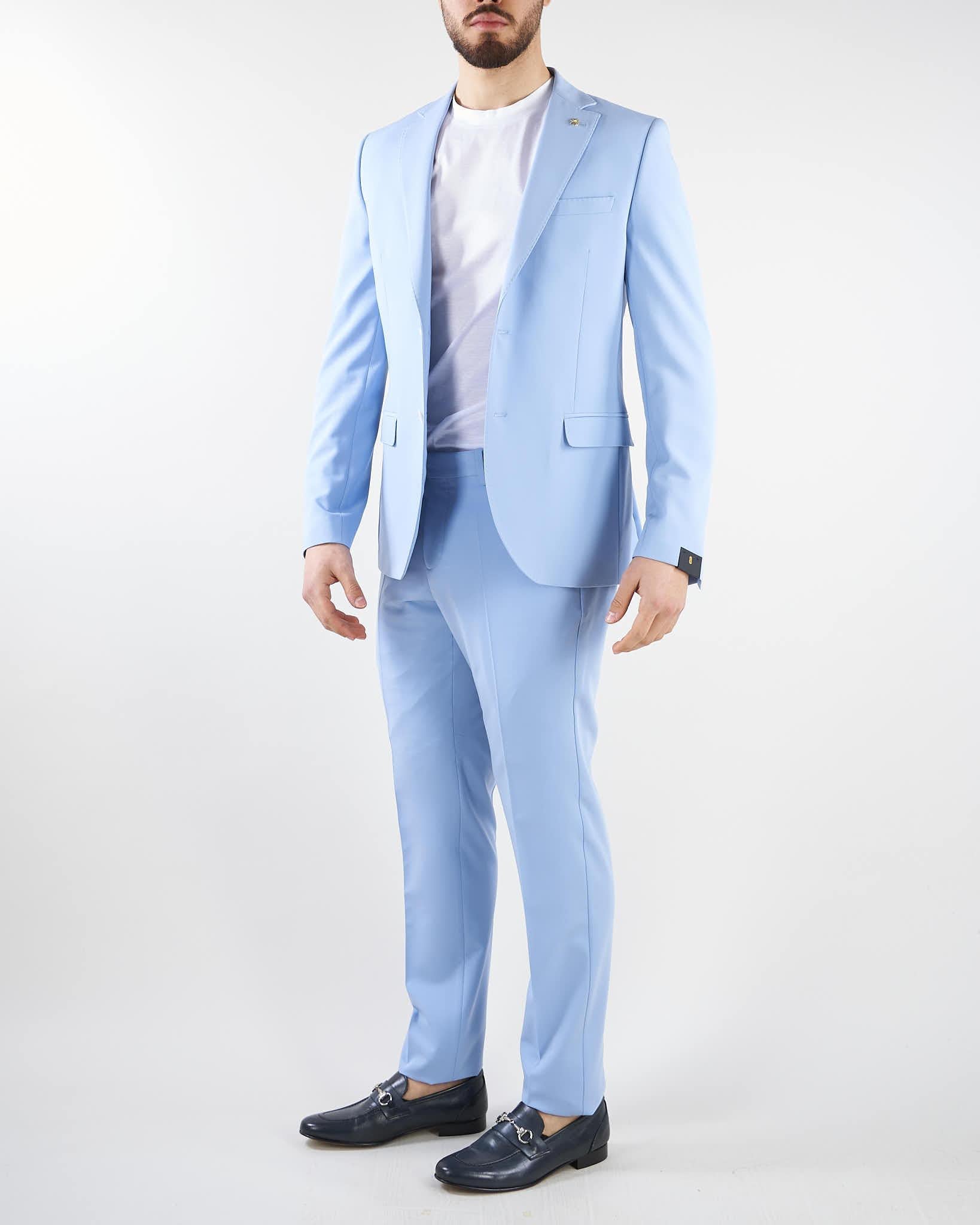 Abito di Manuel Ritz. Modello monopetto con rever a specchio, tasche a filo con pattina sul davanti, doppio spacco sul retro, chiusura centrale con due bottoni. Pantalone modello slim, tasche america laterali e tasche a filo sul retro, chiusura con gancio e bottone ricoperti.