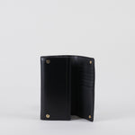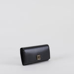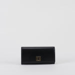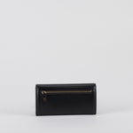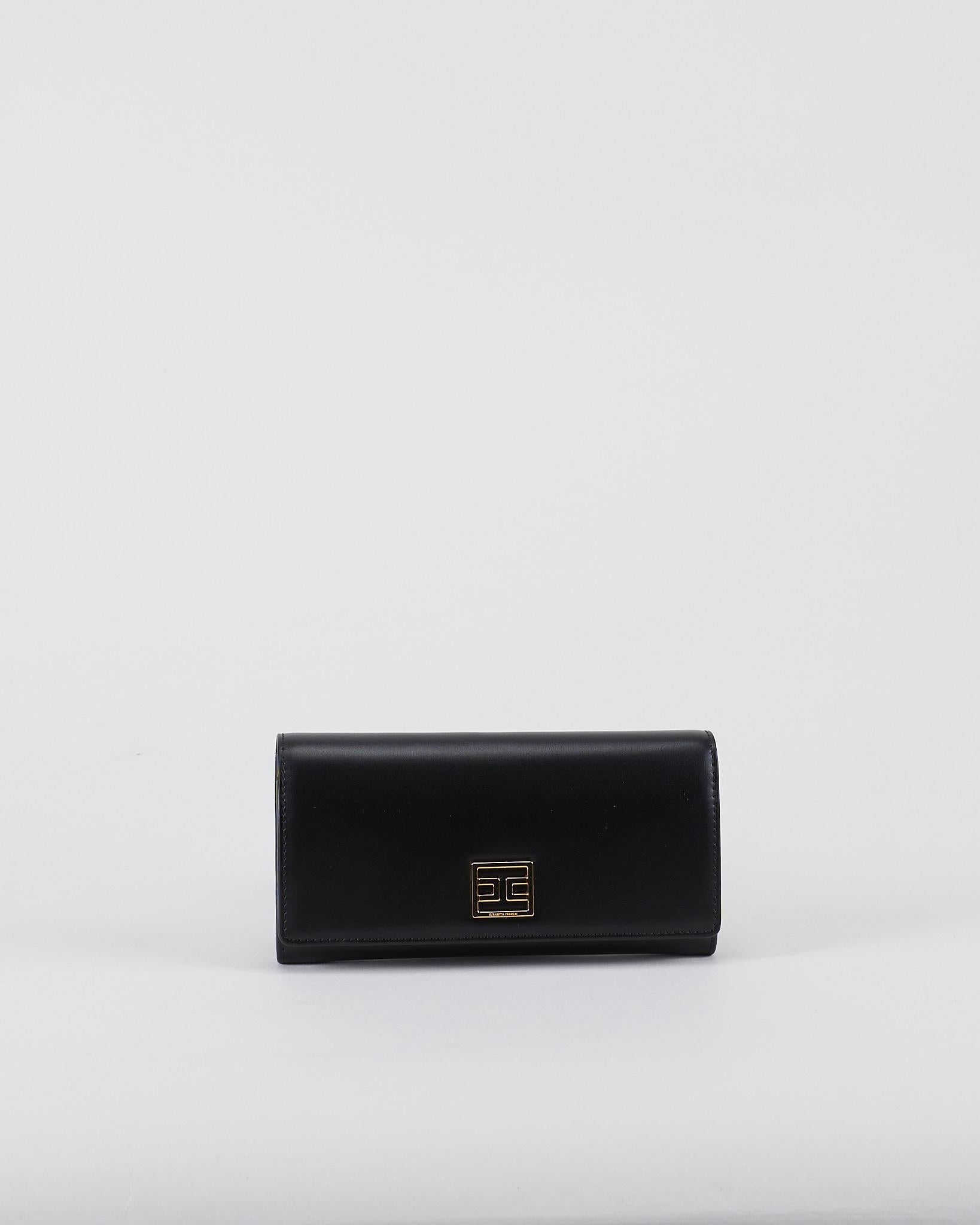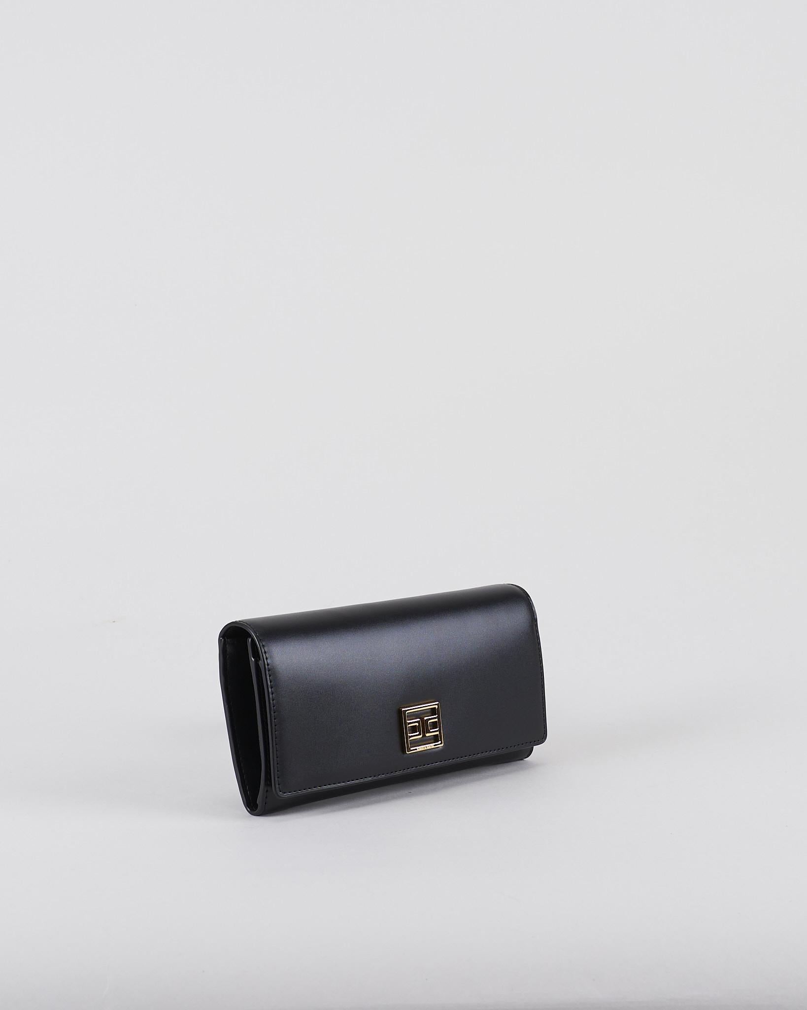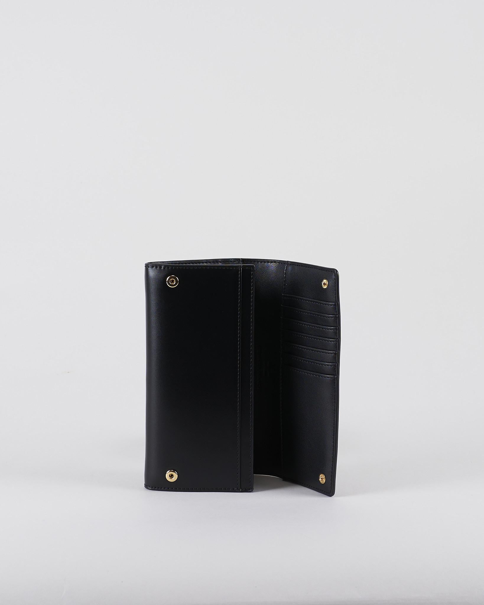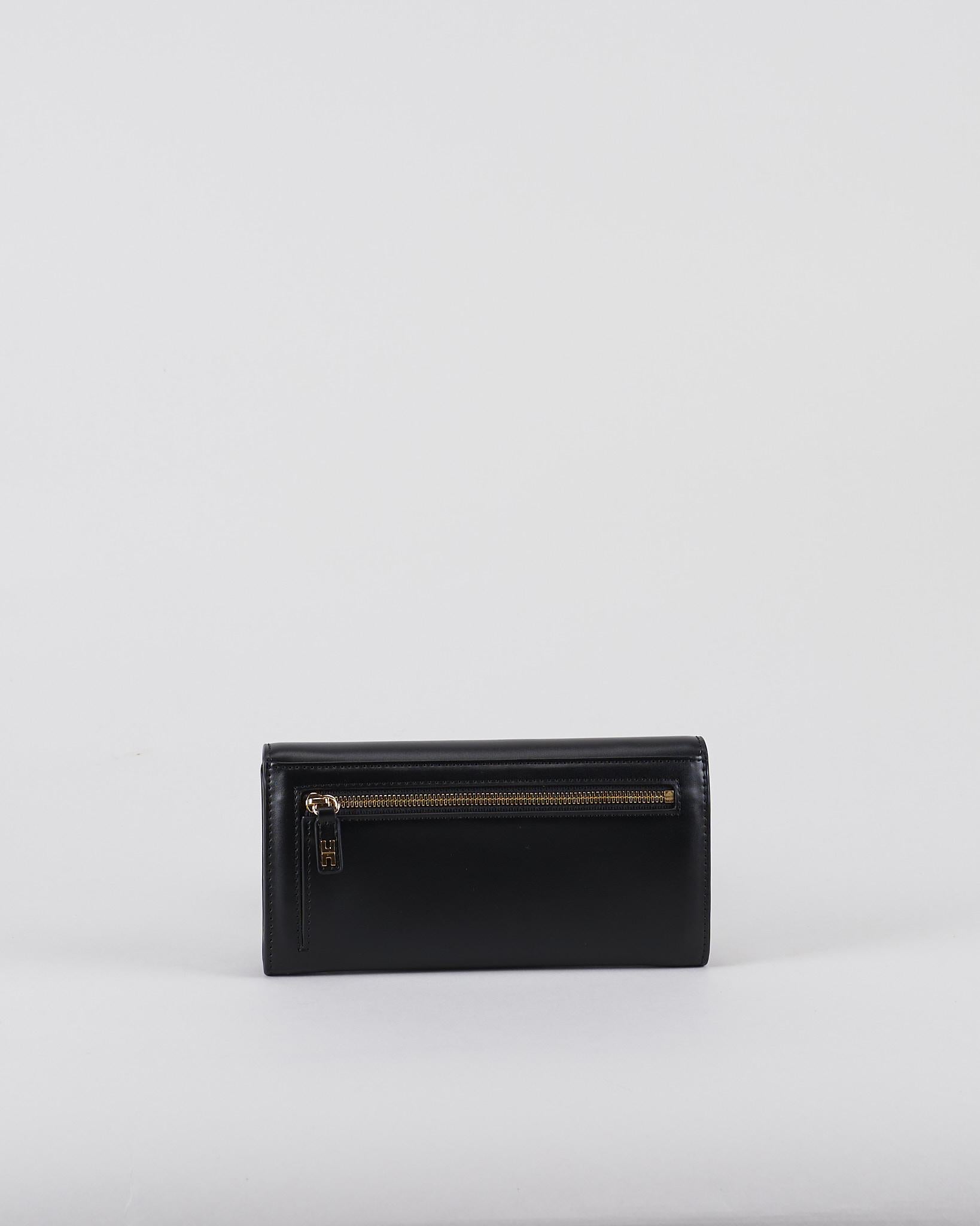 Portafoglio grande realizzato in materiale sintetico effetto pelle dalle texture lucide. Ha patta impreziosita dalla placca con logo in metallo dorato.