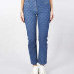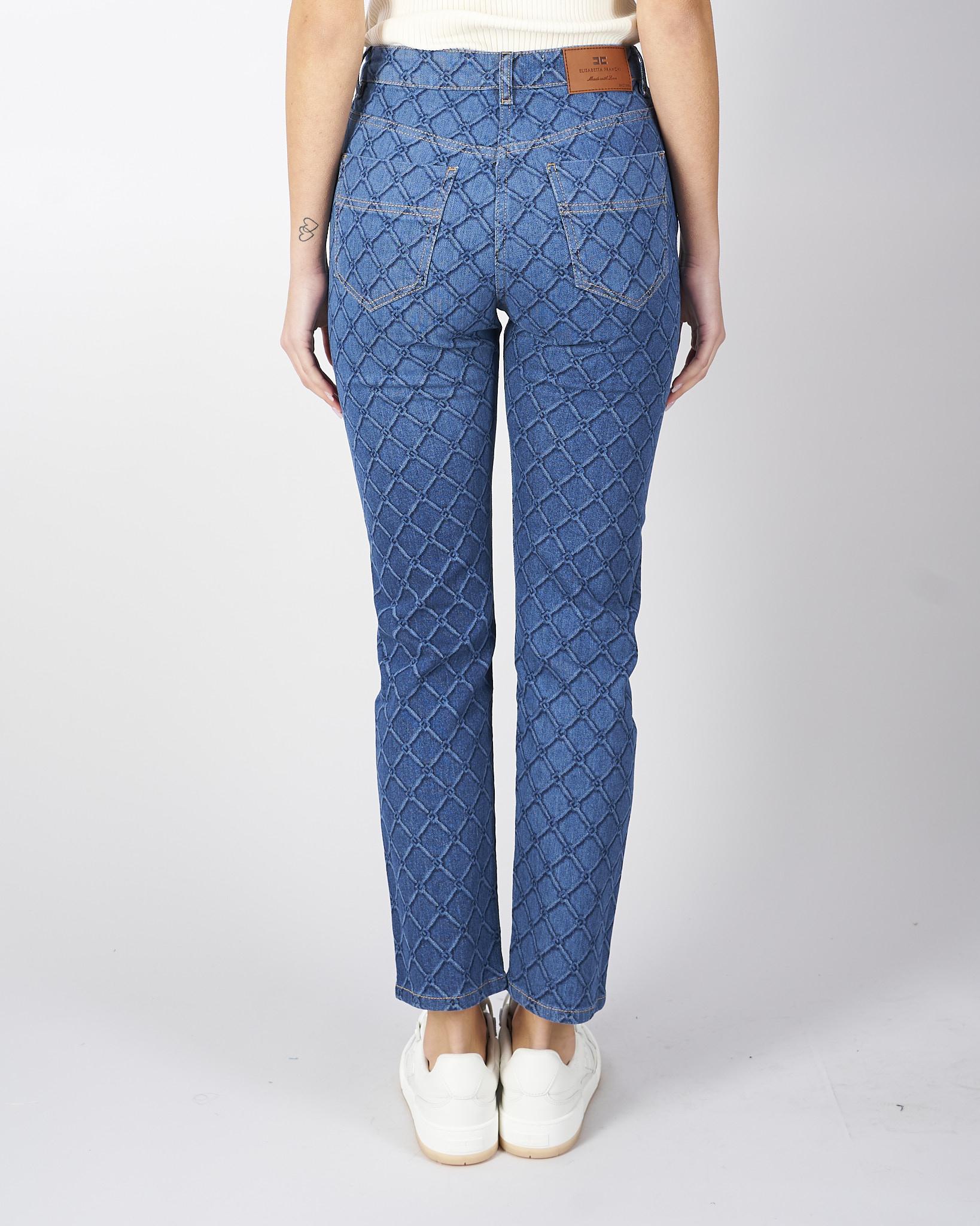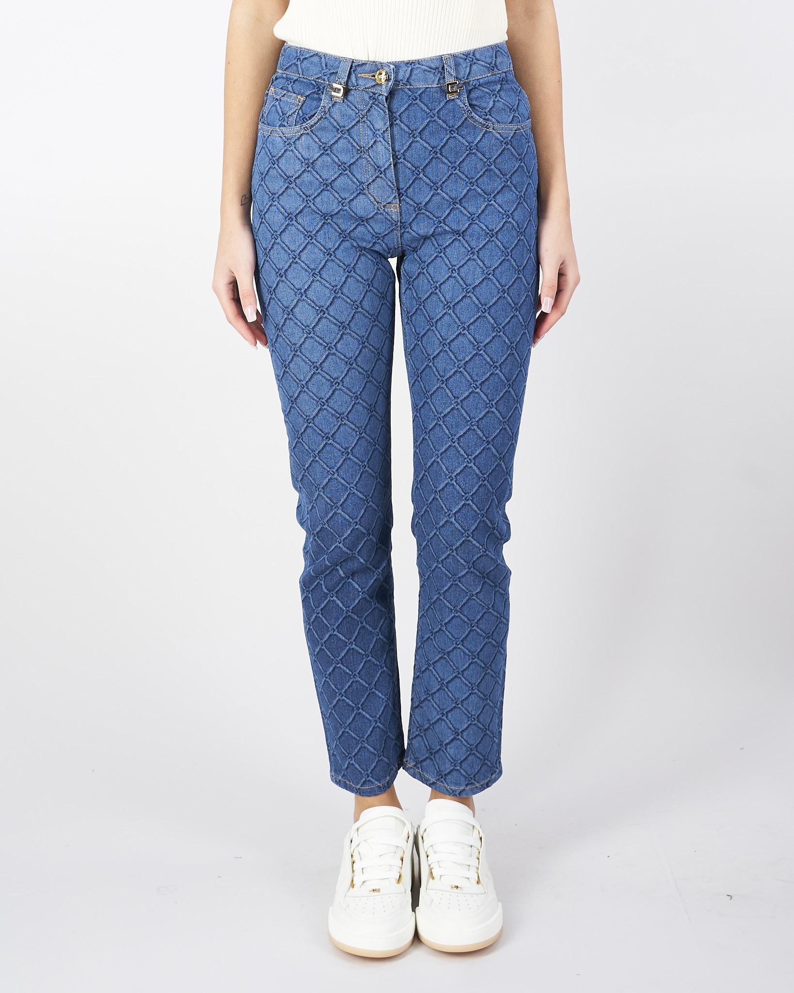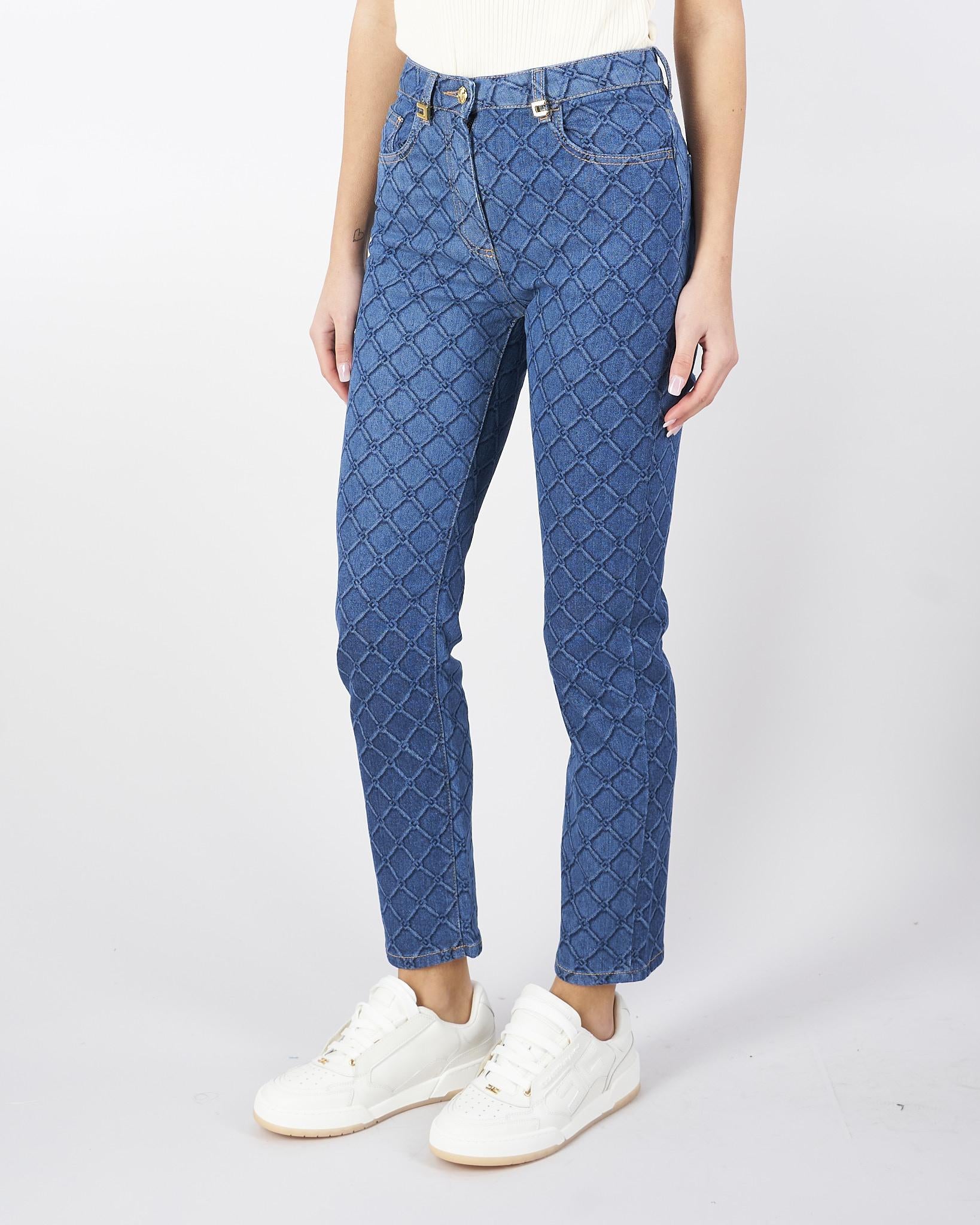 Pantaloni cinque tasche in denim costruiti con vita regular e gamba dritta al fondo. Il capo si distingue per la stampa all-over che crea elaborate losanghe a laser. Una nota di luce coi dettagli gioiello con logo sui passanti. A completare, bottone e etichetta con logo.