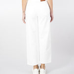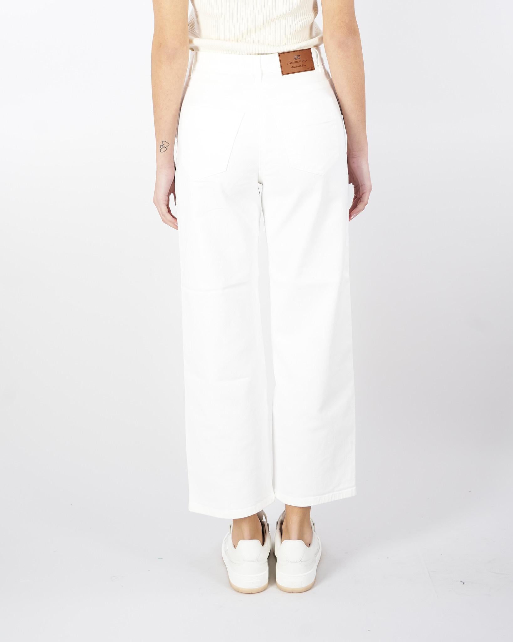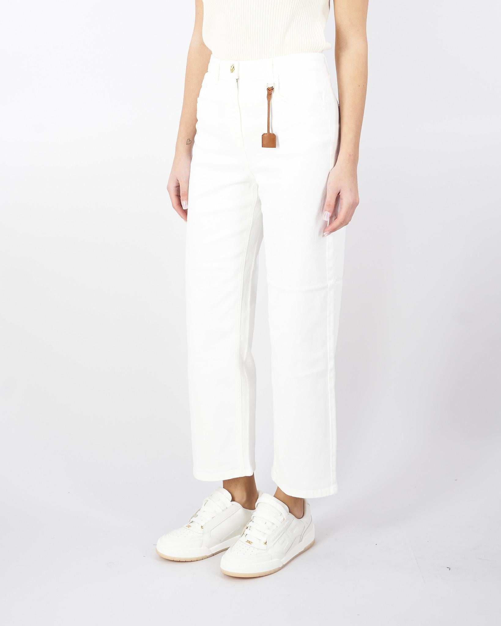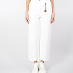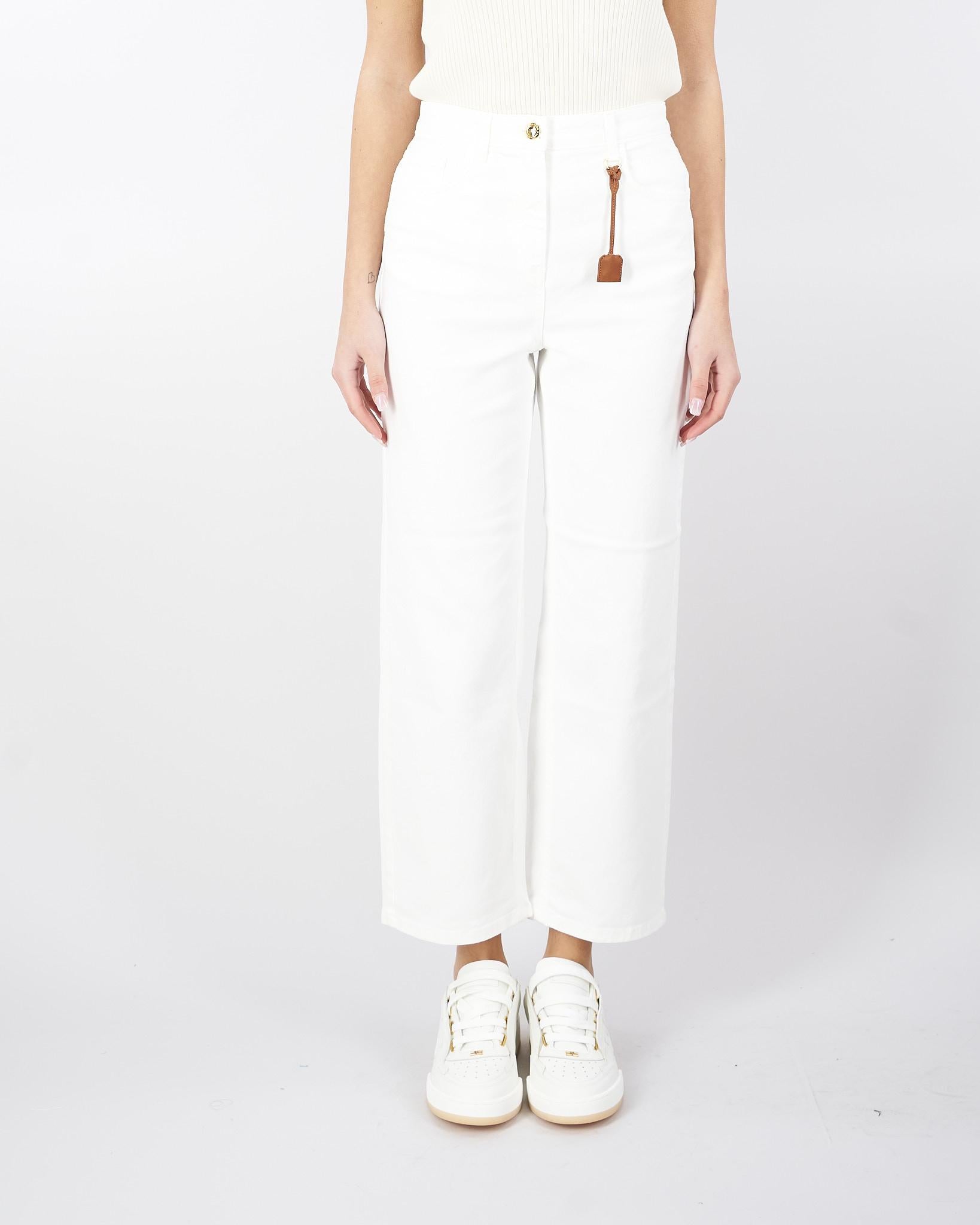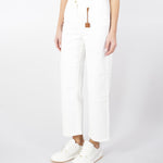 Pantaloni cinque tasche in cotone tinto capo costruiti con vita alta e gamba a palazzo. Un tocco distintivo è dato dallo charm in tessuto effetto pelle, removibile e personalizzato con preziosi dettagli logo in metallo dorato. A completare, bottone e etichetta con logo.