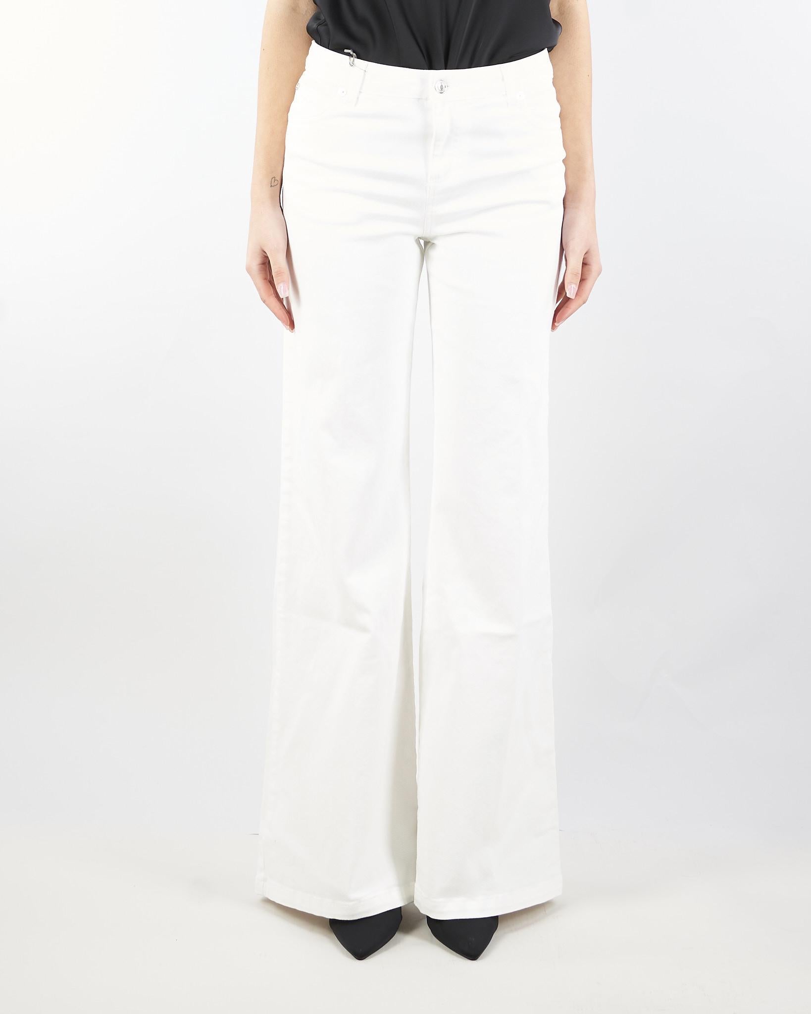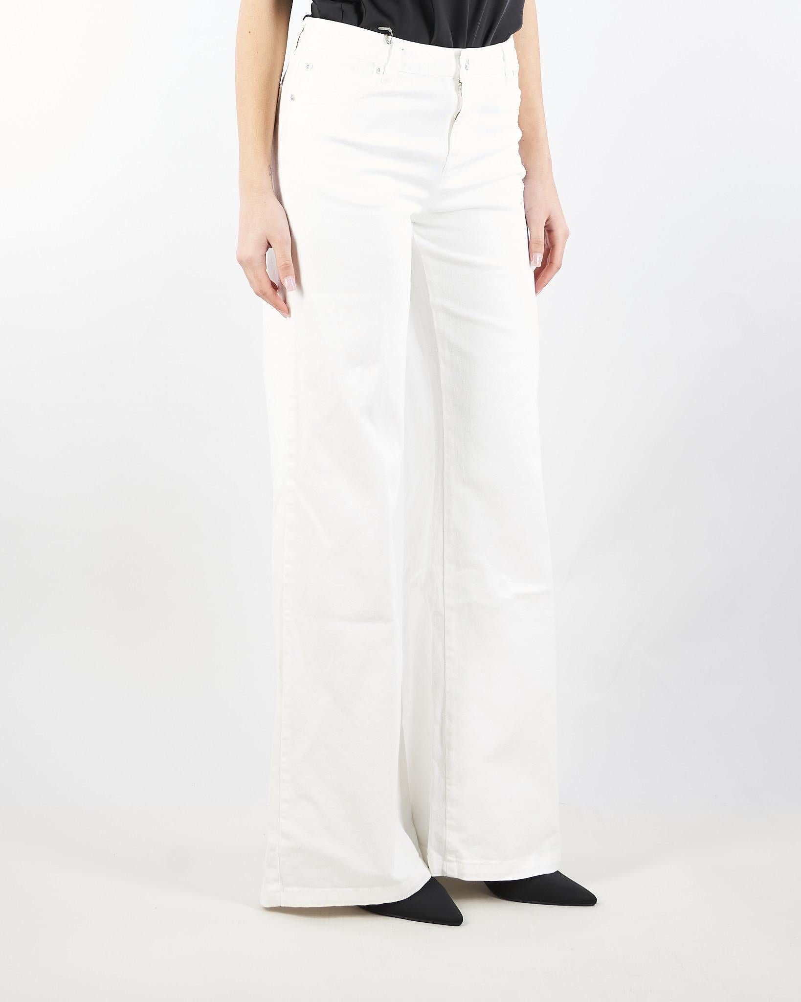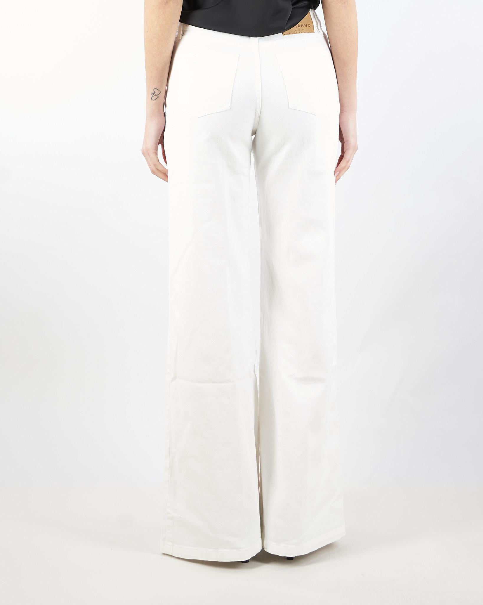 Pantaloni in jeans bianco lavati in capo. Modello a 5 tasche regolare in alto e con gamba ampia sul fondo. Bottone a chiodo e rivetti logati.