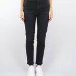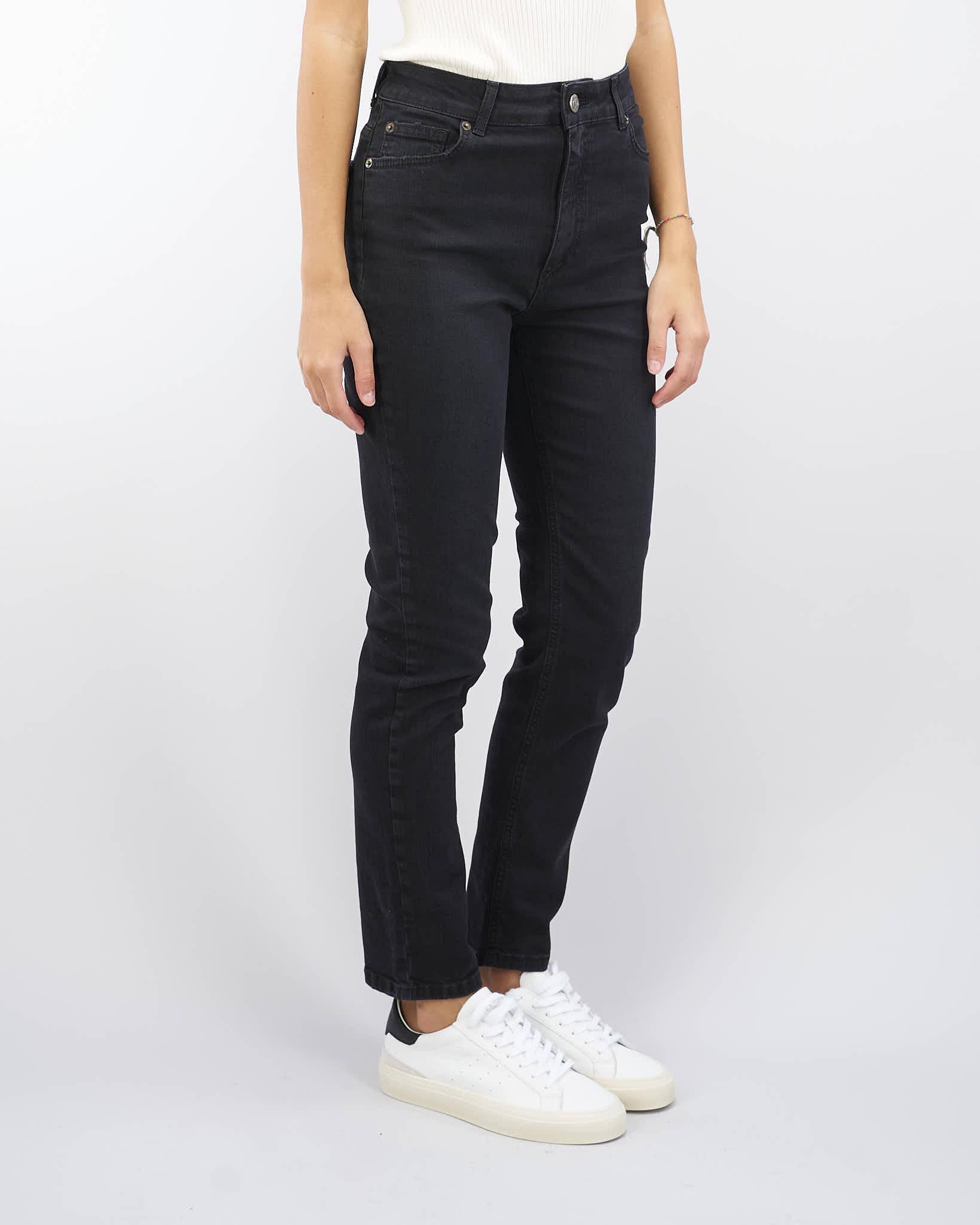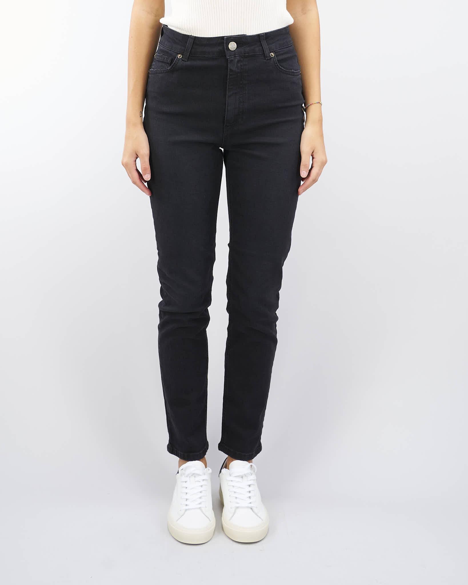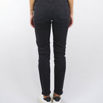Jeans made in Italy in denim nero di cotone con lavaggio ad acqua. Vita regular, cinque tasche, chiusura con zip e bottone a chiodo logato, passanti in vita, rivetti ed etichetta dietro personalizzata, linea slim.