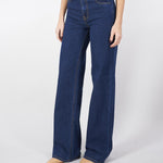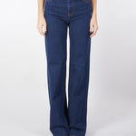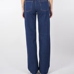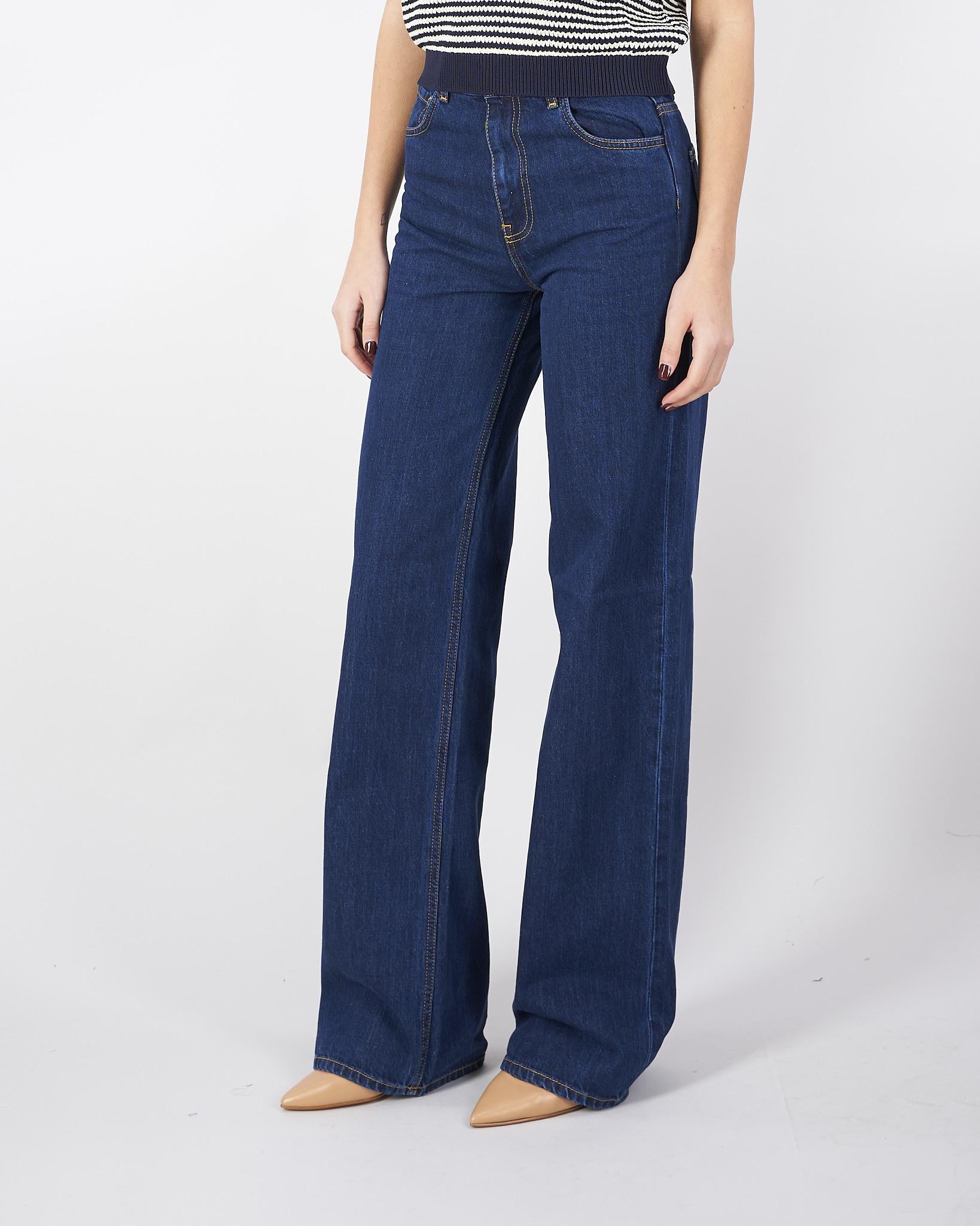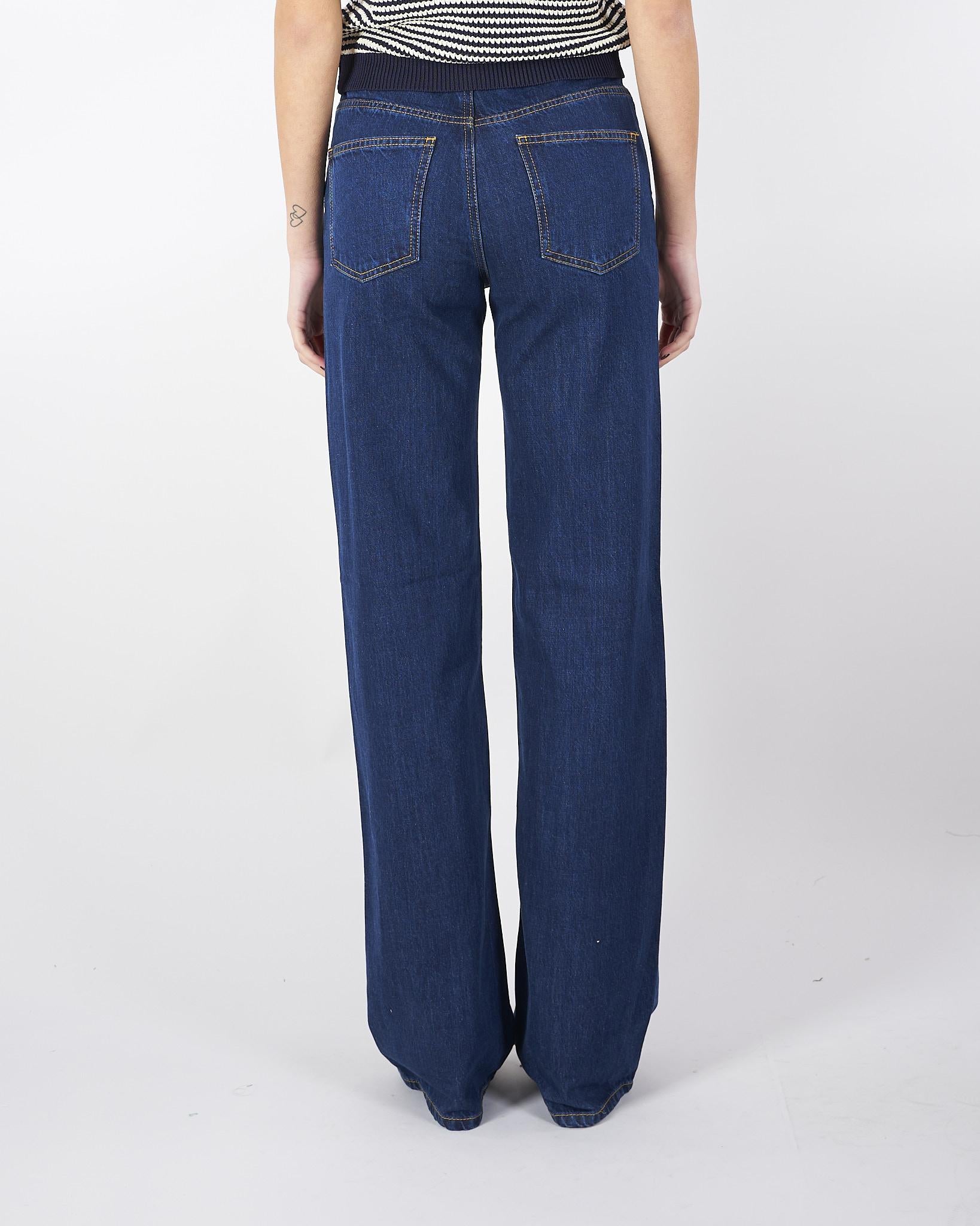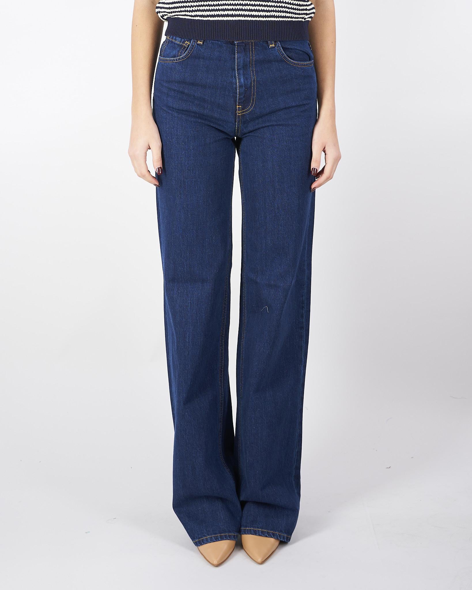 Jeans made in Italy d'ispirazione sartoriale in cotone stone wash blu scuro con vita regular, chiusura con zip e bottone a quattro fori, cinque tasche, placchetta logo sul retro, linea dritta.