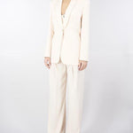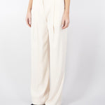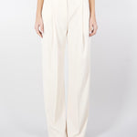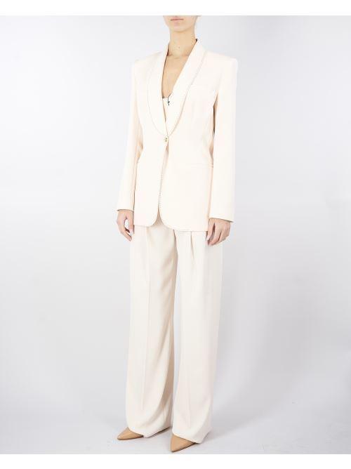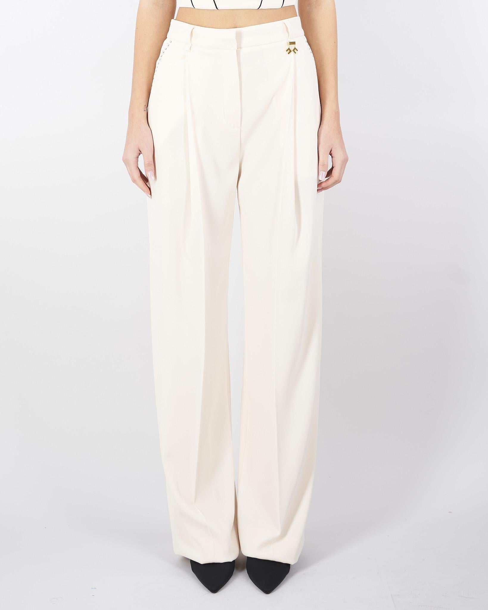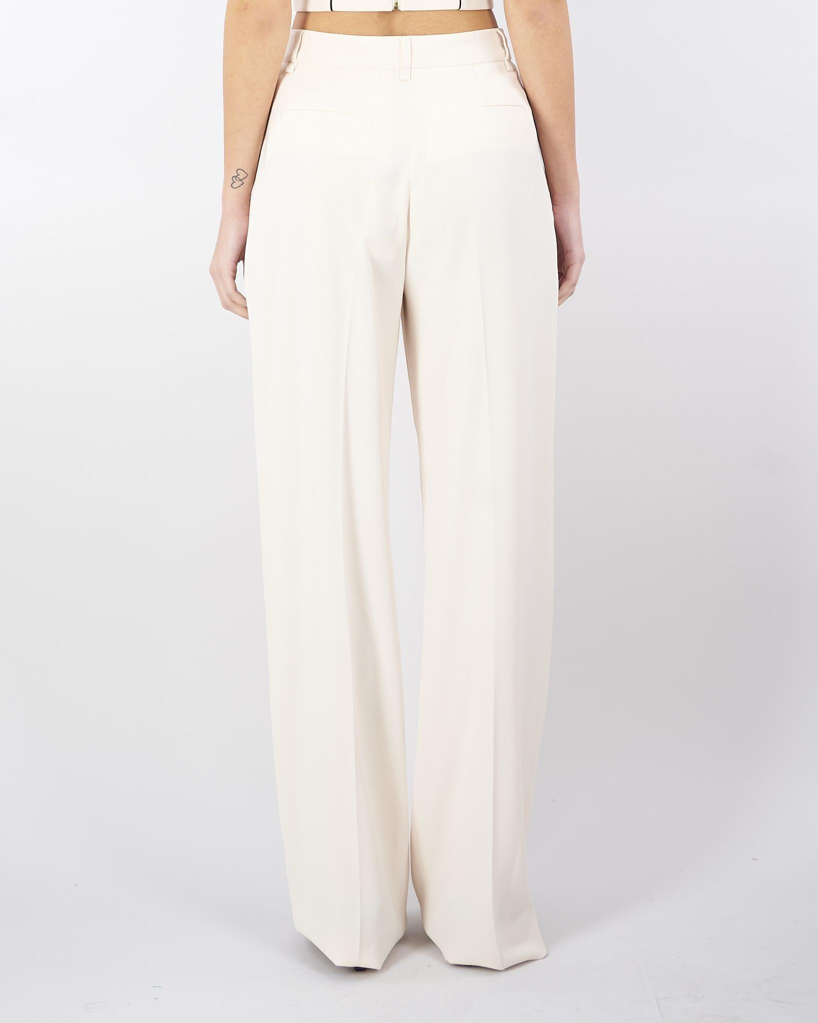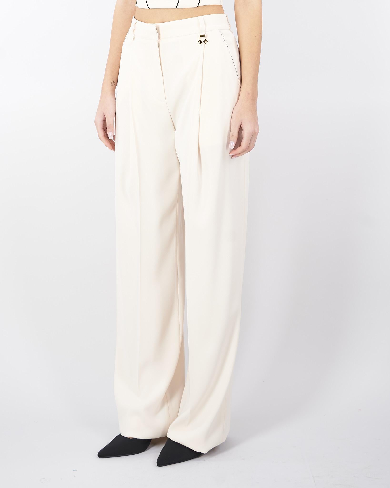 Pantaloni in crêpe leggero con vestibilità regular. Tasche anteriori alla francese e tasche posteriori a filetto. I dettagli di pinces e impunture a contrasto aggiungono definizione. Una nota di luce è data dallo charm con logo in metallo dorato sul passante.
