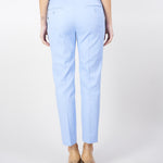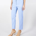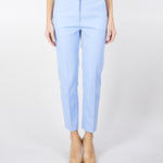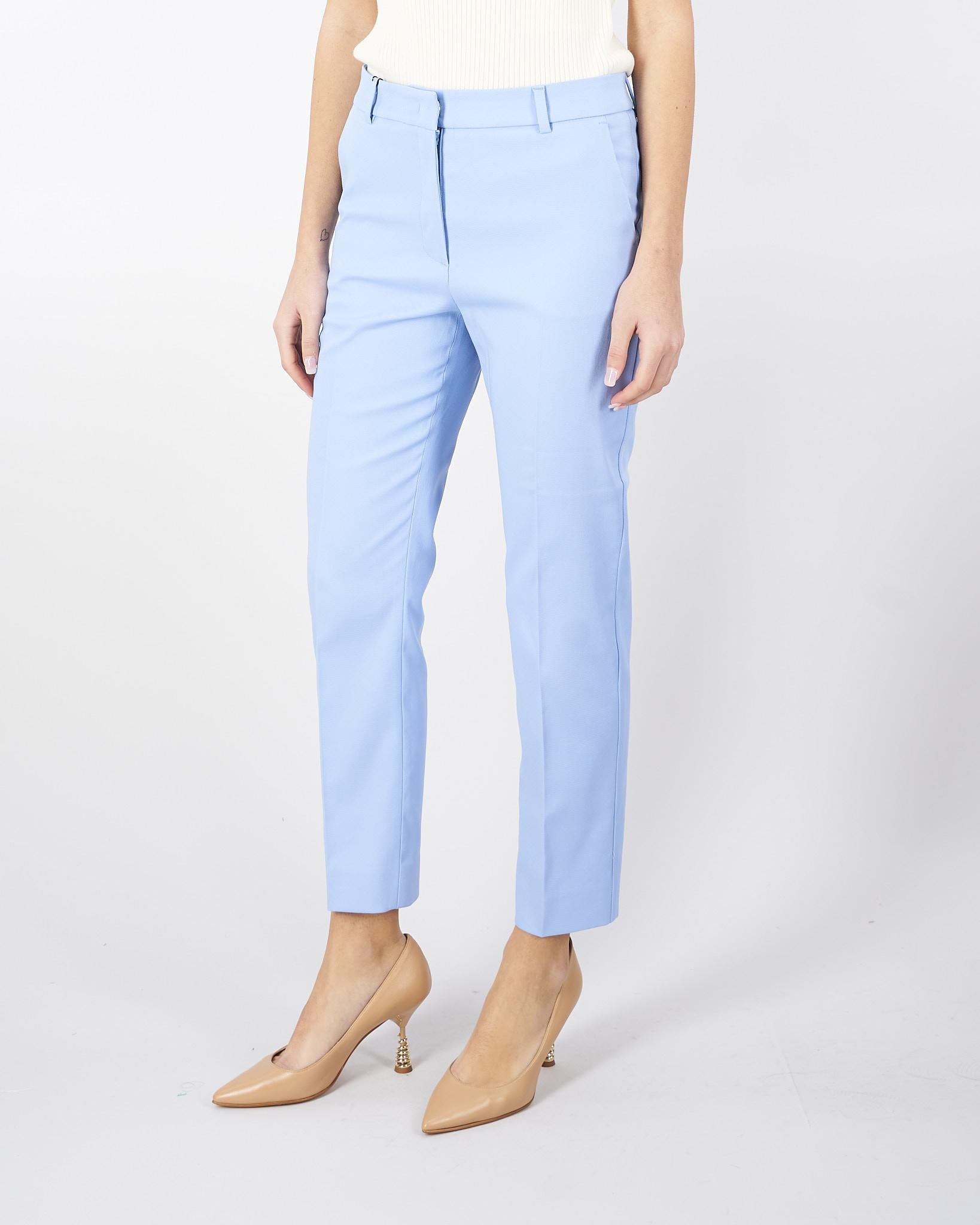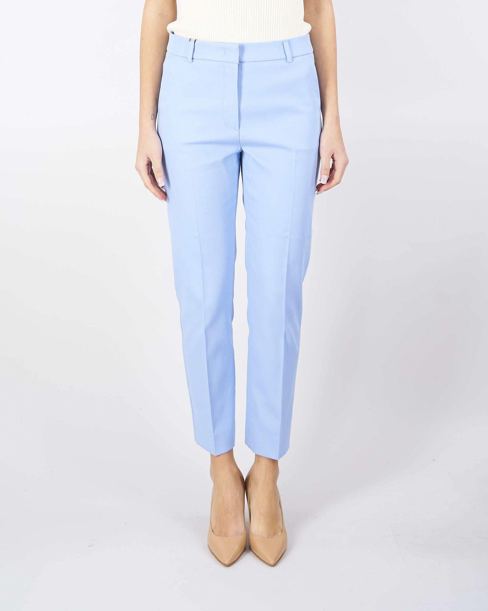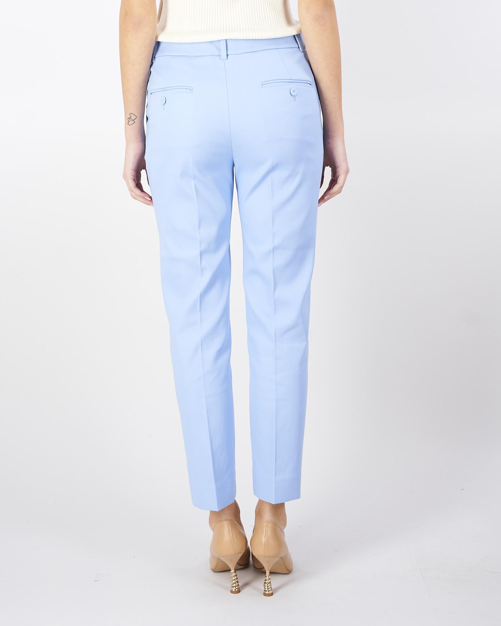 Pantalone a sigaretta in cotone stretch, caratterizzato da una silhouette regular con piega stirata e taglio cropped sopra la caviglia. Il modello è completato da passanti in vita, tasche alla francese sui fianchi e a doppio filetto con bottone sul retro. Chiusura con alto listino in vita, zip con patta e gancetto.