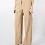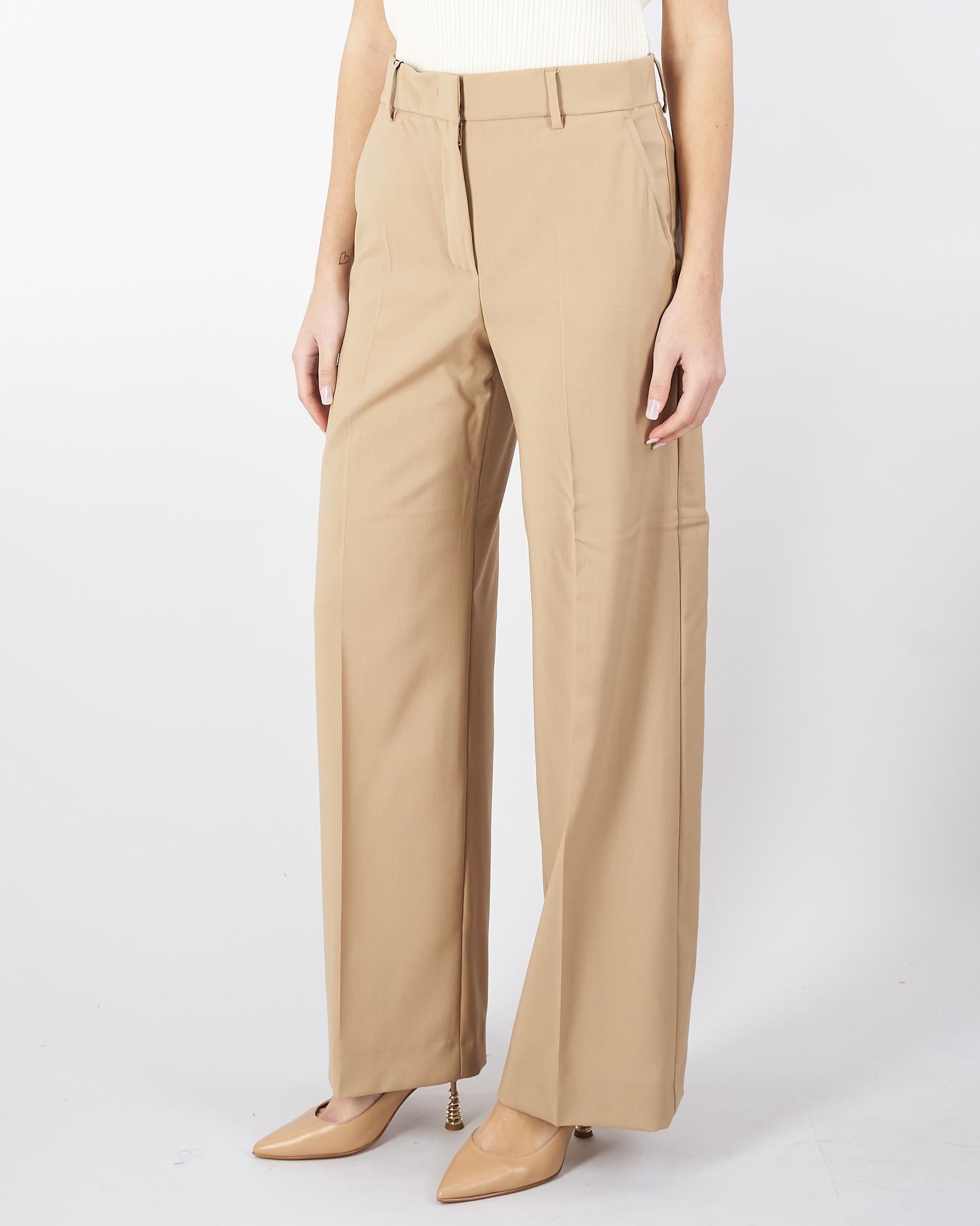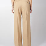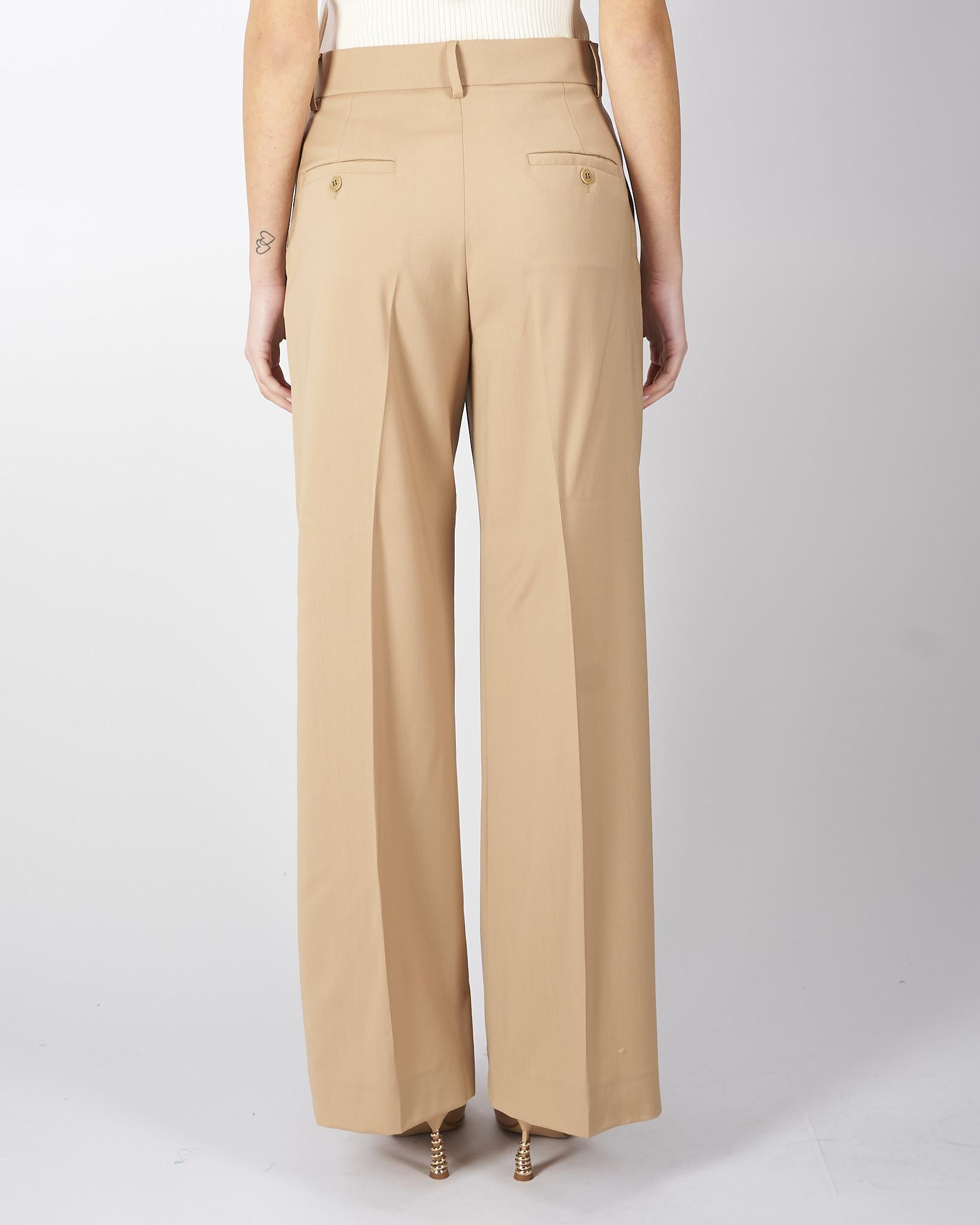 Pantalone a palazzo realizzato in tela di pura lana stretch. Modello dalla linea morbida con gamba dritta e piega stirata, tasche alla francese sui fianchi e tasche a filetto con bottone sul retro. Rifinito con passanti per cintura, si chiude con alto listino in vita, patta con zip e gancetto.