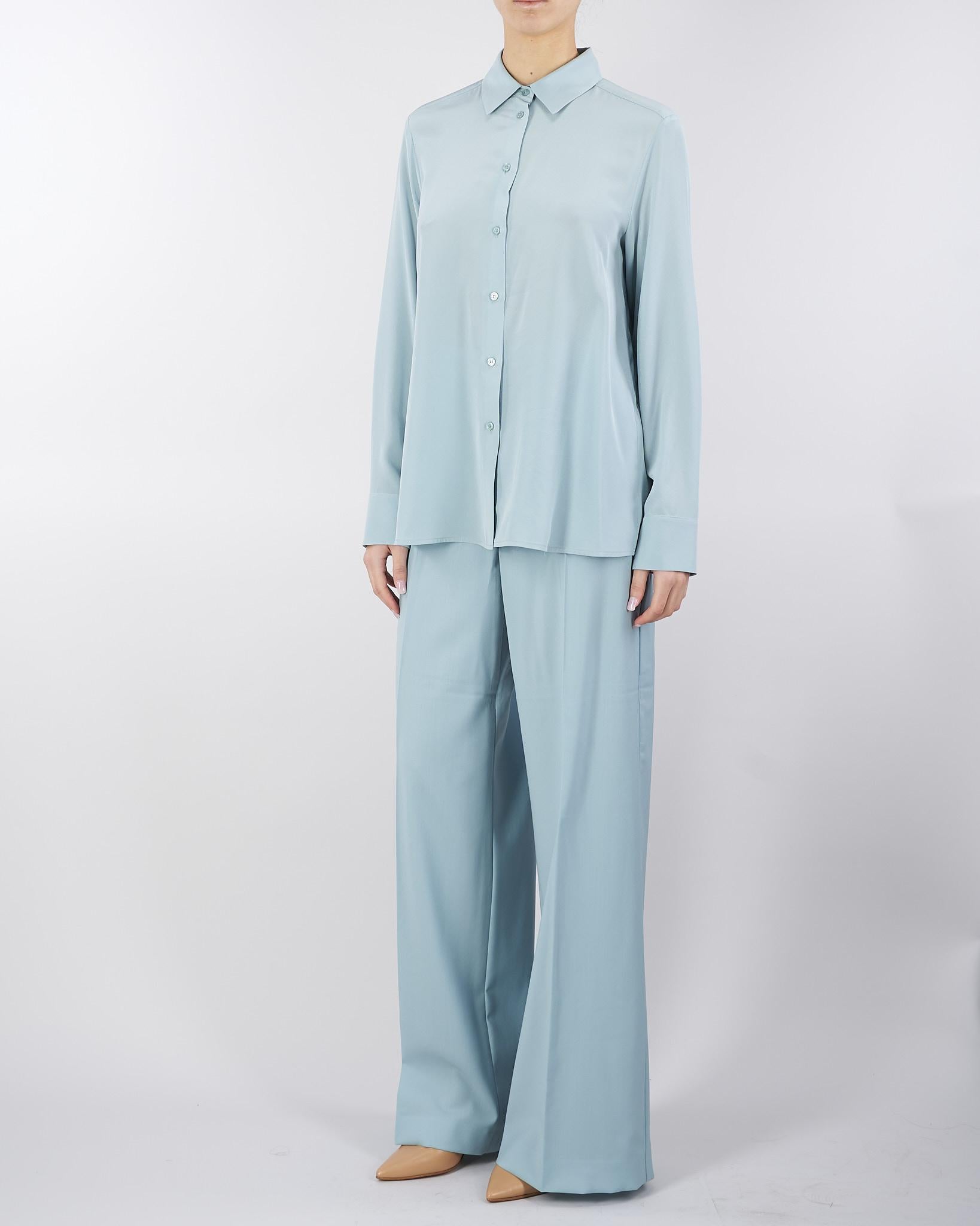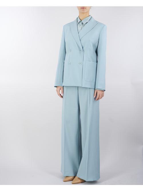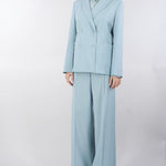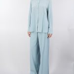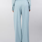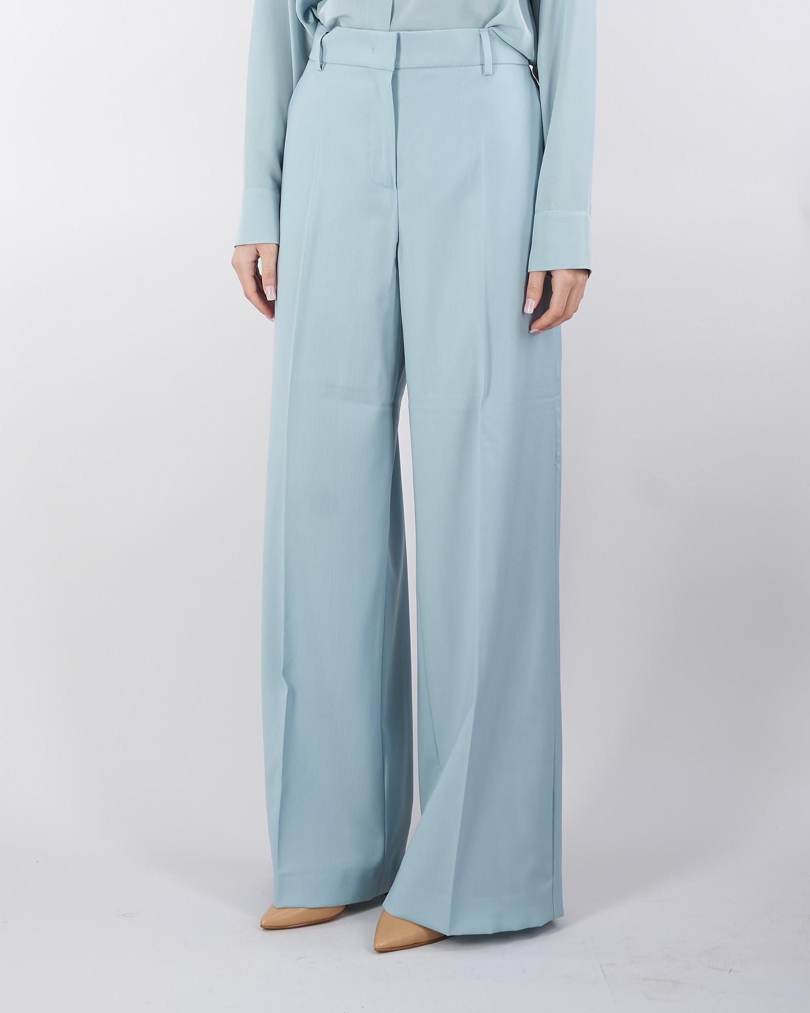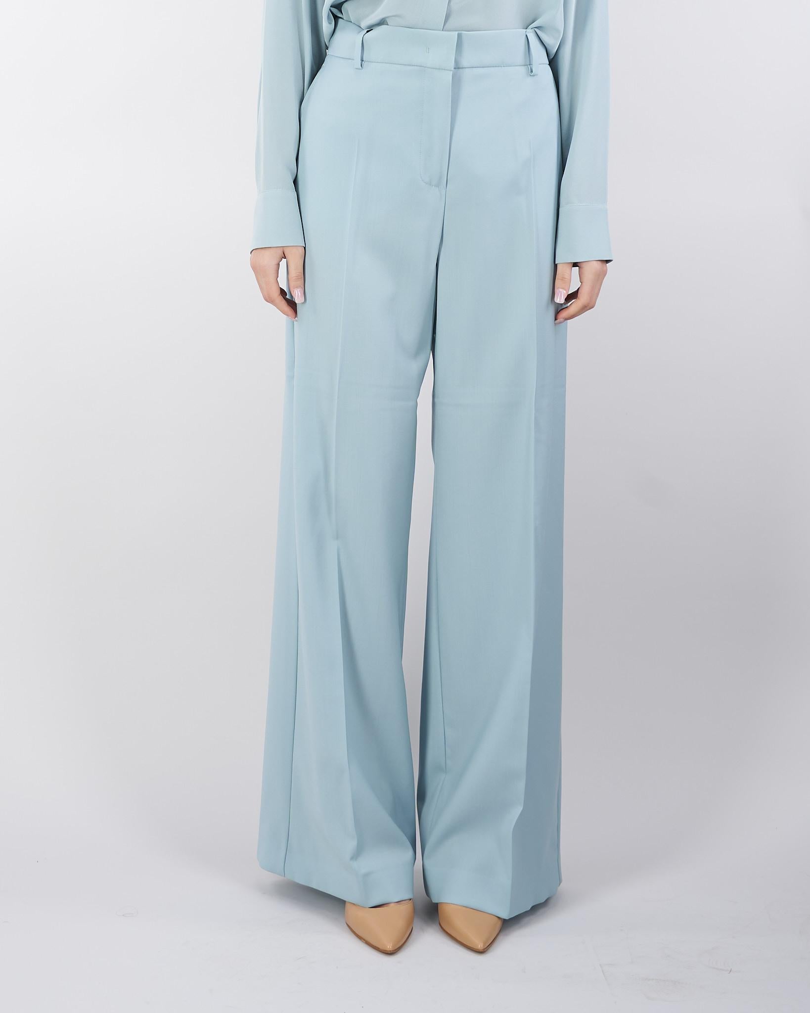 Pantalone a palazzo realizzato in tela di pura lana stretch. Modello dalla linea morbida con gamba dritta e piega stirata, tasche alla francese sui fianchi e tasche a filetto con bottone sul retro. Rifinito con passanti per cintura, si chiude con alto listino in vita, patta con zip e gancetto.