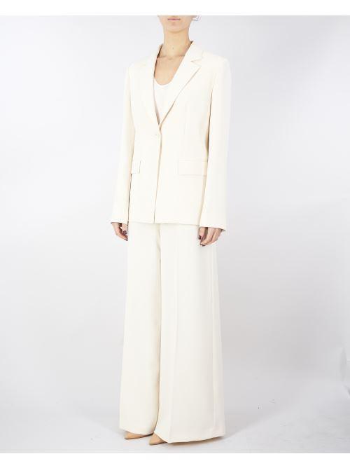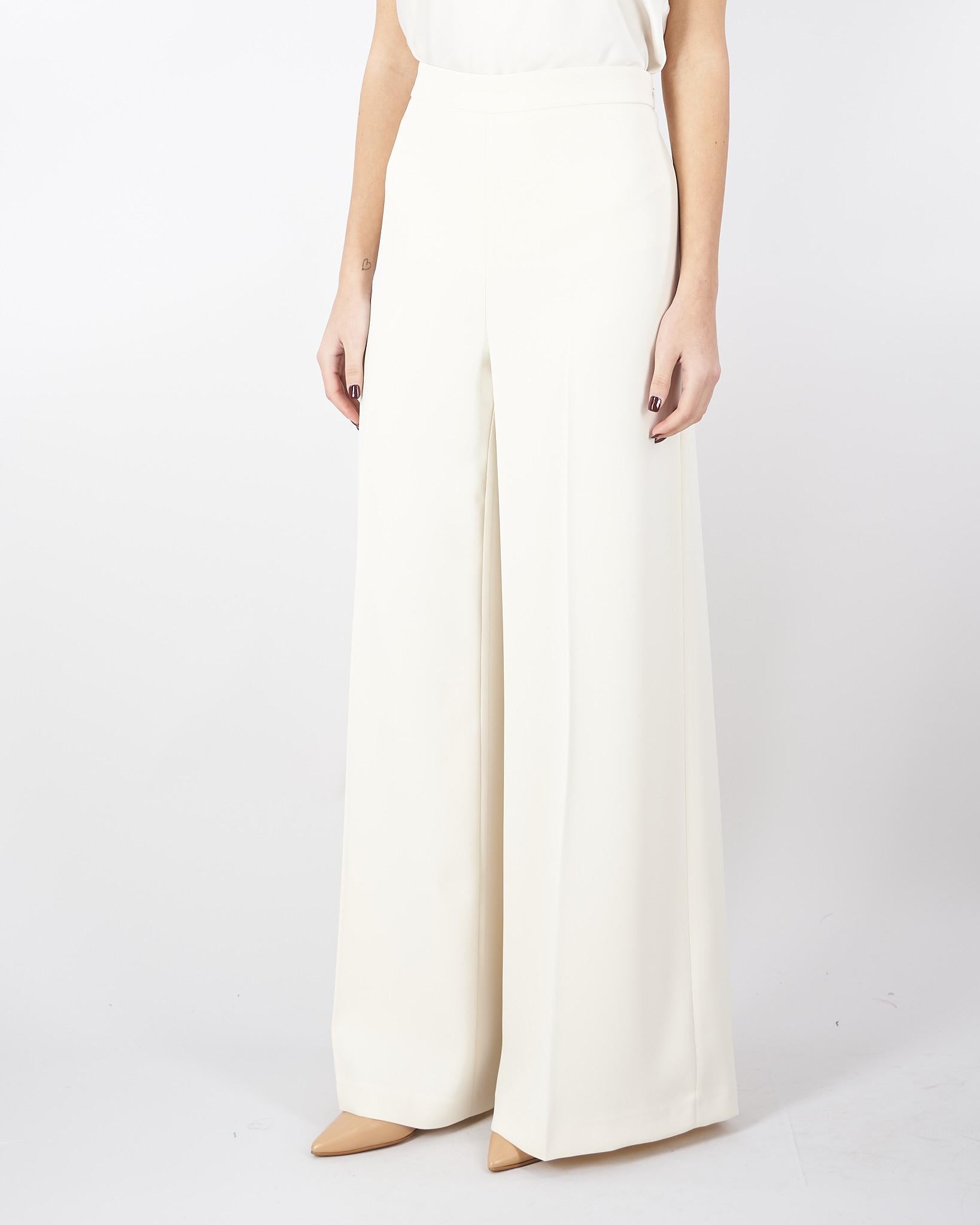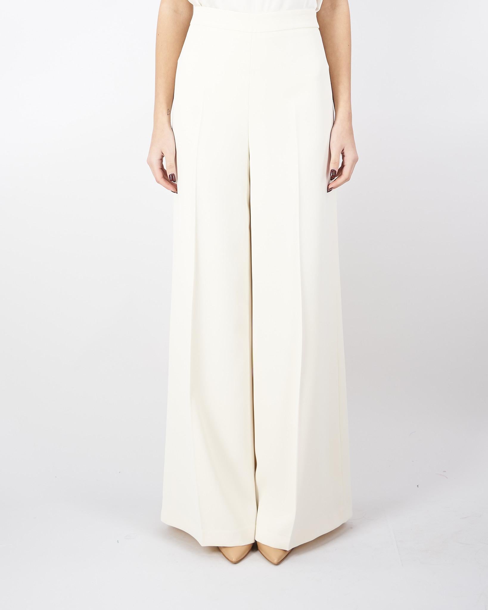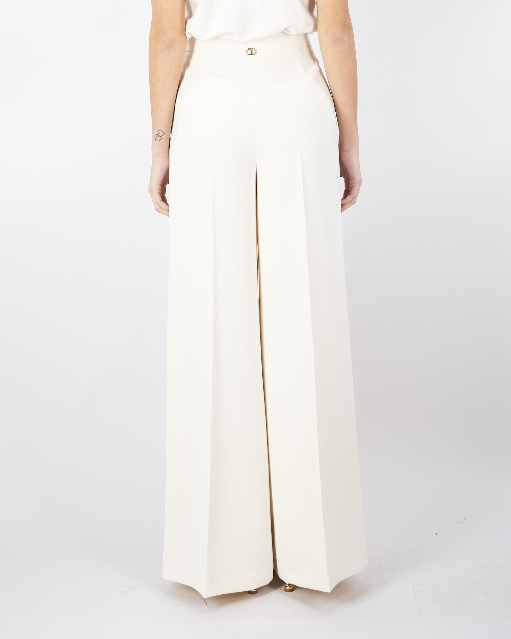 Pantaloni made in Italy in crêpe fluido stretch con vita regular, chiusura con zip invisibile al fianco, piega stirata, placchetta logo Oval T sul retro, linea a palazzo.