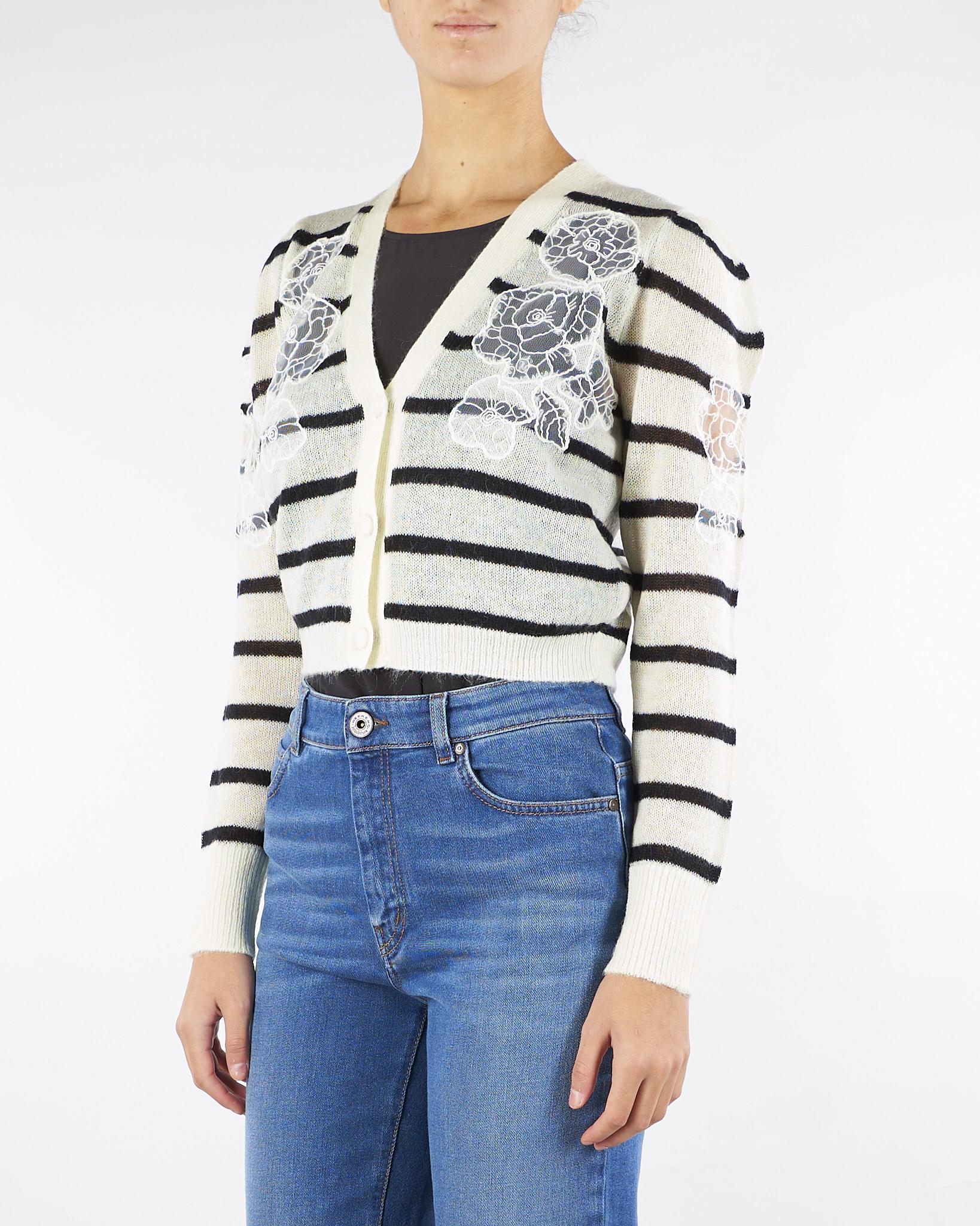 Cardigan in misto mohair con lavorazione bicolore a righe e dettagli di pizzo applicati a ricamo e a intarsio. Ha scollo a V, maniche lunghe, profili rifiniti a costine, placchetta logo Oval T sul retro, linea morbida.