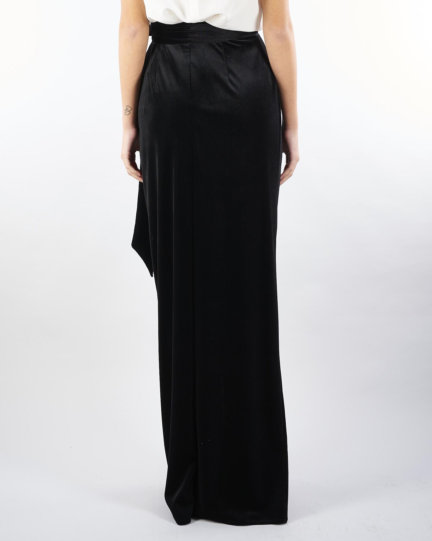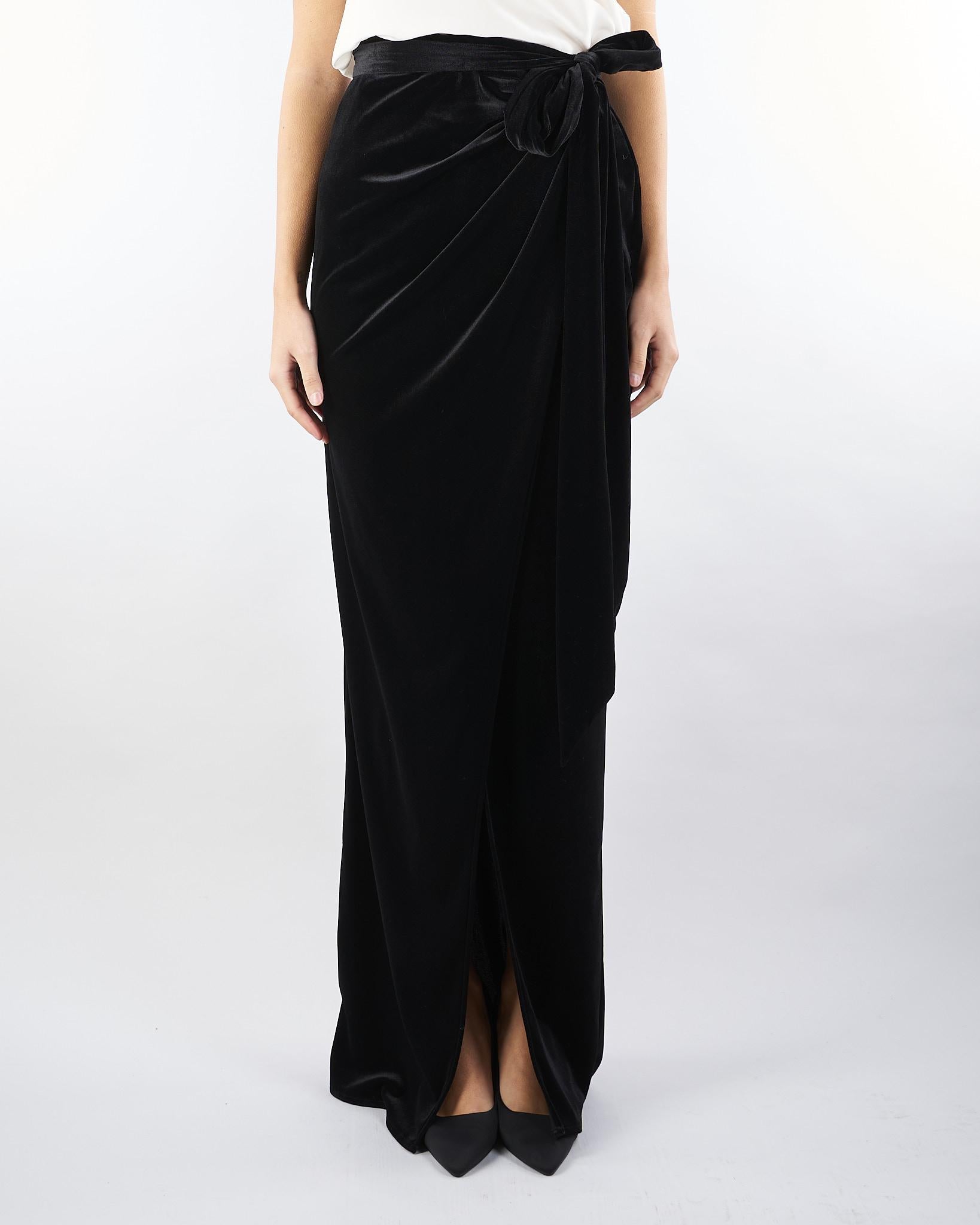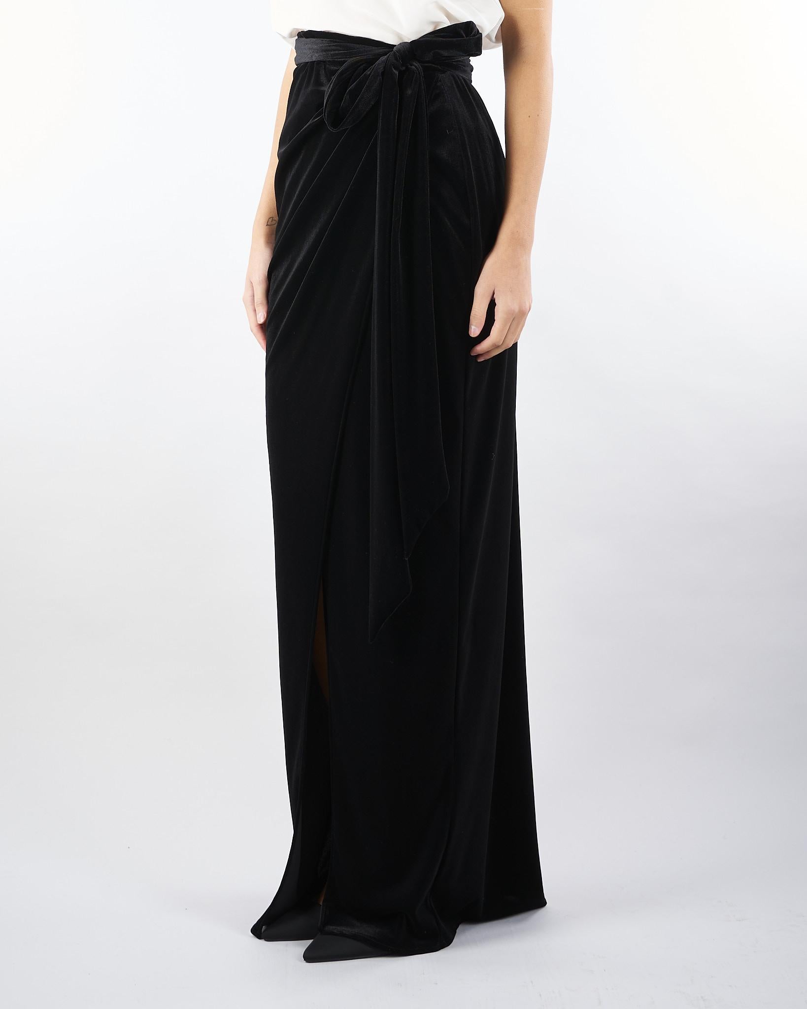 Gonna in velluto di Atelier Legora. Modello lungo con vita alta e fiocco. Spacco centrale.