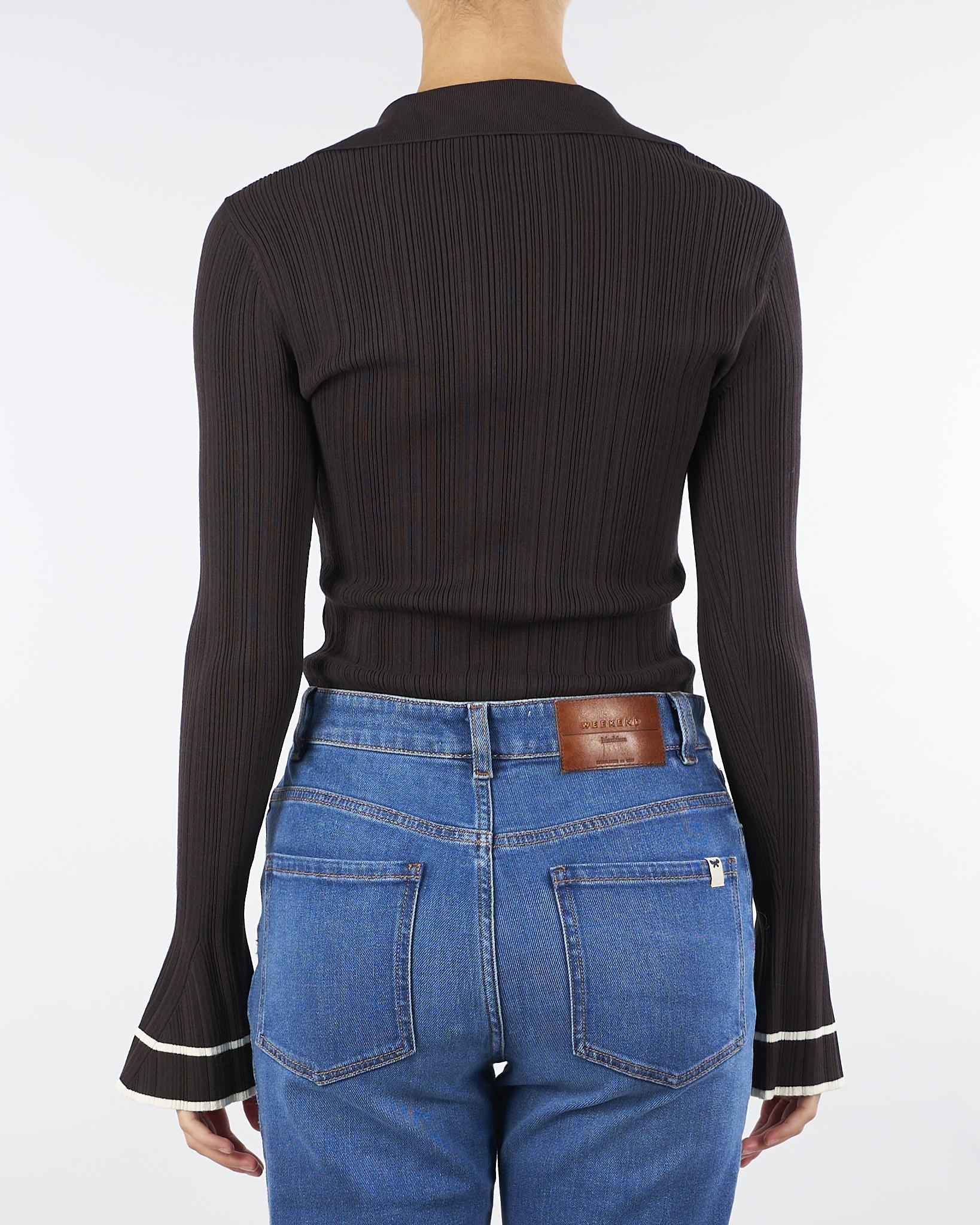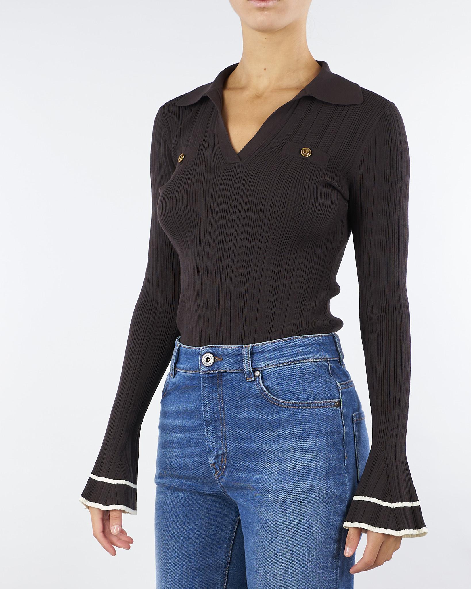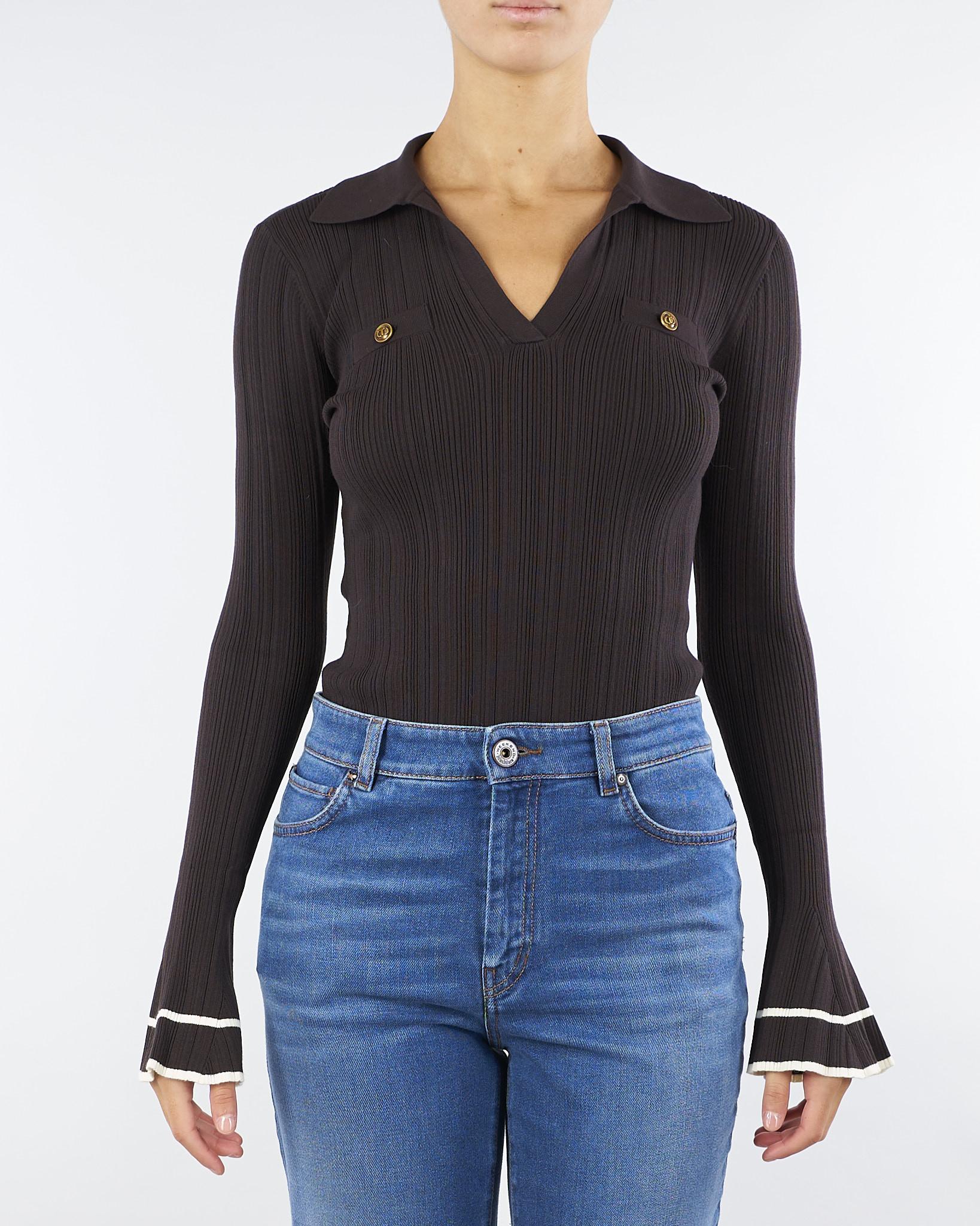 Maglia a costine di Twinset. Modello polo con colletto e scollo a V. Maniche lunghe con polsini ampi. Dettaglio profili sui polsi a contrasto. Bottoni gold sul petto. Vestibilità aderente.