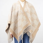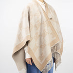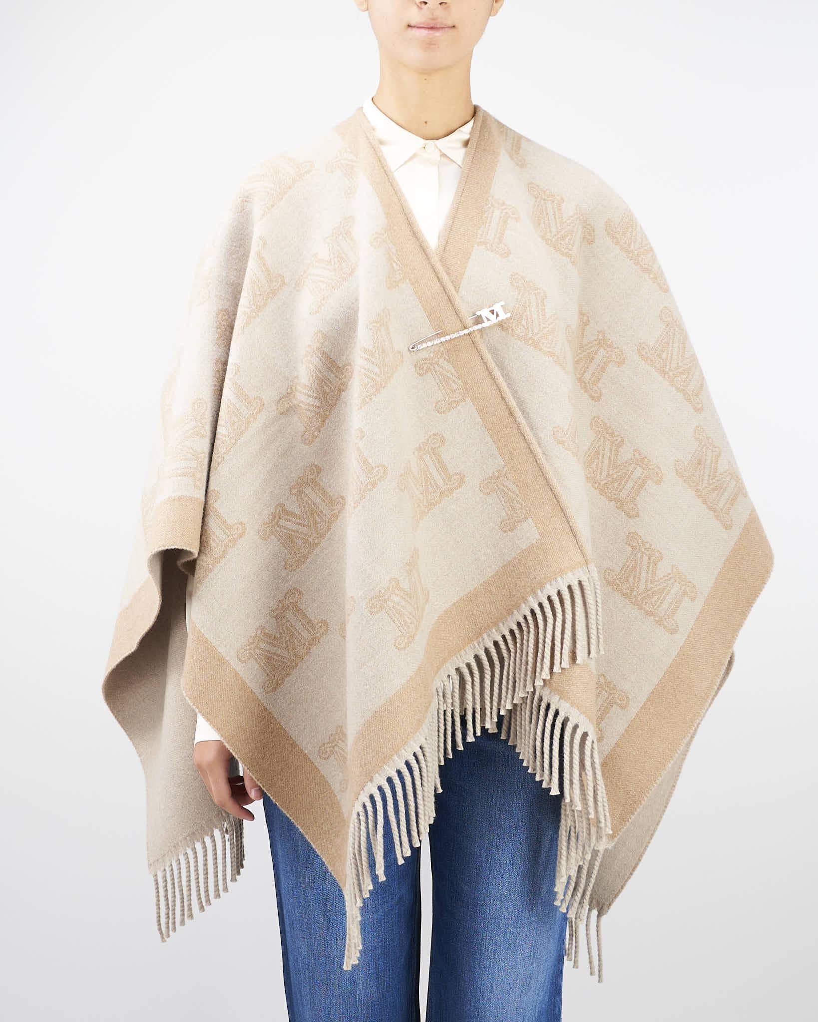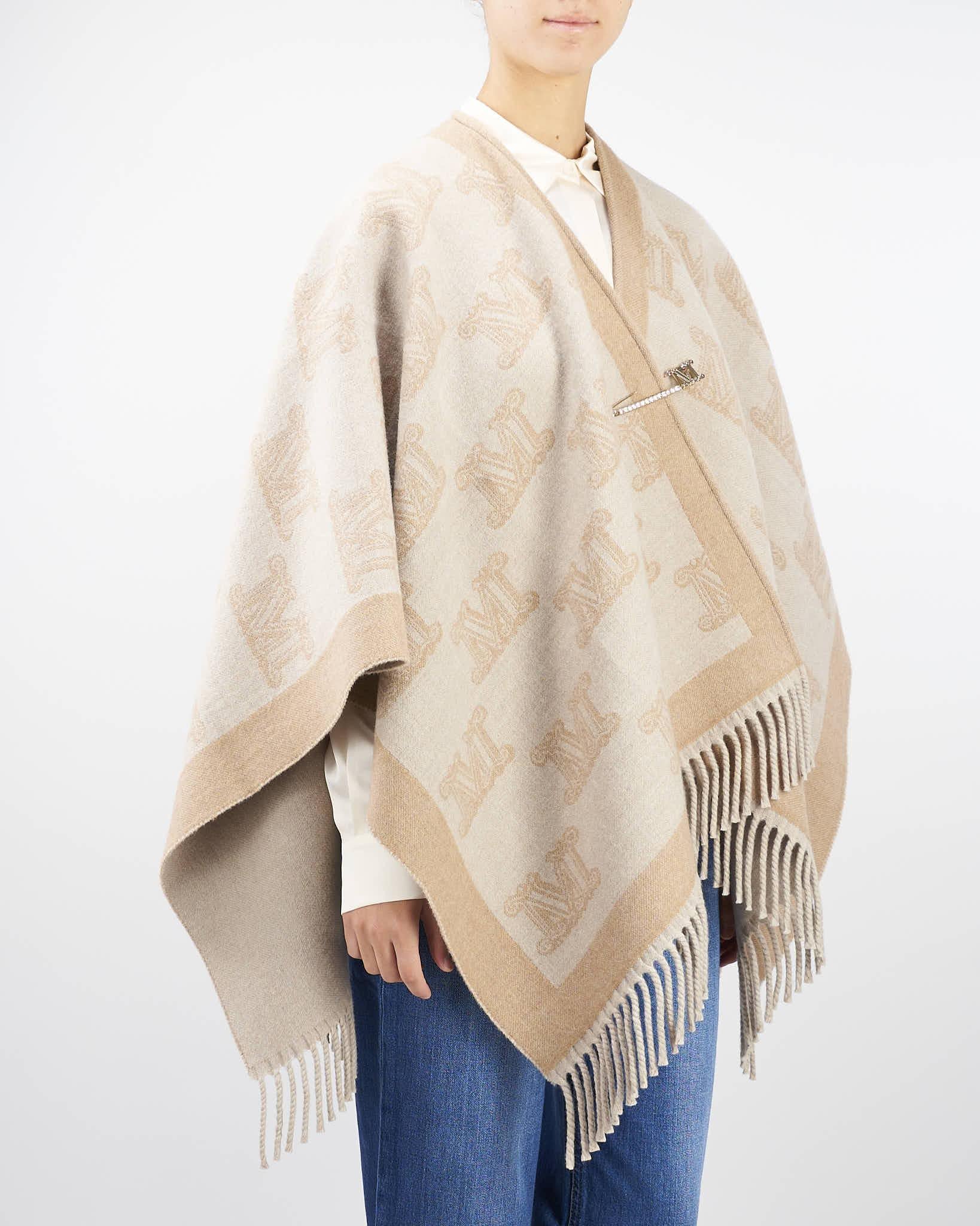 Poncho in doppio tessuto di pura lana, lavorato con motivo jacquard M Monogram all over. Vestibilità ampia e avvolgente, rifinita con frange sul fondo. Impreziosito con spilla monogram abbinata.