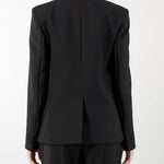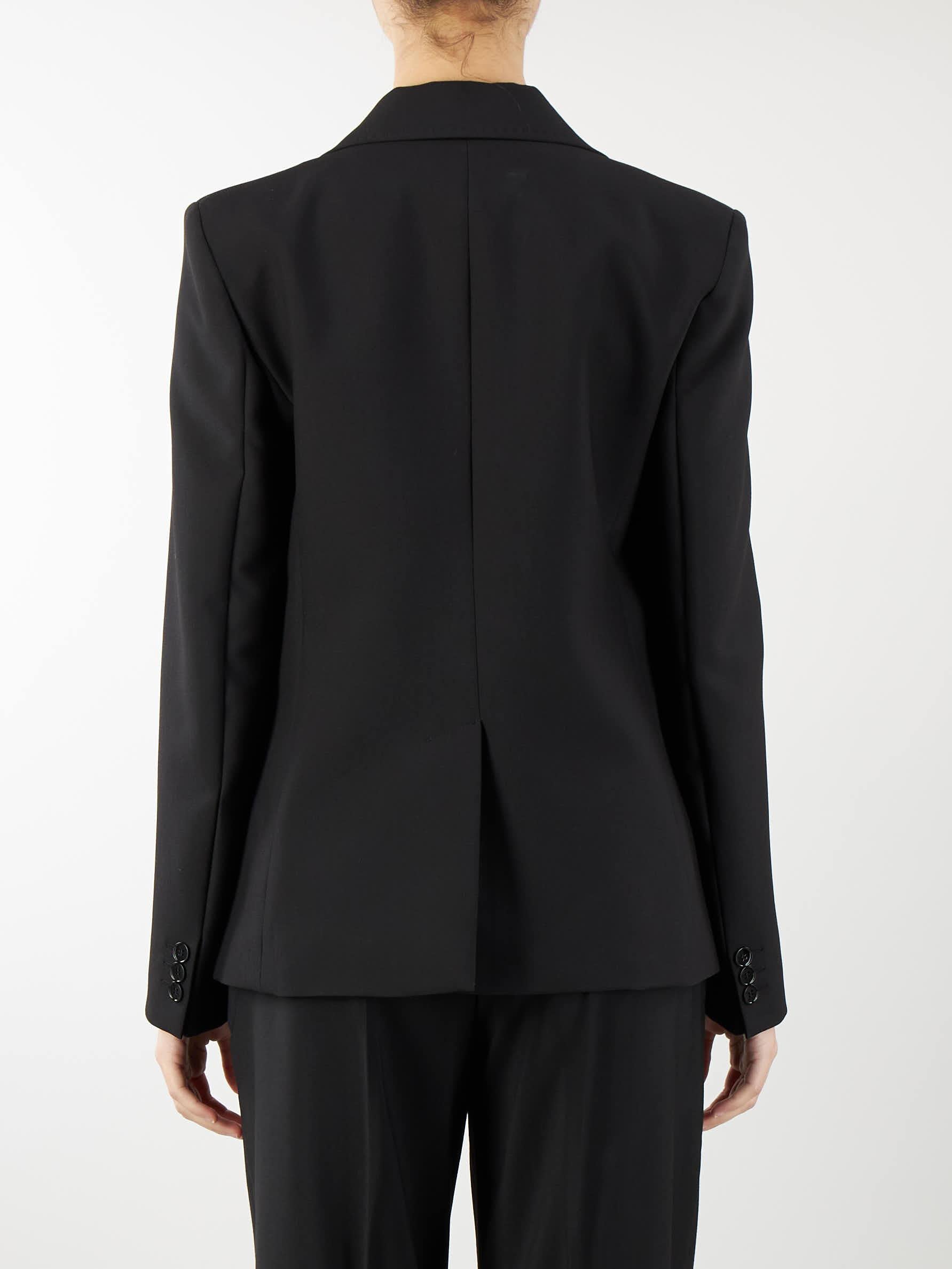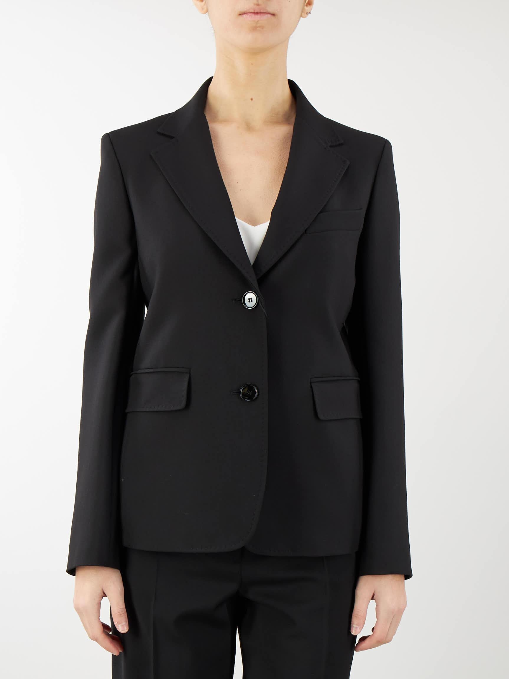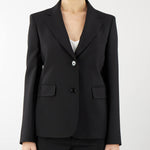 Blazer monopetto in doppia tela di viscosa stretch, caratterizzato da una silhouette femminile con classico collo a rever, taschino sul petto e tasche con patta sul davanti. Modello foderato, rifinito con spacco centrale sul retro. Chiusura con due bottoni.