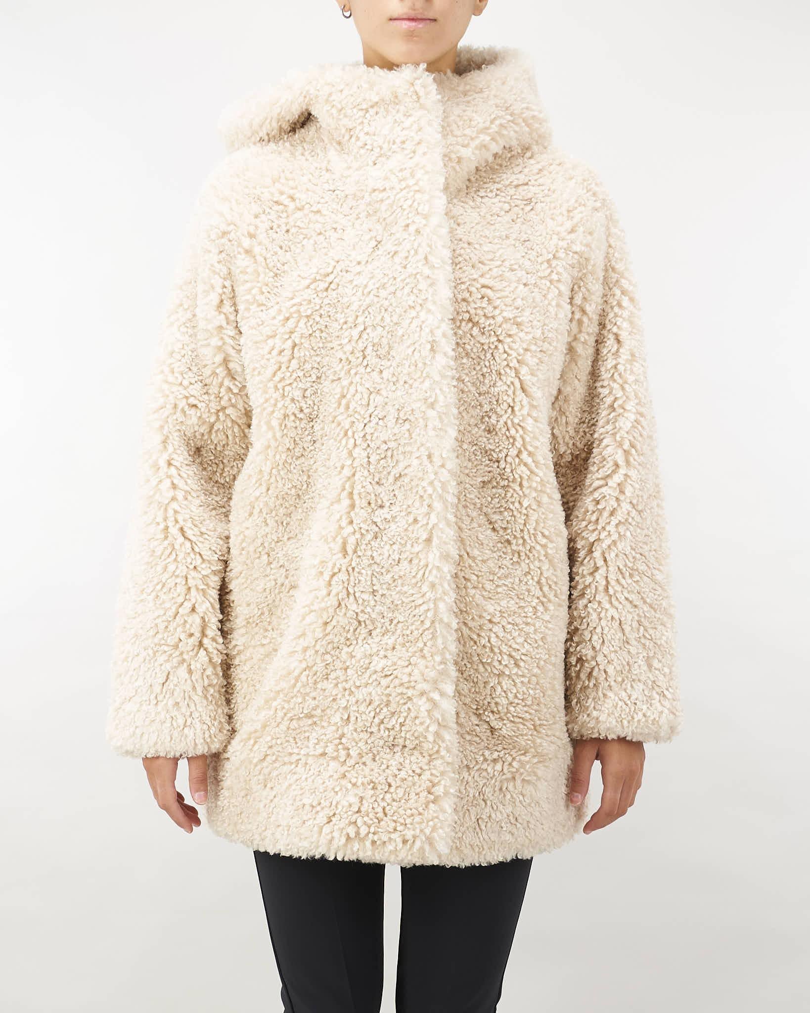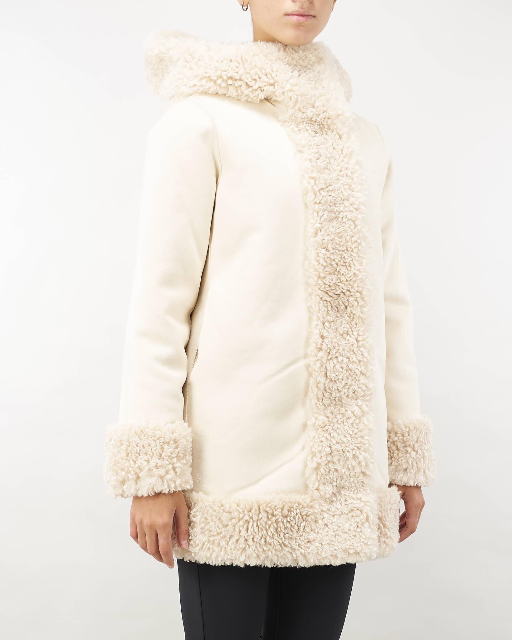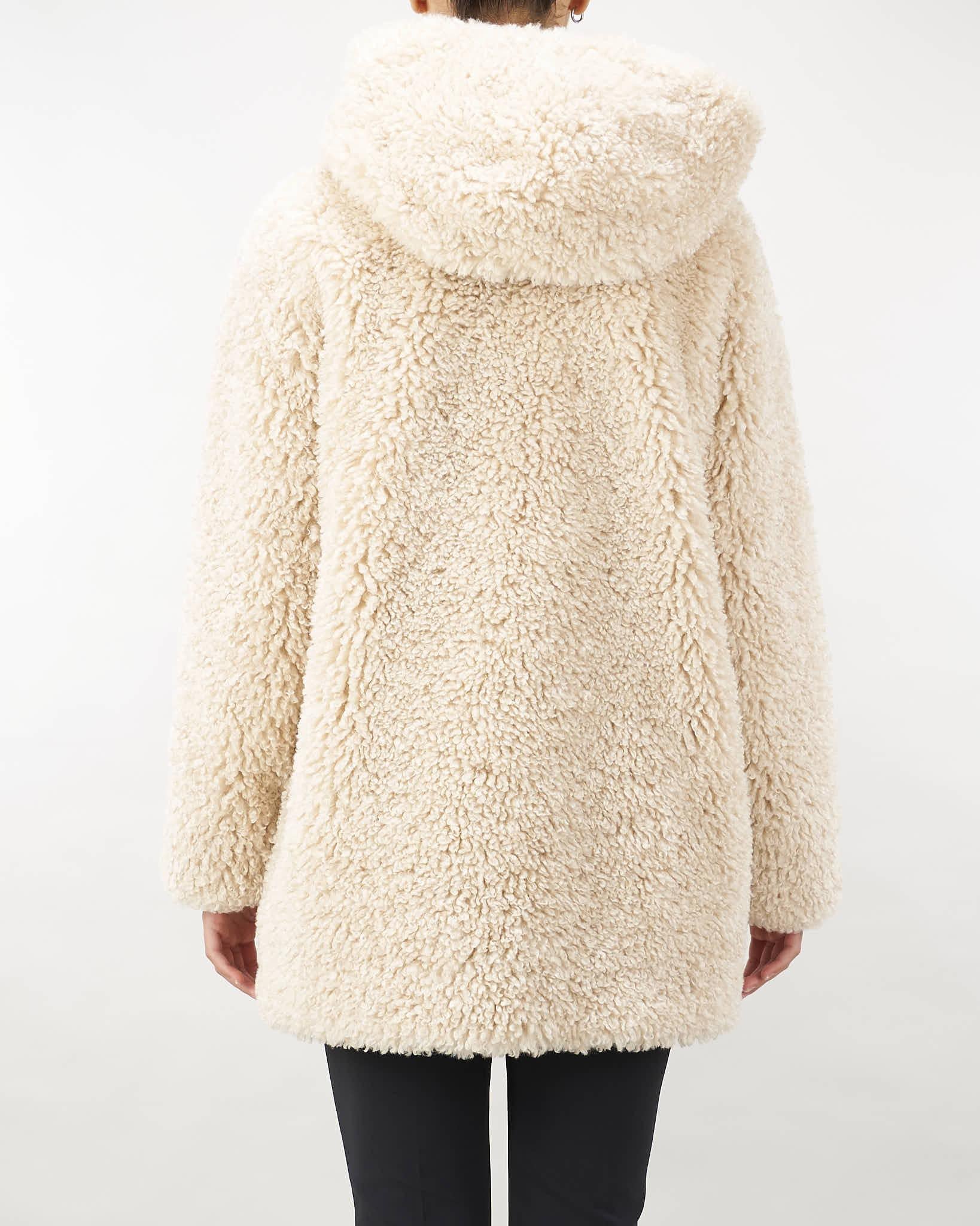 Il cappotto dall'atmosfera retrò trova una nuova chiave contemporanea nelle linee essenziali e nell'avvolgente cappuccio, che unisce la funzionalità alla raffinatezza. Caratterizzato da un elegante effetto sherpa, presenta una profonda chiusura nascosta che ne ripulisce il design, impreziosito dal tocco di stile delle bordature a contrasto. Realizzato in eco pelliccia premium, il capospalla offre al tatto la morbidezza avvolgente del vello dell'agnello. La reversibilità consente due varianti in un unico capospalla. Estremamente versatile e disponibile in un'estroversa palette di colori, si presta a diverse combinazioni, dai look classici con tonalità neutre agli outfit con stampa allover per un'eleganza retrò che non passa inosservata.