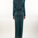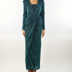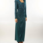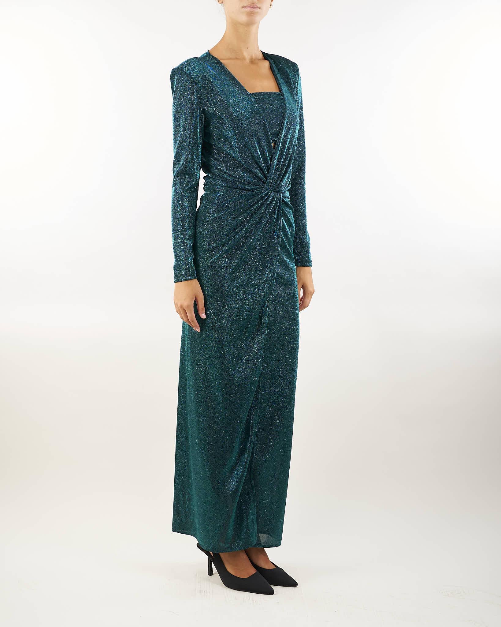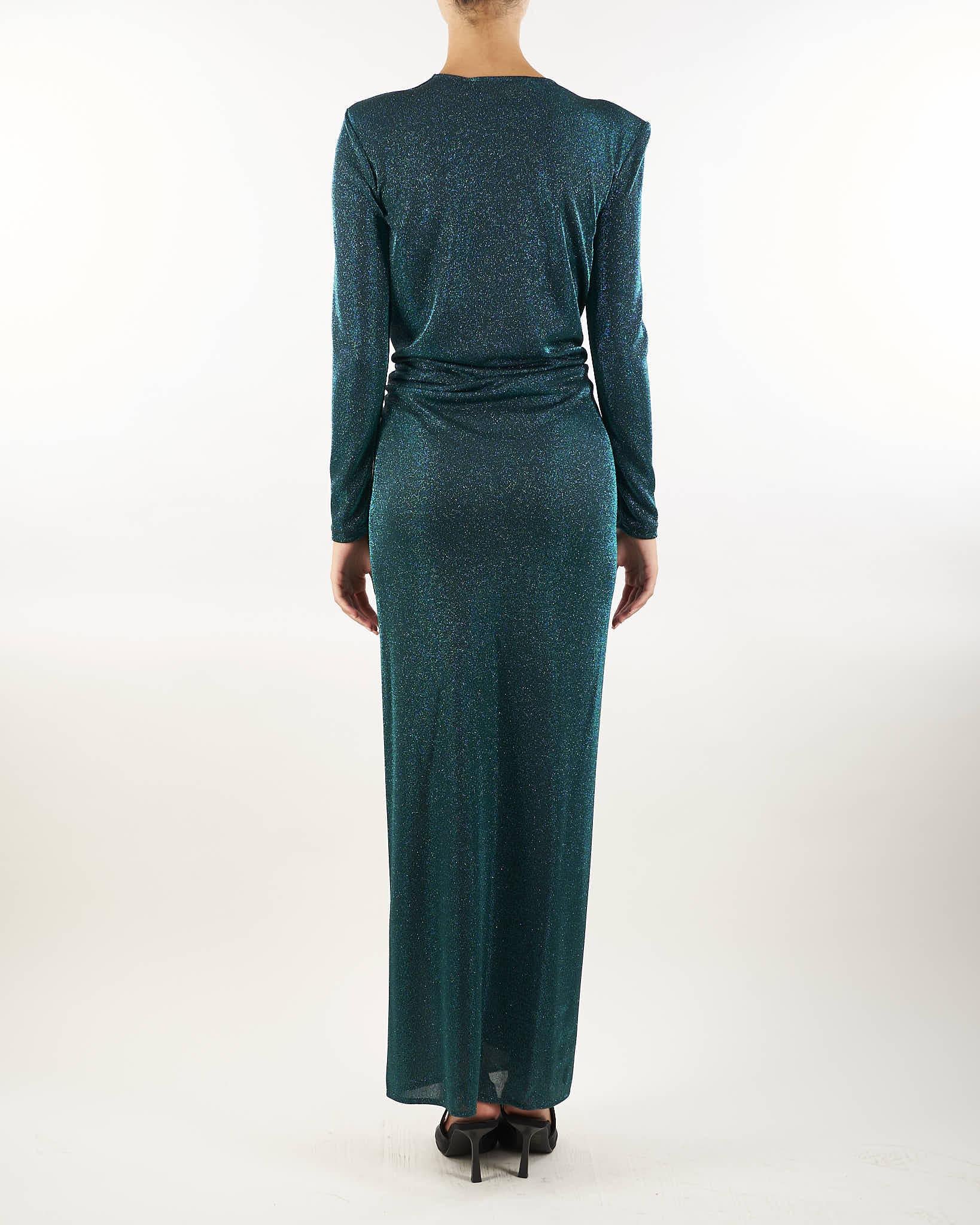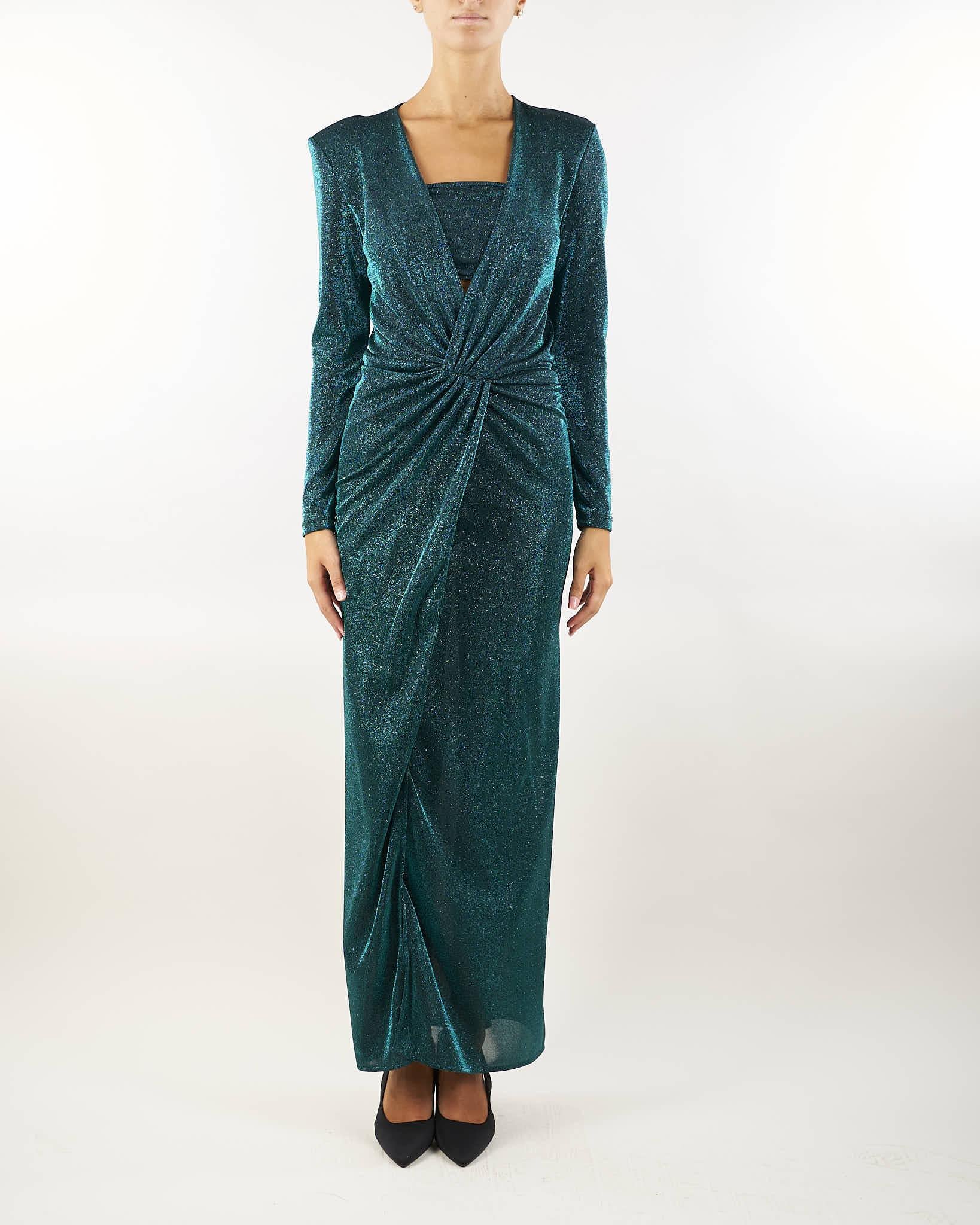 Abito lungo in jersey lurex di Simona Corsellini. Modello con scollo a V effetto nodo incrociato e spacco nel centro davanti. Manica lunga e spalline.