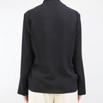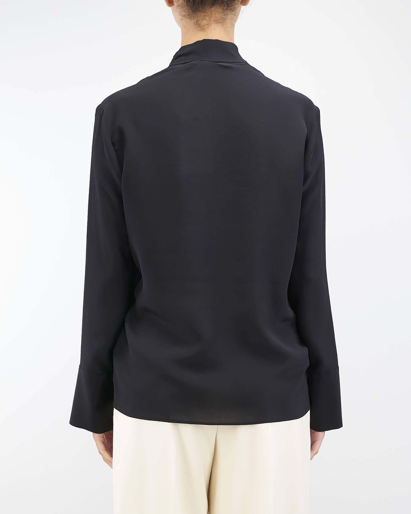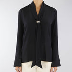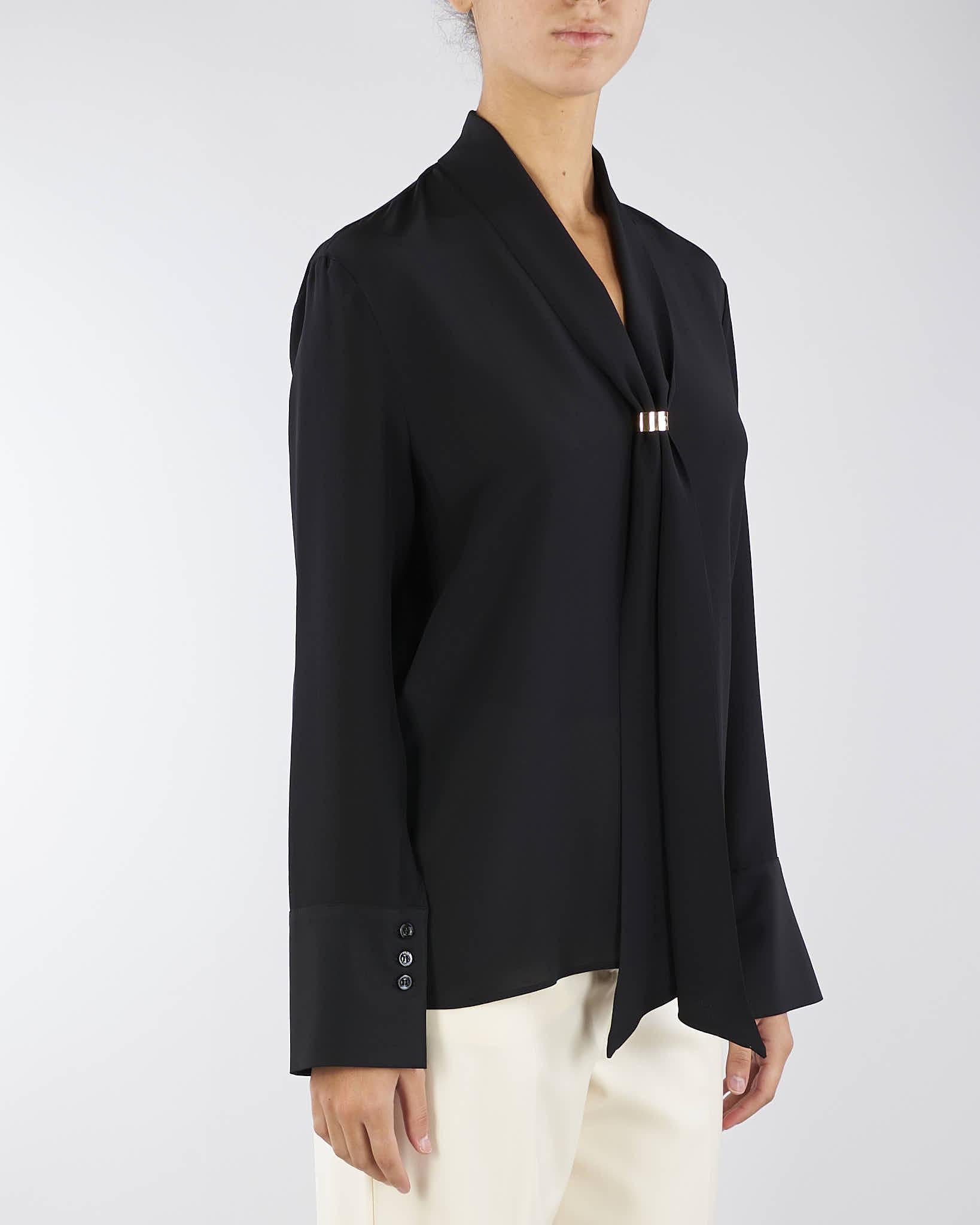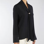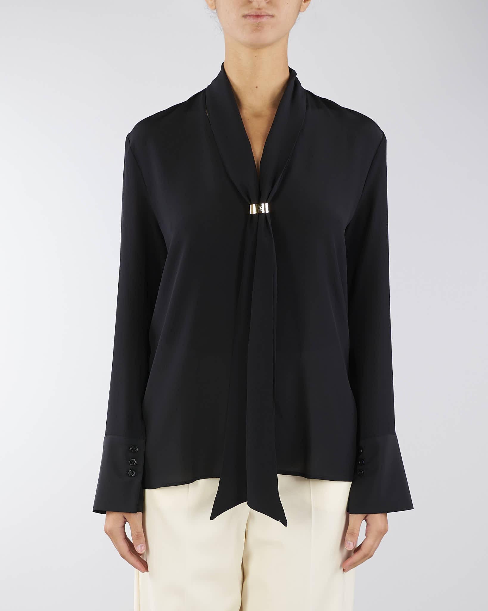 Blusa in pura seta di Simona Corsellini. Modello con collo foulard e maniche lunghe con polsini. Accessorio gold con logo.