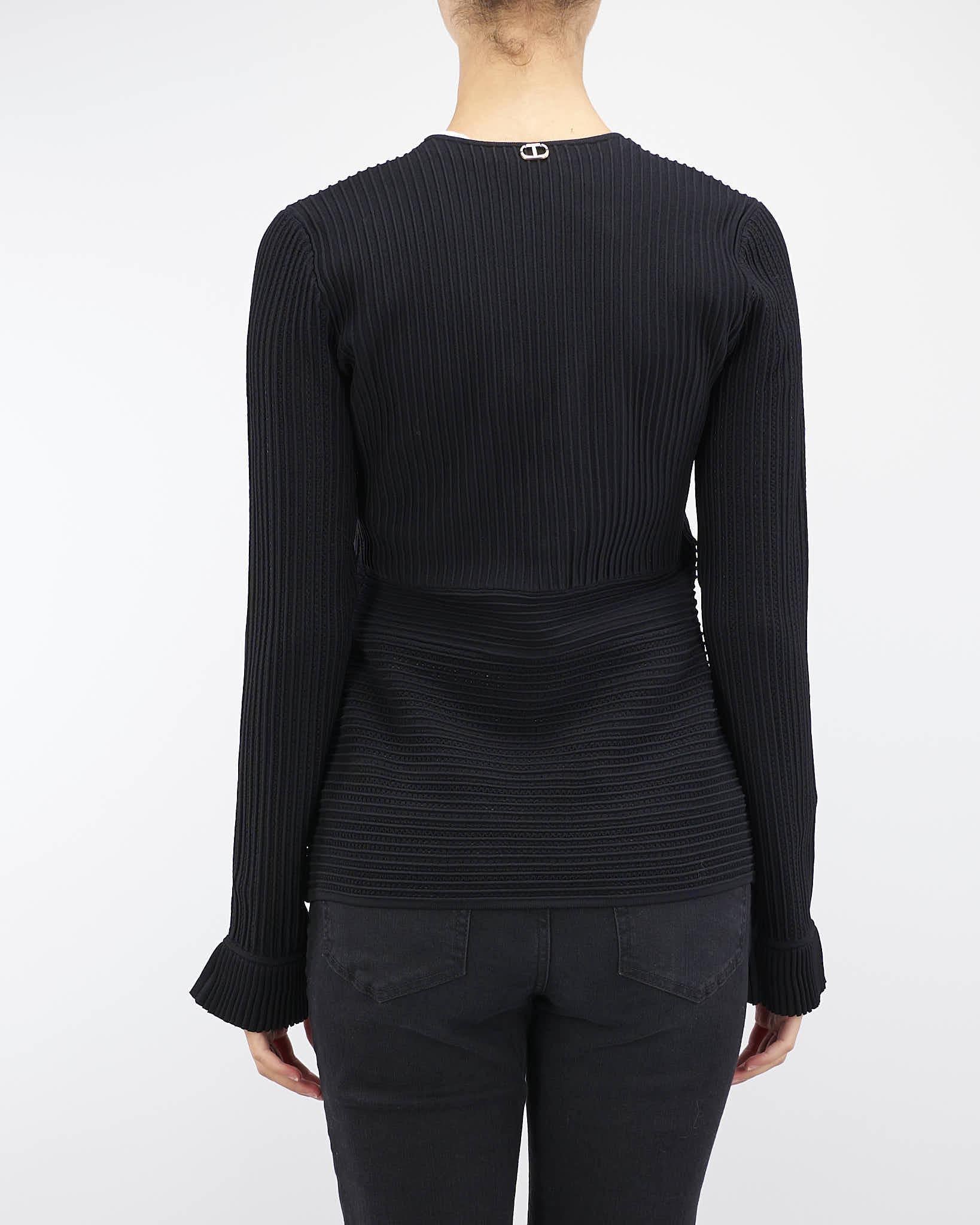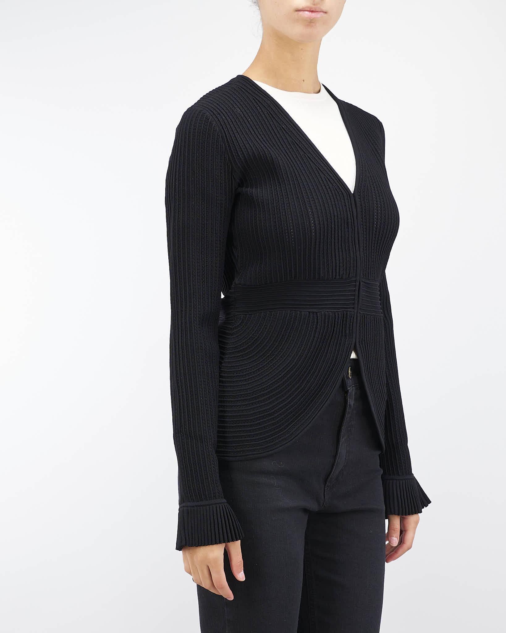 Giacca in maglia misto viscosa stretch con lavorazione a tubetti che creano giochi di punti e disegnano la silhouette. Ha scollatura a V, chiusura con uncinelli, maniche lunghe con polsi leggermente svasati, fondo arrotondato, linea fitted.