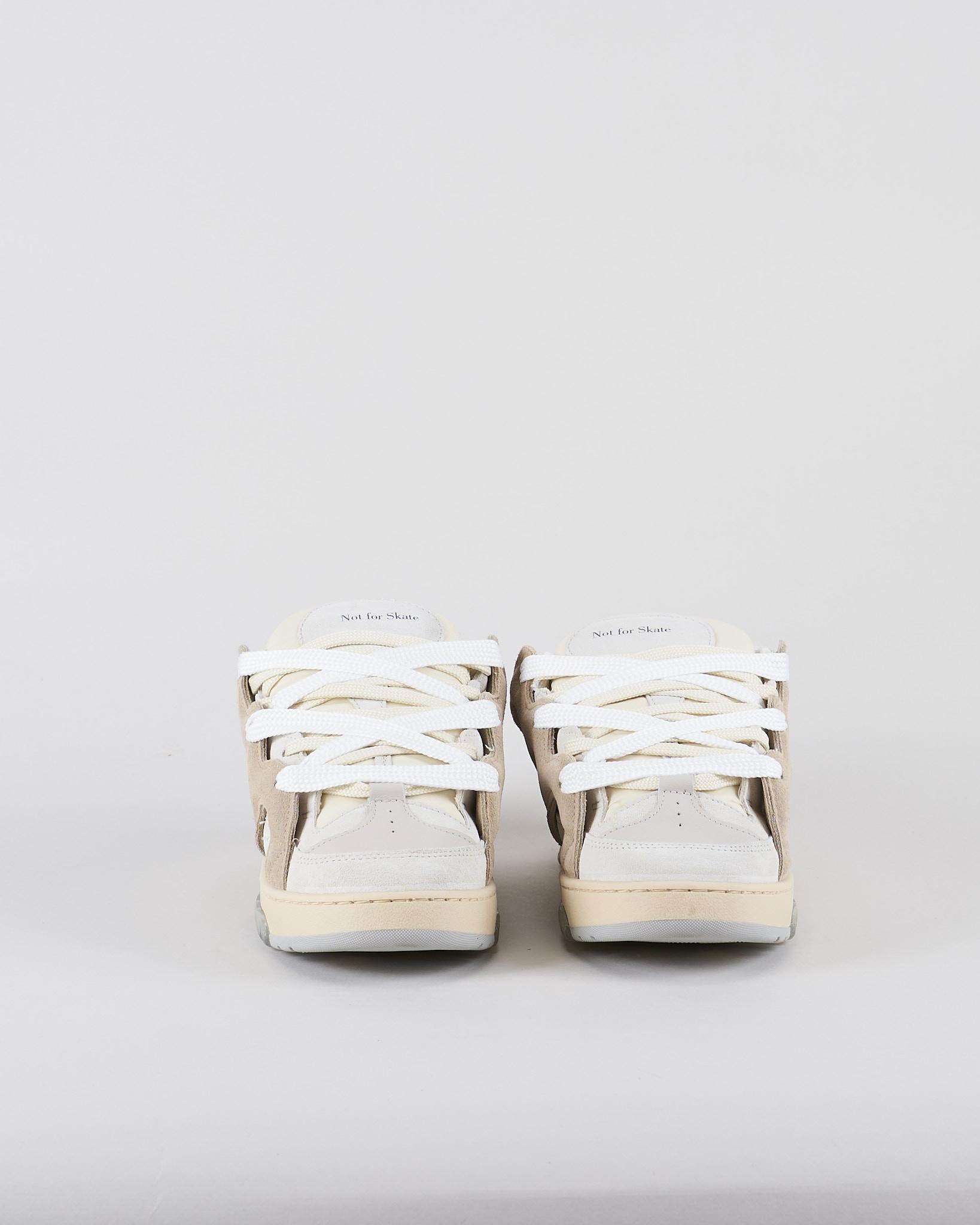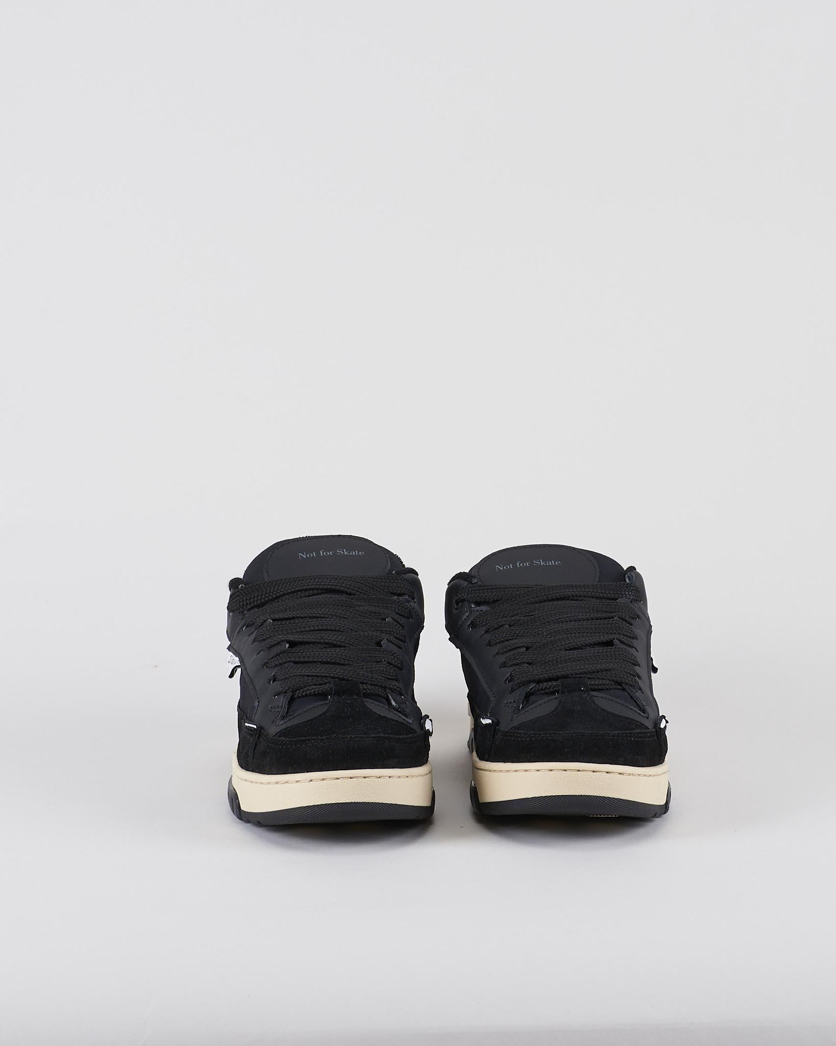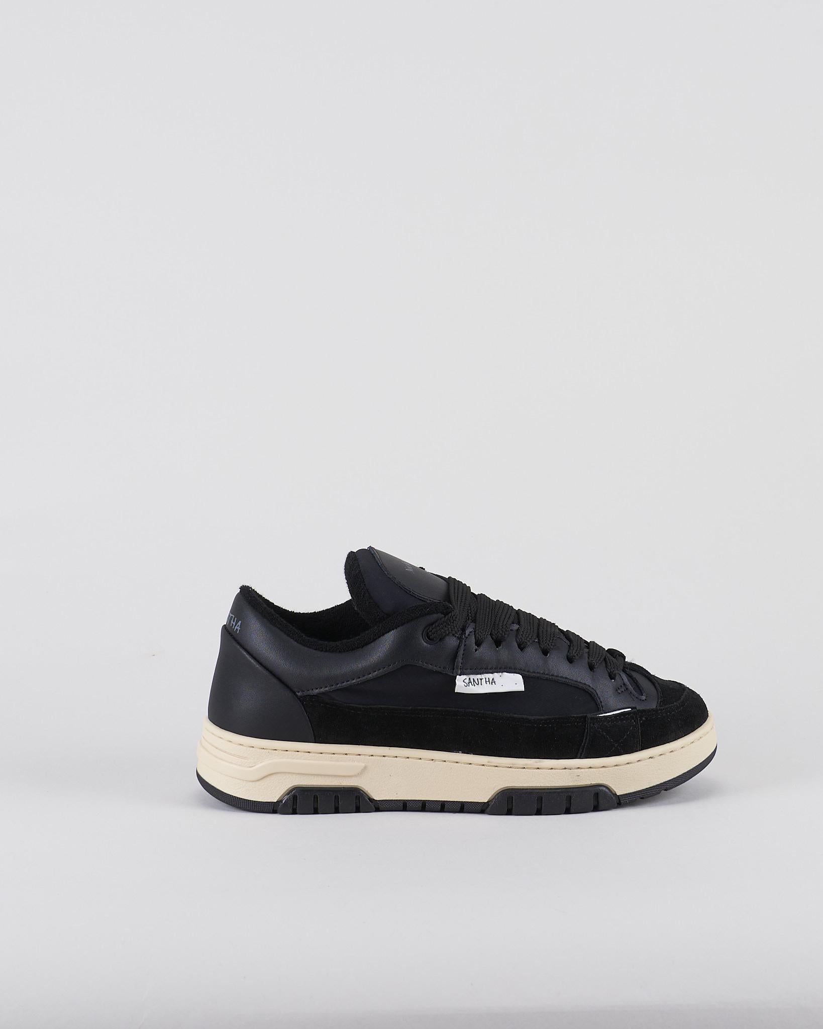Sneakers Santha x Paura. Tomaia in nylon e pelle e impunture a vista. Sovrapposizioni in suede hairy. Maxi allacciatura sul fronte. Linguetta imbottita con label logata "Santha Not For Skate" cucita. Collarino imbottito e talloncino rinforzato con logo stampato sul retro. Interno in spugna di cotone e soletta rialzata in pelle. Suola cucita in gomma.
