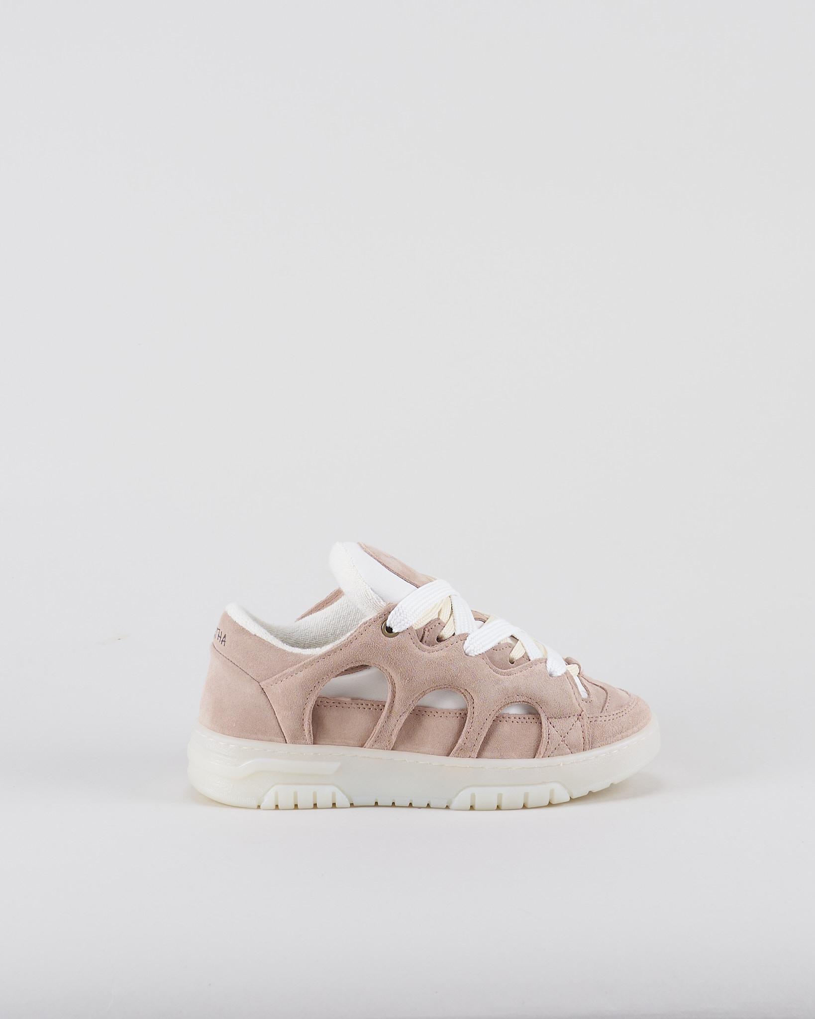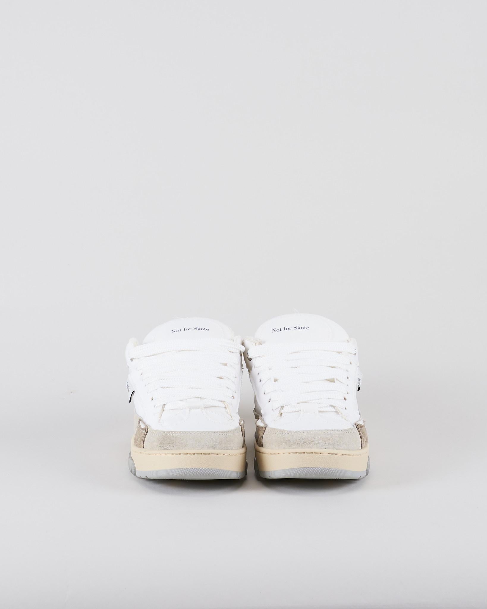 Sneakers Santha x Paura. Tomaia in nylon e suede e impunture a vista. Doppia allacciatura sul fronte in due dimensioni. Linguetta imbottita con inserto logato "Not For Skate" pressofuso. Micro label logata in pelle cucita sul lato esterno. Collarino imbottito e talloncino rinforzato con logo pressofuso sul retro. Interno in spugna di cotone e soletta rialzata in pelle. Suola cucita in TR.