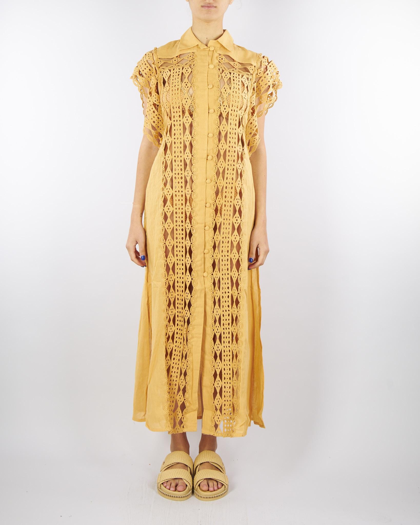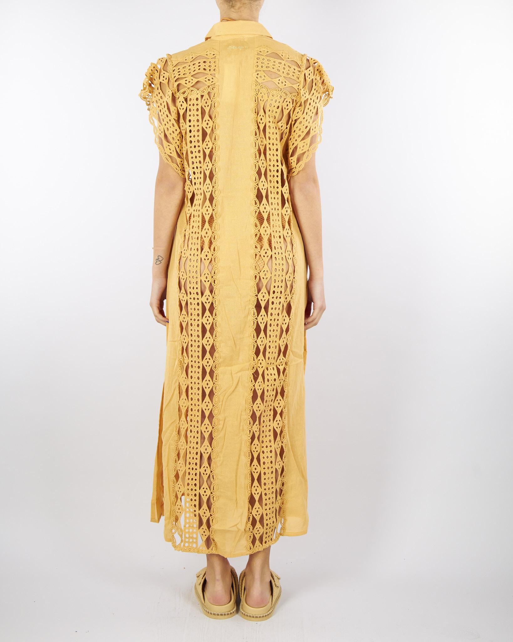 Abito lungo chemisier in cotone ricamato e bordi macramè. Profondi spacchi laterali, manica corta a farfalla e bottoncini ricoperti. Cintura non inclusa.
