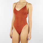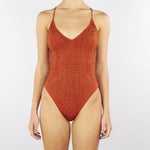 Costume intero con imbottitura estraibile. Il tessuto in lycra tinta unita si impreziosisce di una bellissima lavorazione di cristalli Swarovski che crea un disegno tribale ed esclusivo. I laccetti creano incroci sensuali sulla schiena. Raffinato ed elegante è facilmente abbinabile a un pareo nello stesso tessuto o in tulle per non passare inosservate. Utilizzabile anche come body.